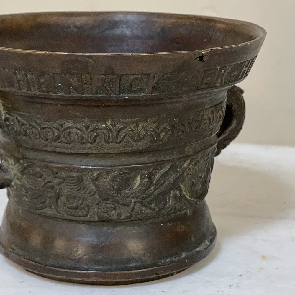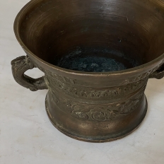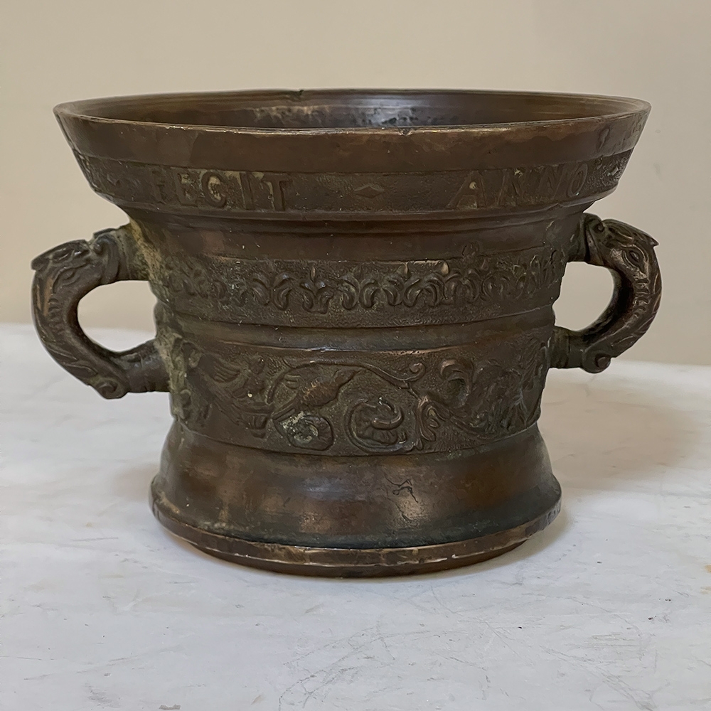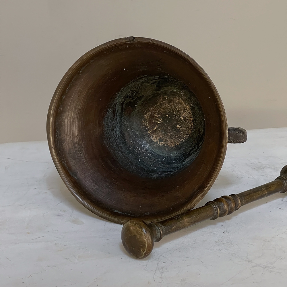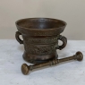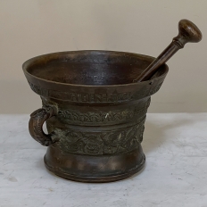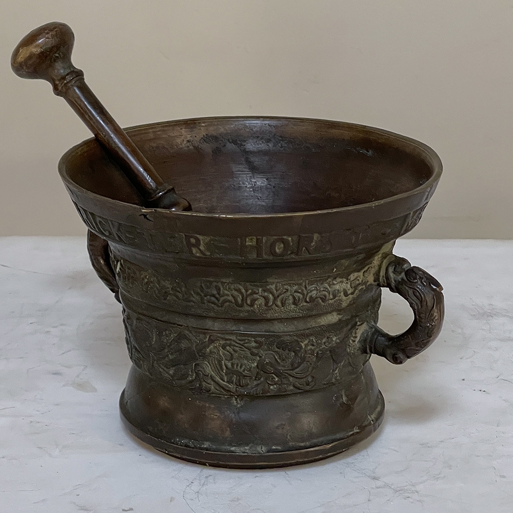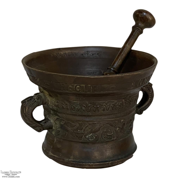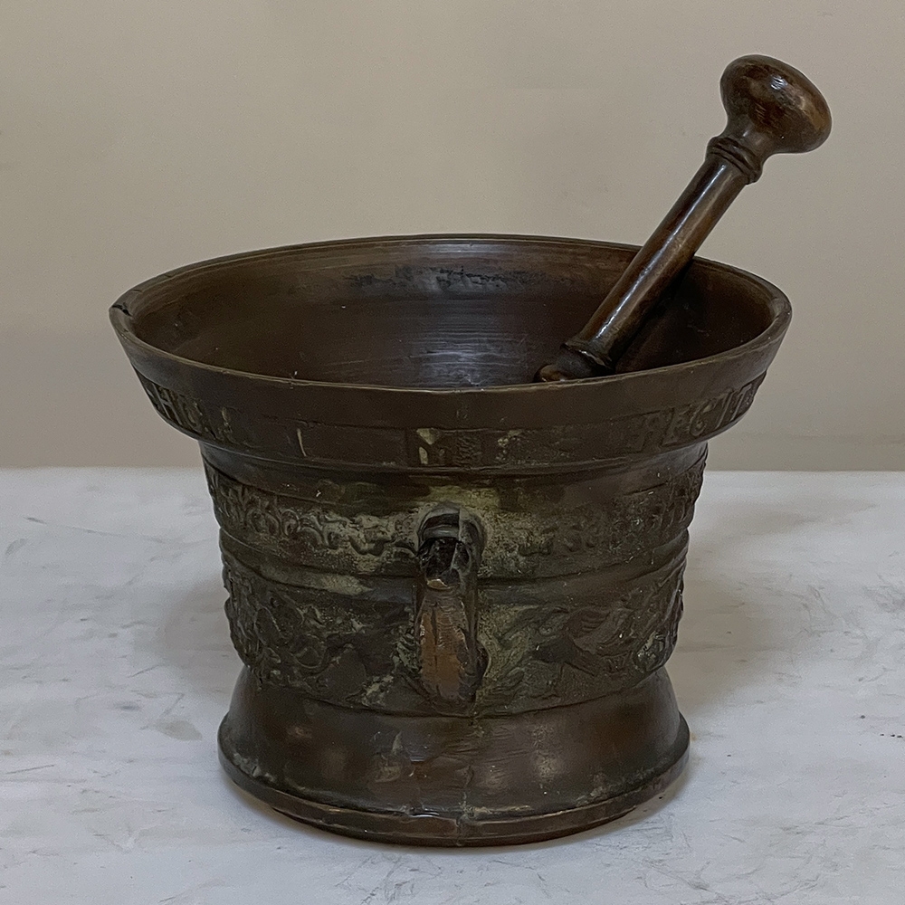 Antique Bronze Mortar & Pestle is a particularly intriguing artifact inspired by a bygone era! Although cast during the early half of the 20th century, it features a prominent commemorative date of 1607, undoubtedly significant to the person or group that had it produced. The originals were cast in the same foundries that produced cannons and other heavy bronze implements but were used primarily for pharmaceutical production, when ingredients were hand-blended and prepared in small batches, completely unlike today's robotic manufacturing factories.