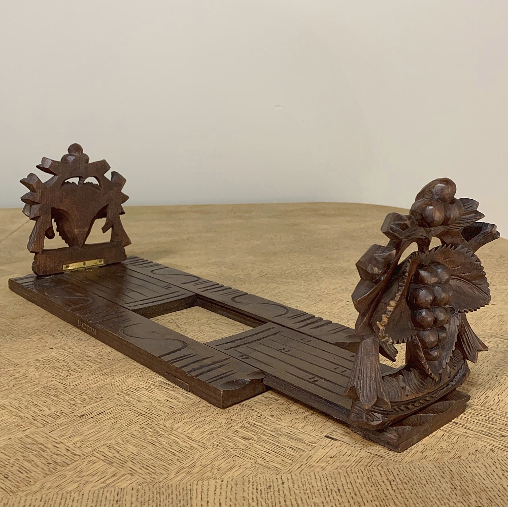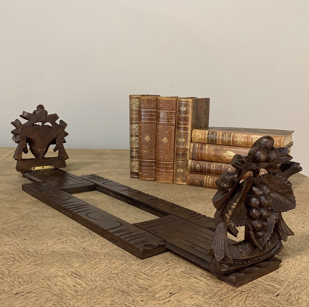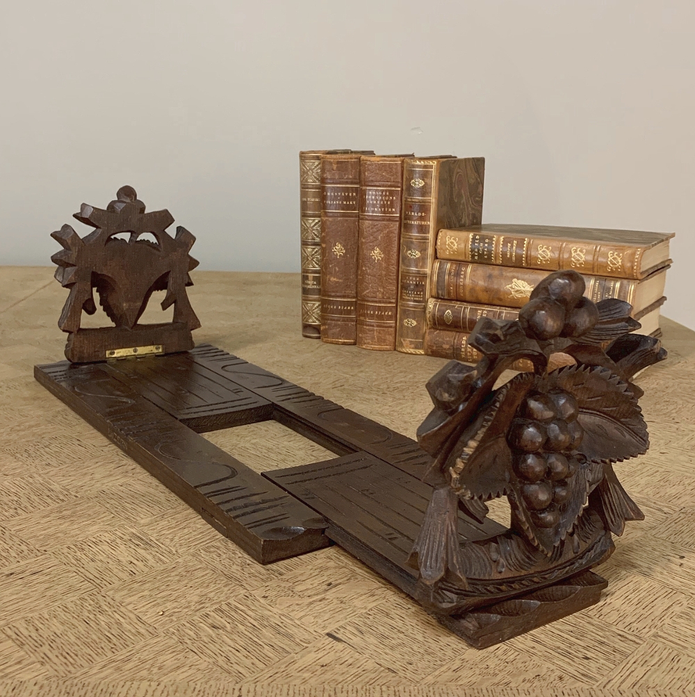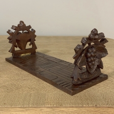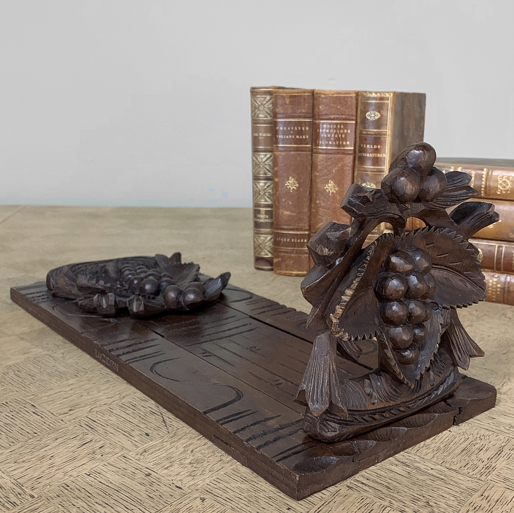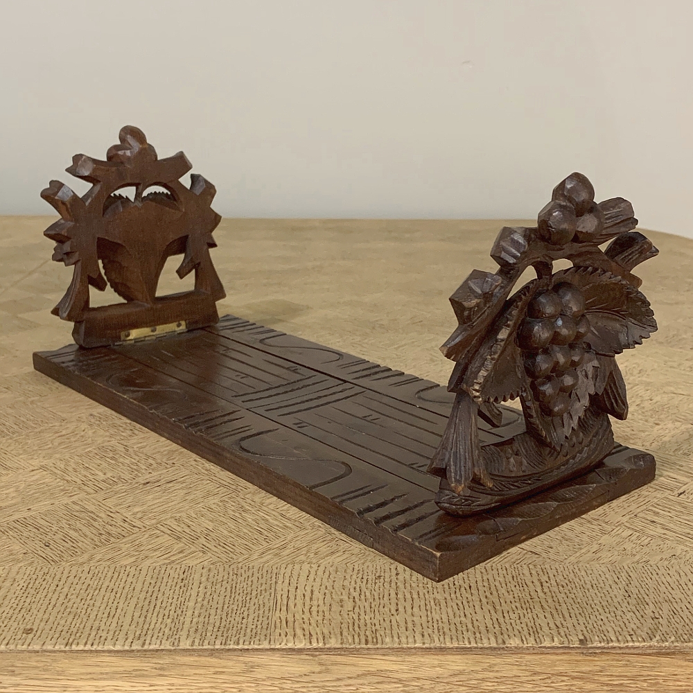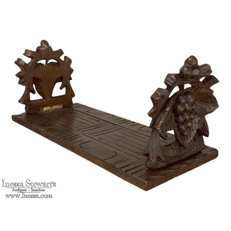 19th Century Hand Carved Swiss Desktop Bookends is a splendid way to keep books close at hand, and adjustable to whatever your current reading selection might entail! Hand-sculpted from old-growth sycamore, it features pierce-carved fully laden grapevine motifs on each end, hinged to drop down when not in use, and the platform upon which they are mounted is able to slide closed or open to accommodate a range of book widths. Ingenious and visually appealing at the same time! This wonderful work hails from Luzern, Switzerland.