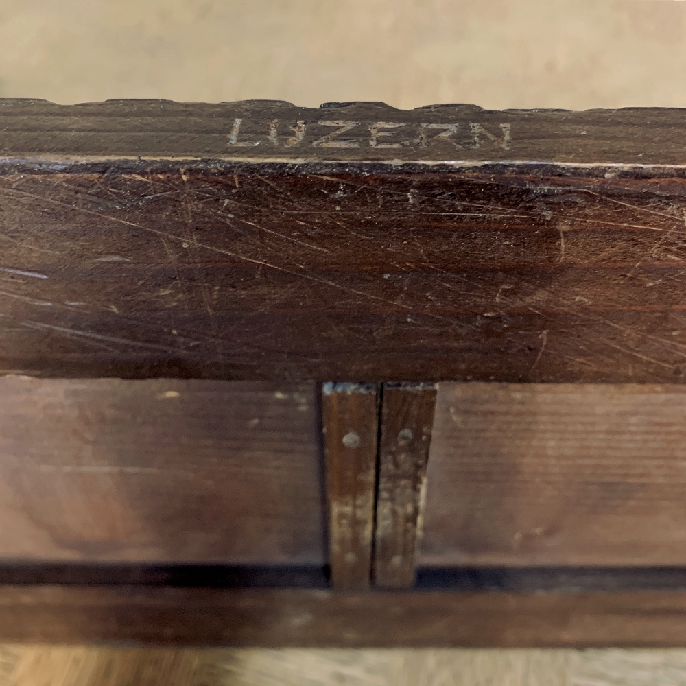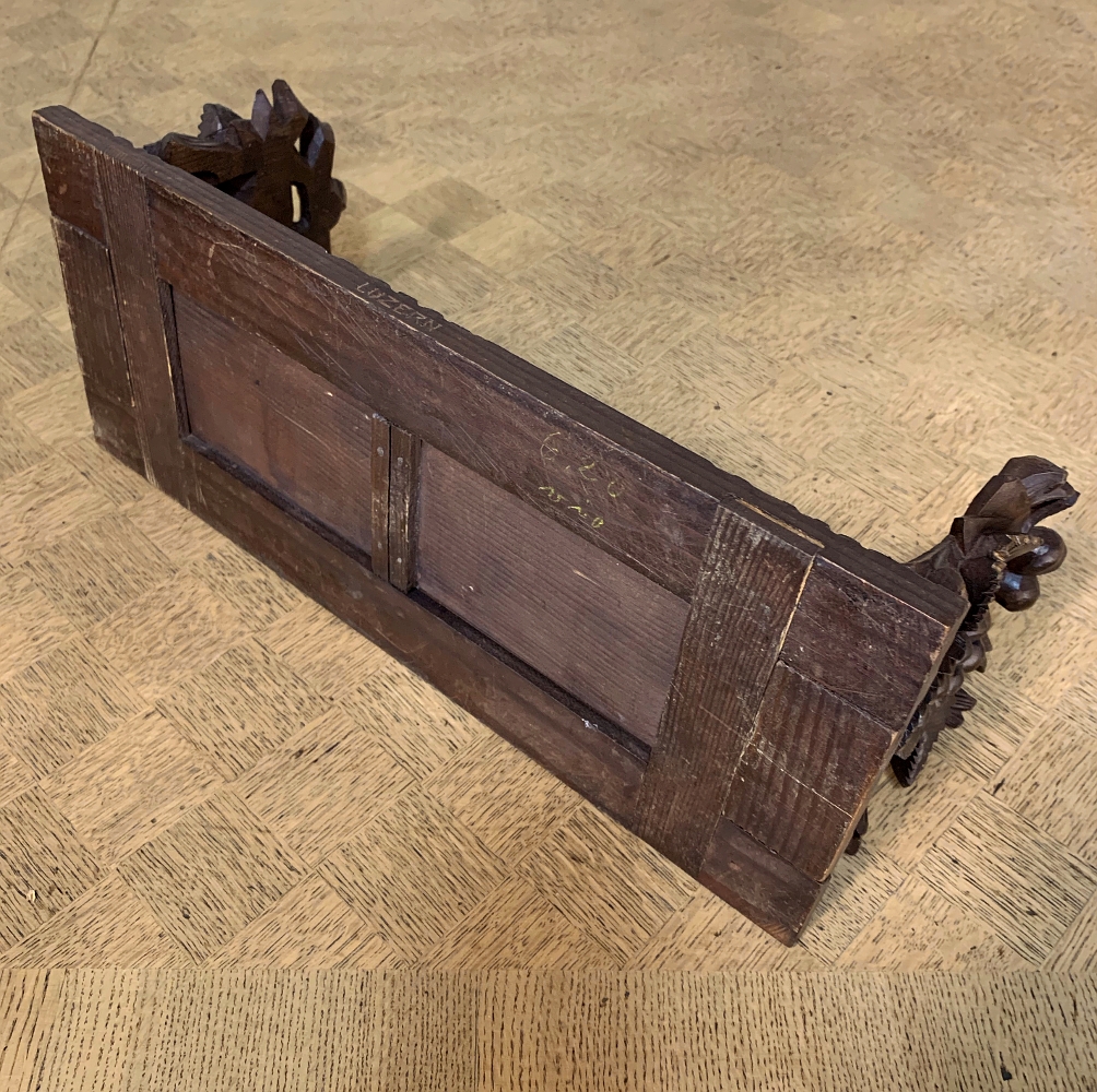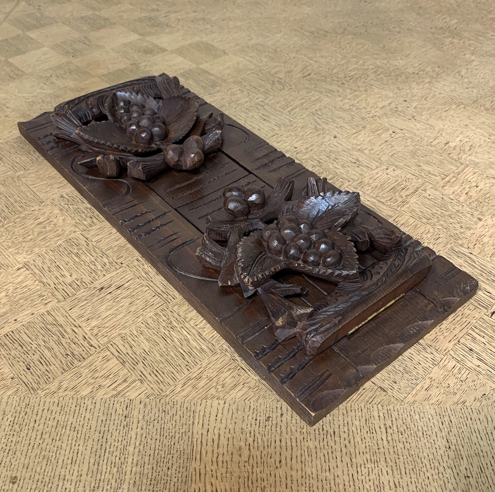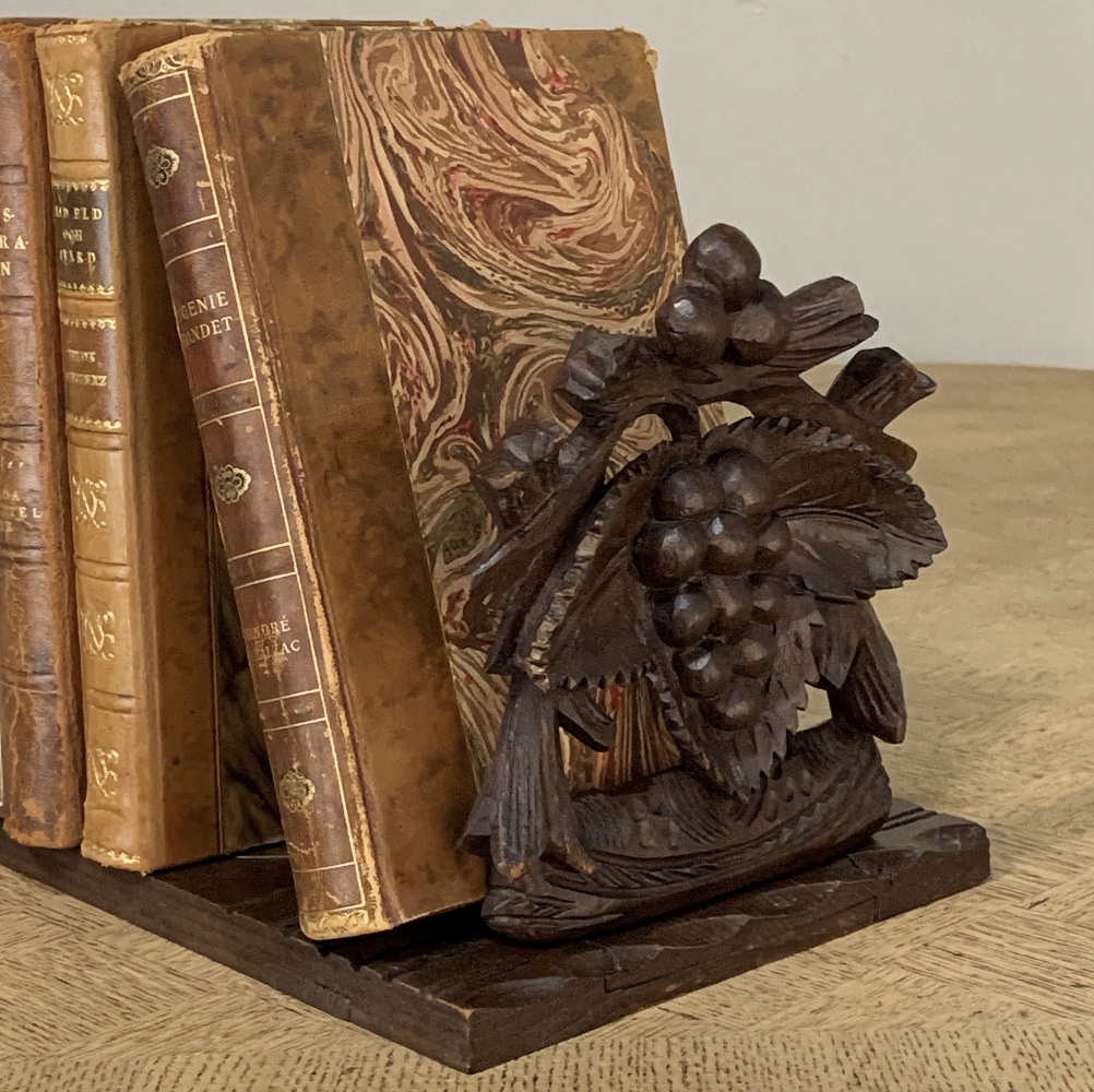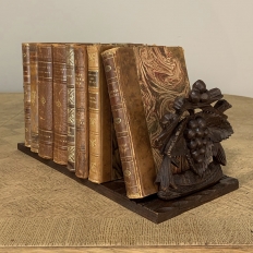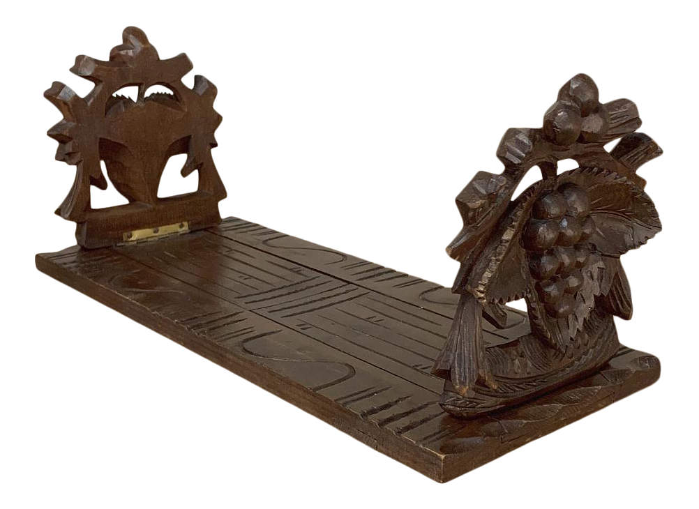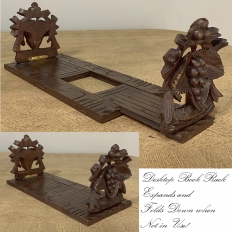 19th Century Hand Carved Swiss Desktop Bookends is a splendid way to keep books close at hand, and adjustable to whatever your current reading selection might entail! Hand-sculpted from old-growth sycamore, it features pierce-carved fully laden grapevine motifs on each end, hinged to drop down when not in use, and the platform upon which they are mounted is able to slide closed or open to accommodate a range of book widths. Ingenious and visually appealing at the same time! This wonderful work hails from Luzern, Switzerland.