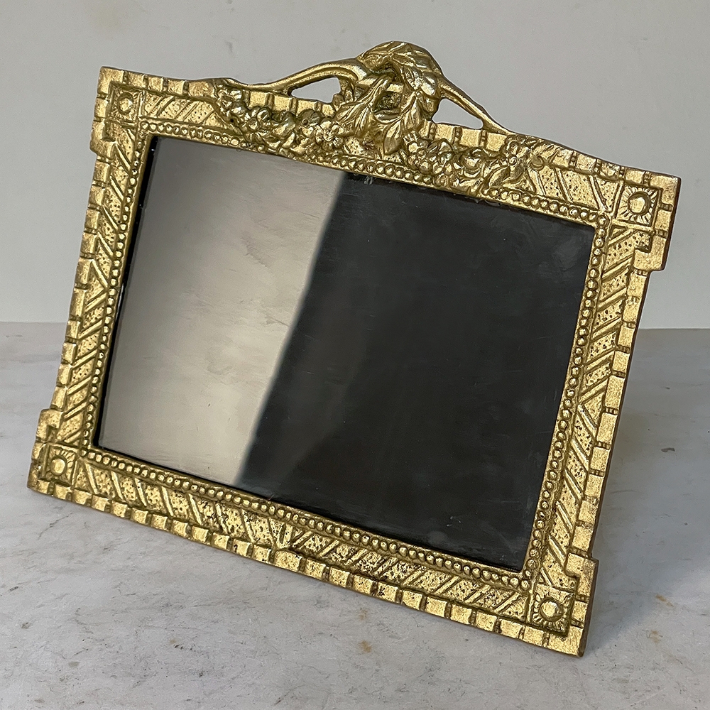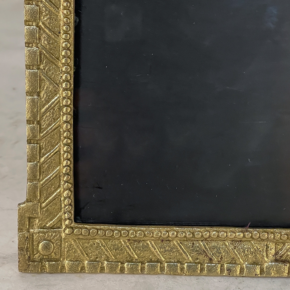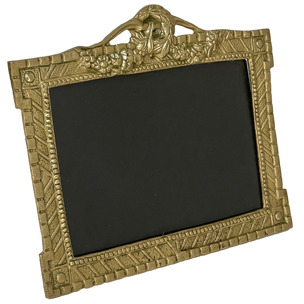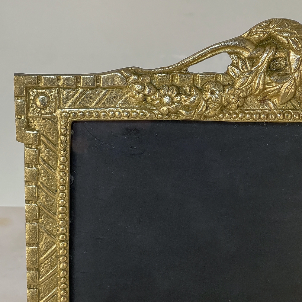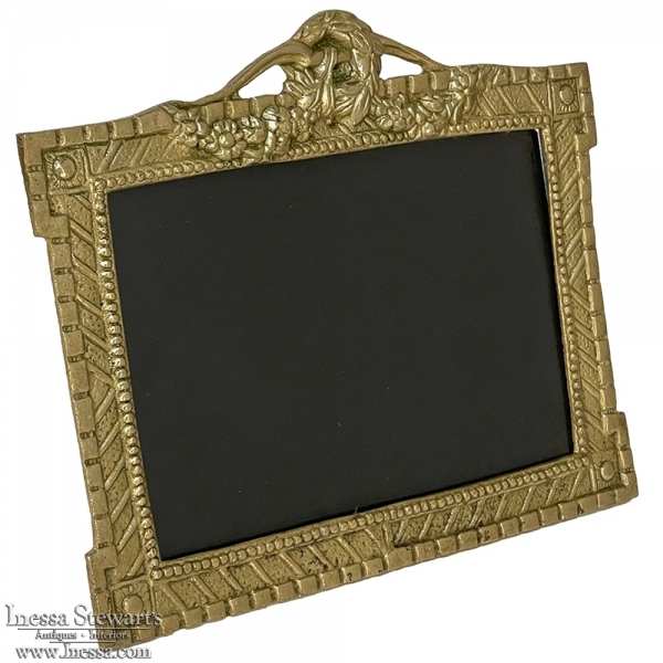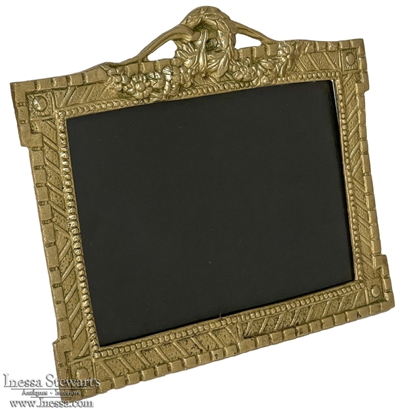 Antique French Louis XVI Cast Brass Picture Frame will make a unique way to display your cherished photograph or miniature, all with stylistic flair, of course! Frame is solid brass, with a solid brass stand that hinges in the back, so it could be hung on the wall but is more likely used on a desk, counter or display surface.