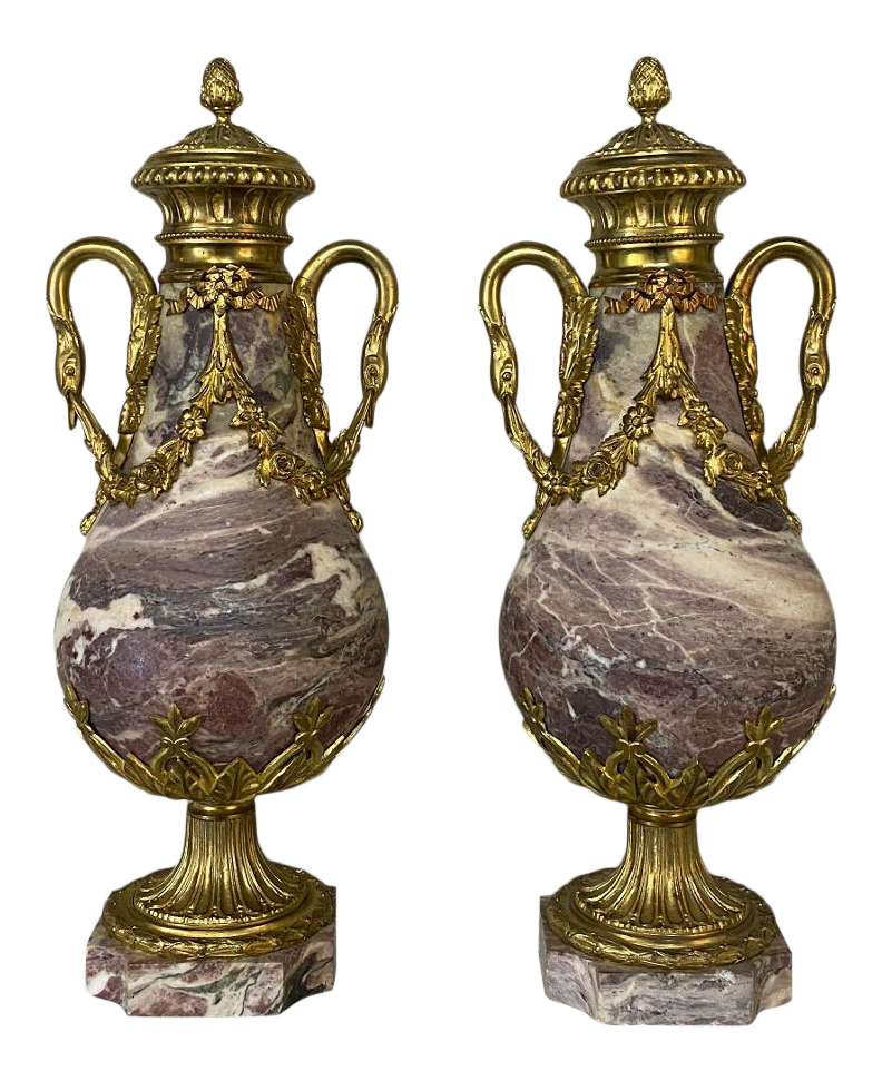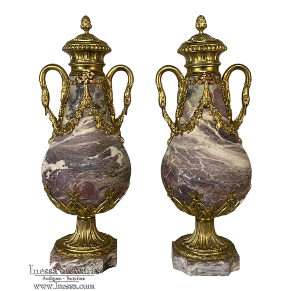 Pair 19th Century French Louis XVI Marble & Bronze Cassolettes represent the epitome of affluence! Hand-crafted from exquisitely veined marble and festooned with bronze mounts from the top to the base, such a pair was a sign of wealth and success and would be proudly displayed on a buffet or mantel in the main room of the home. The architecture is derived from ancient Greece and Rome, and the embellishments draw from classical themes such as floral swags, foliate bordering, ribbon and graceful swans serving as handles. The base features lotus petals in a fleur de lys pattern, a flared and detailed pediment set upon a contoured marble base.