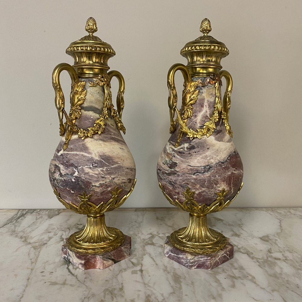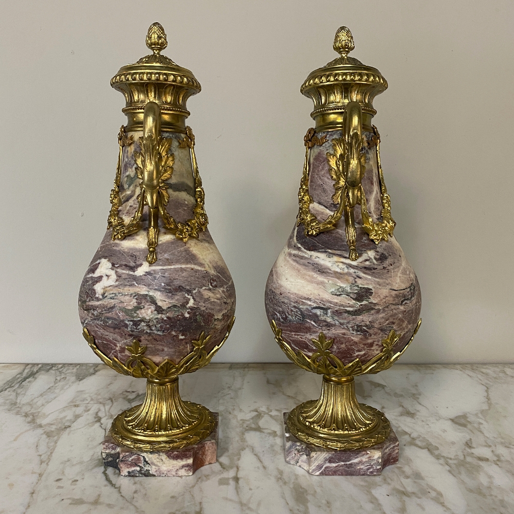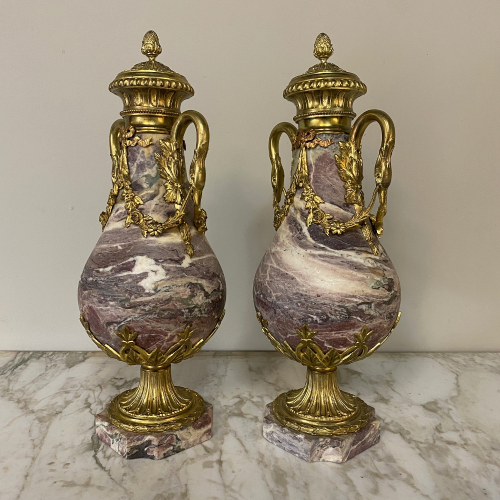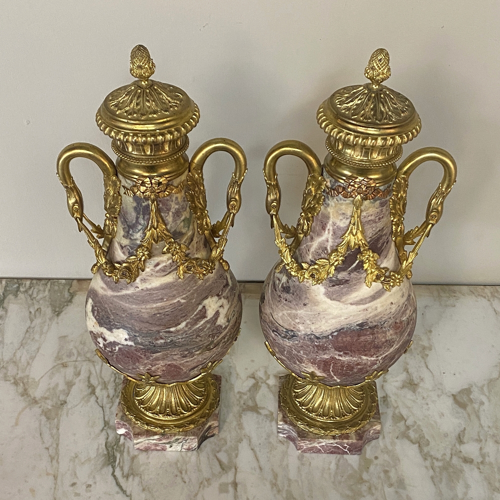 Pair 19th Century French Louis XVI Marble & Bronze Cassolettes represent the epitome of affluence! Hand-crafted from exquisitely veined marble and festooned with gilt bronze mounts from the top to the base, such a pair was a sign of wealth and success and would be proudly displayed on a buffet or mantel in the main room of the home. The architecture is derived from ancient Greece and Rome, and the embellishments draw from classical themes such as floral swags, foliate bordering, ribbon and graceful swans serving as handles. The base features lotus petals in a fleur de lys pattern, a flared and detailed pediment set upon a contoured marble base.