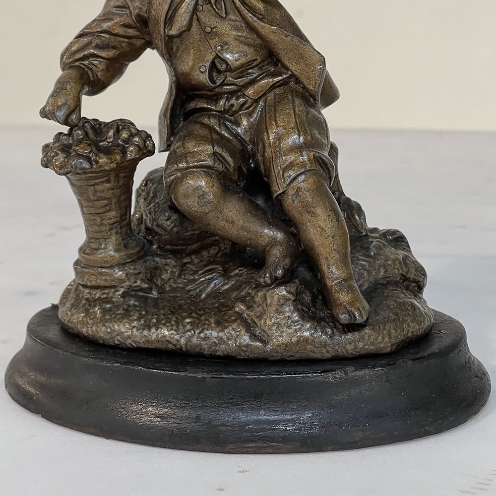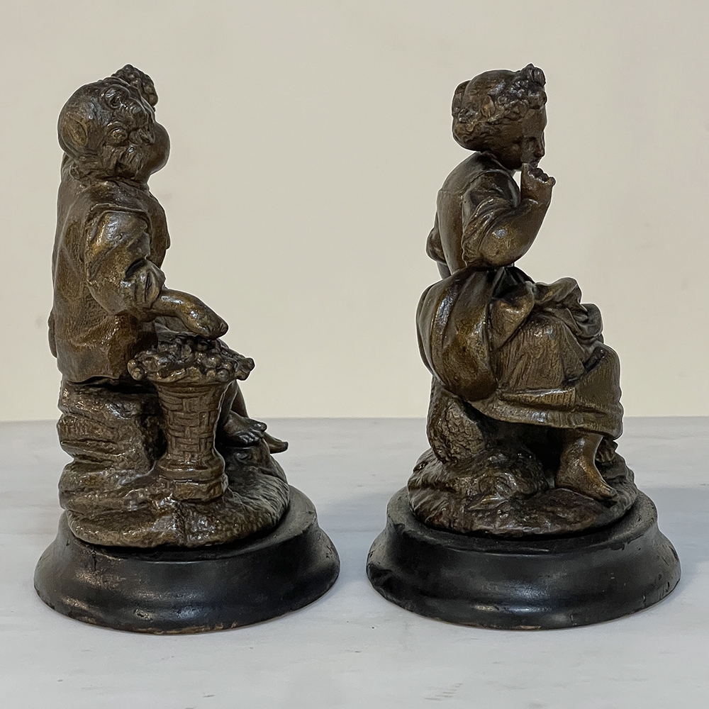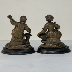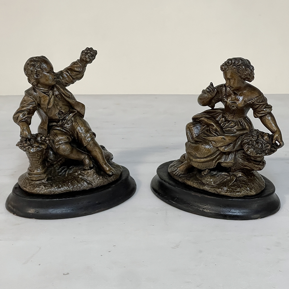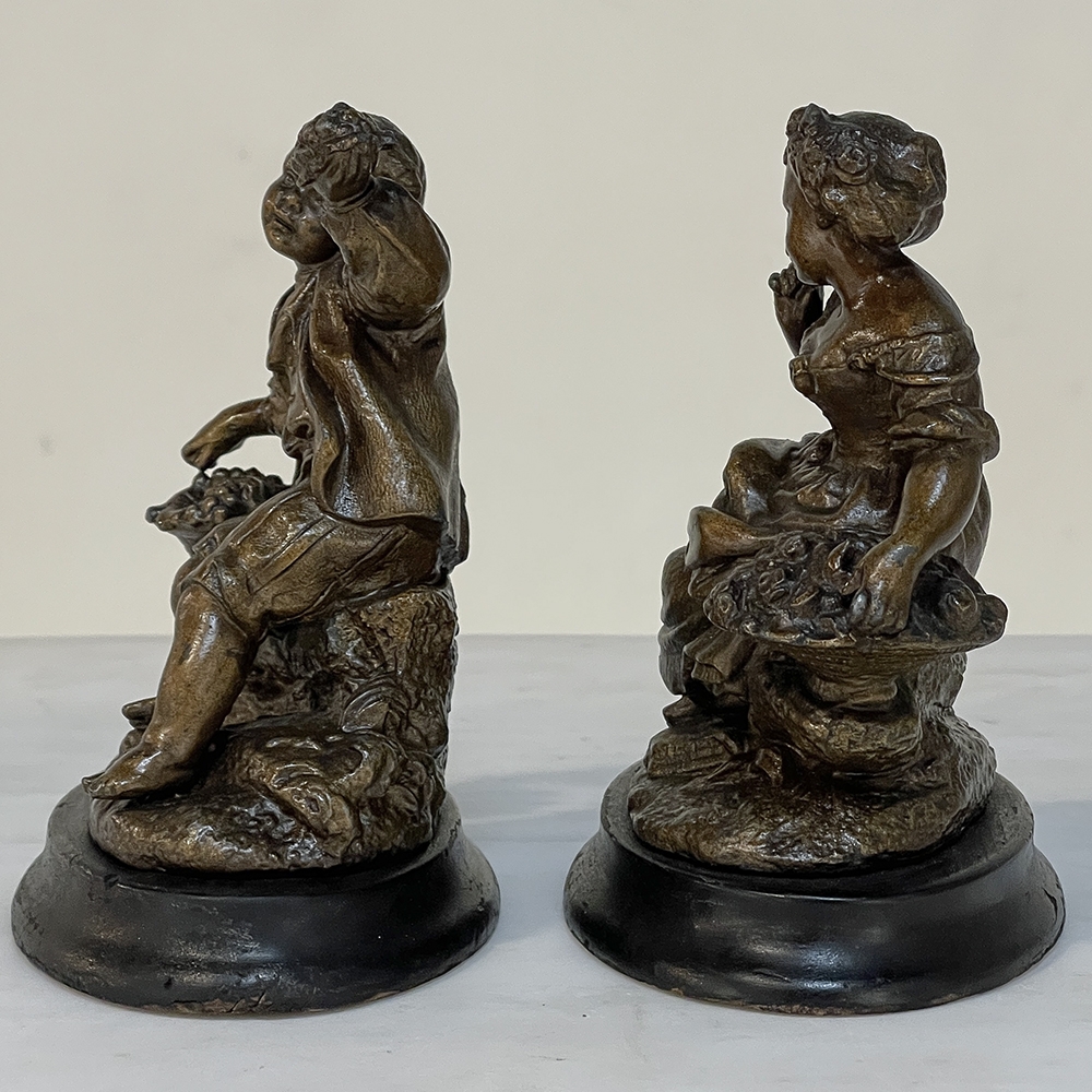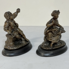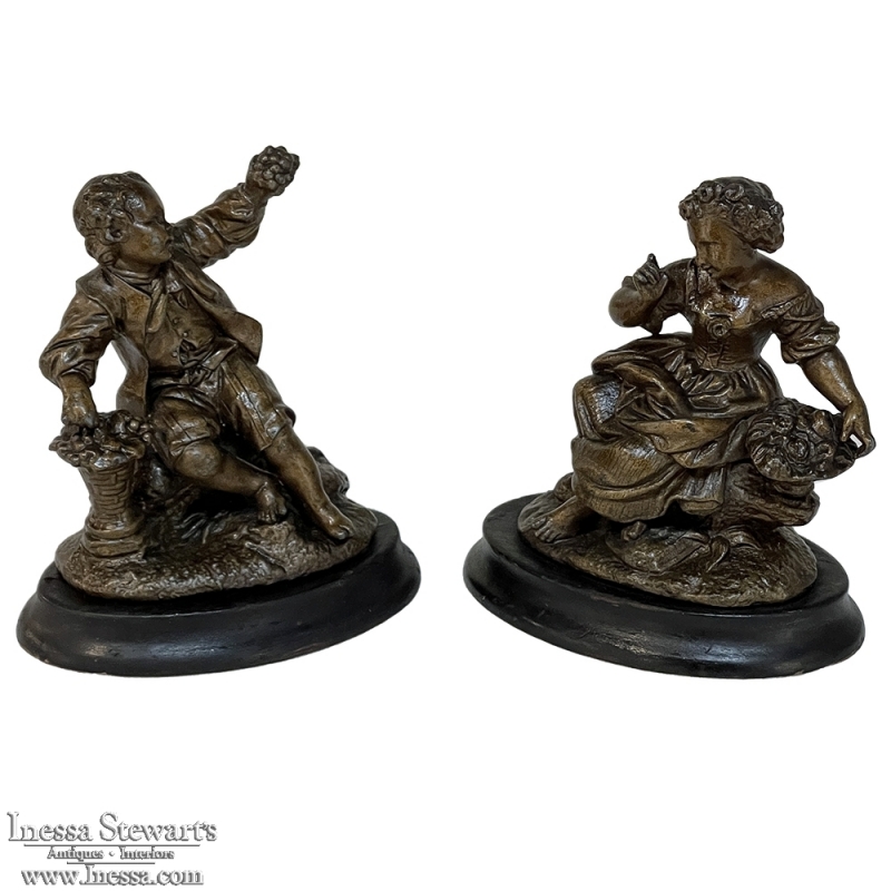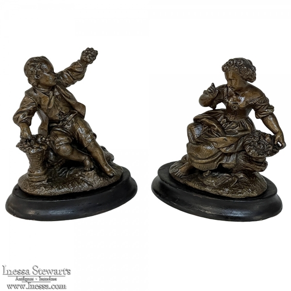 Pair 19th Century Petite Spelter Statues will make perfect Antique Bookends as well! Cast in spelter and given a patinaed bronze finish, then set on polished wooden bases, each depicts a courtier and fair maiden in romantic poses celebrating the grape harvest. Each is dressed in fine raiment ~ the epitome of Belle Epoque magnificence! The classical themes reimagined in Belle Epoque styling were a hallmark of the era, with decorative items such as this pair remaining popular even until today.