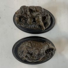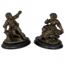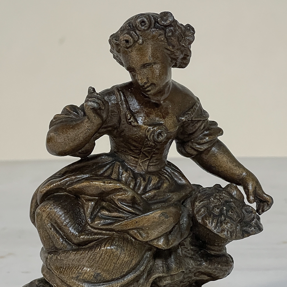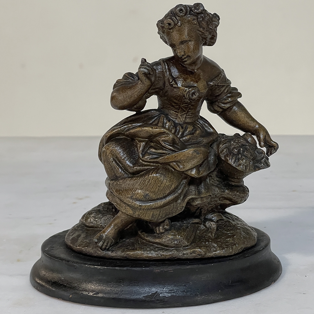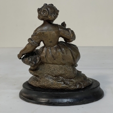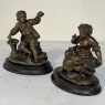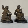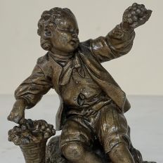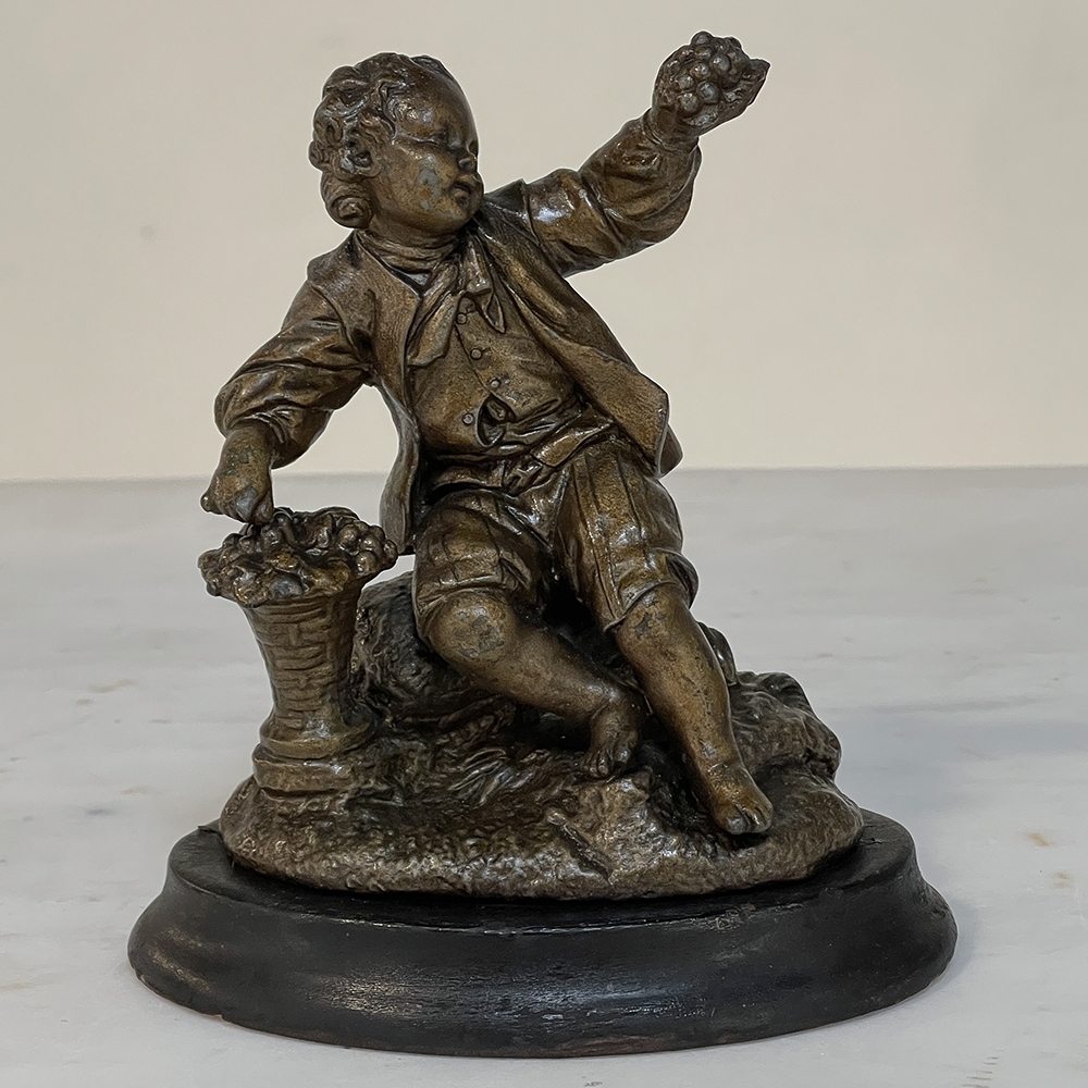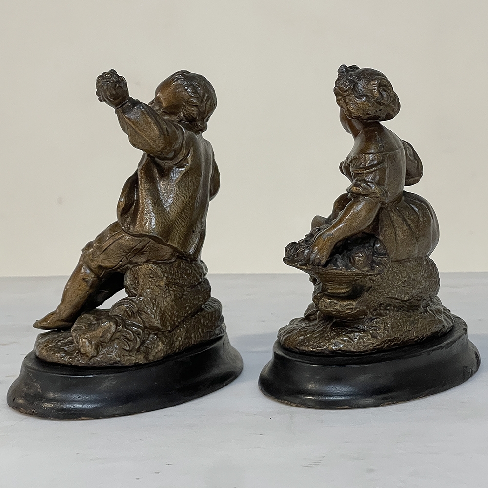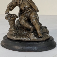 Pair 19th Century Petite Spelter Statues will make perfect Antique Bookends as well! Cast in spelter and given a patinaed bronze finish, then set on polished wooden bases, each depicts a courtier and fair maiden in romantic poses celebrating the grape harvest. Each is dressed in fine raiment ~ the epitome of Belle Epoque magnificence! The classical themes reimagined in Belle Epoque styling were a hallmark of the era, with decorative items such as this pair remaining popular even until today.