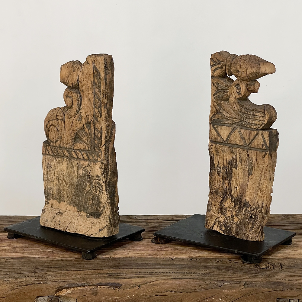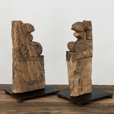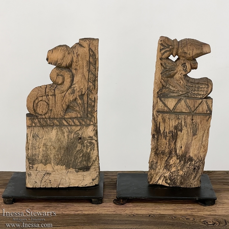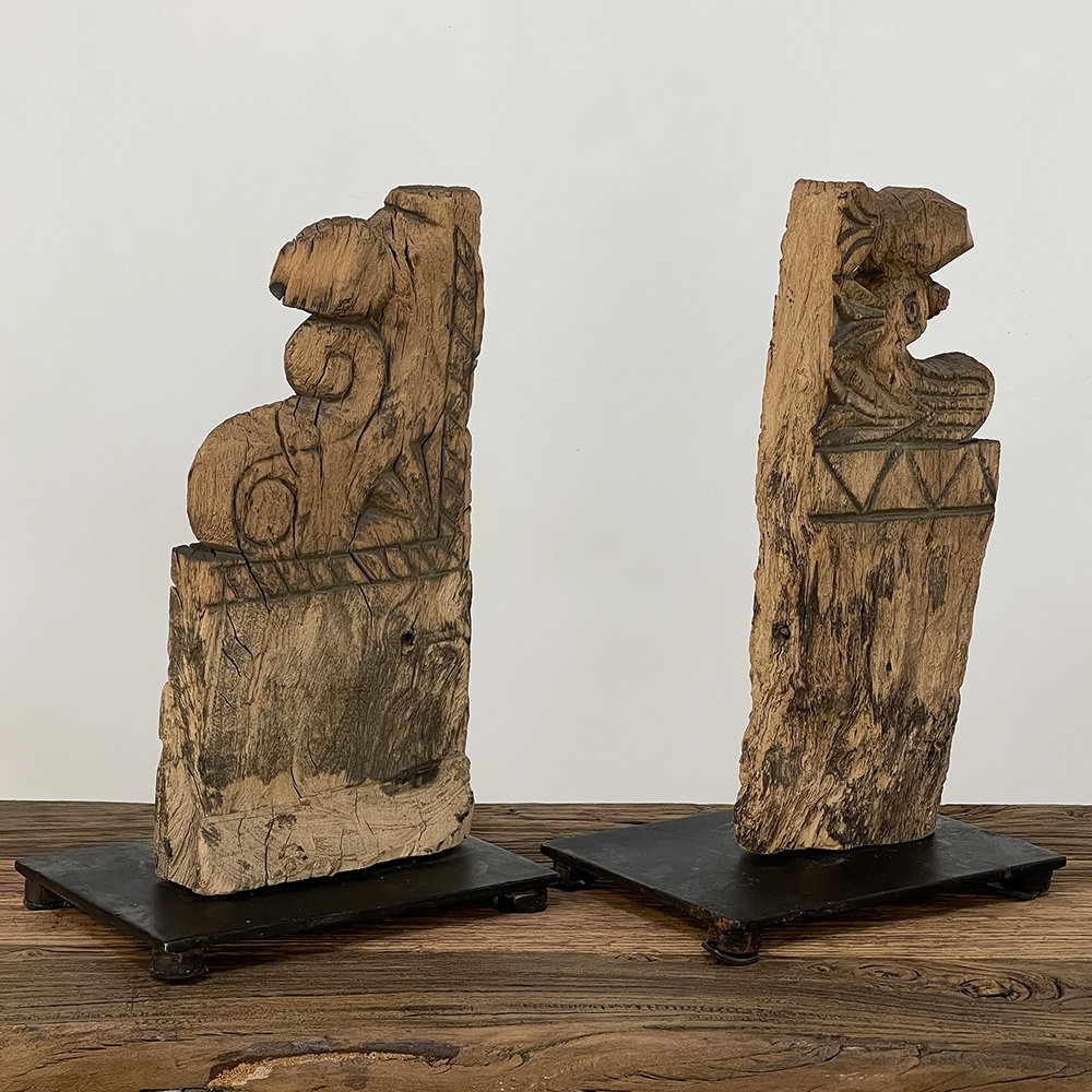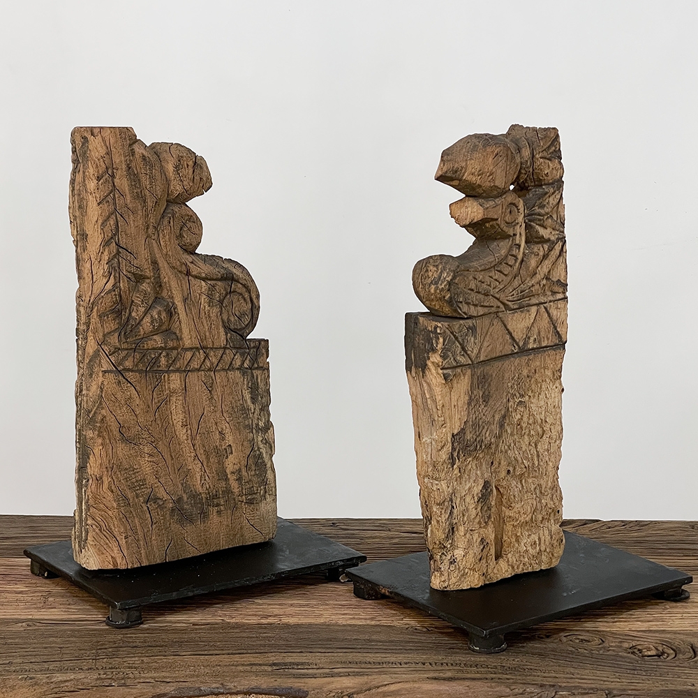 SalePair Antique Asian Architectural Artifacts on Iron Bases ~ Bookends will make excellent decorative accents, especially for the library! Old, weathered wood was hand-carved at least 200 years ago and just recently mounted to the footed iron plate bases to create the pair.