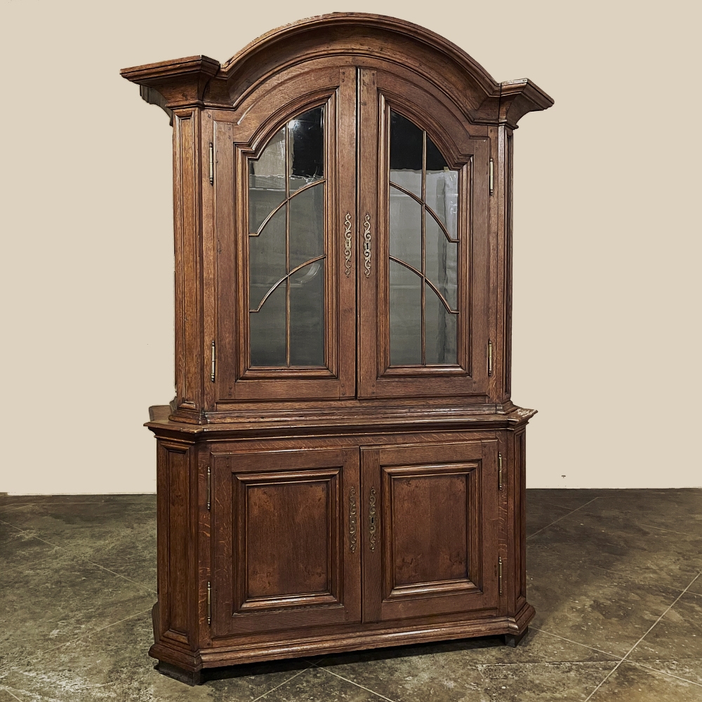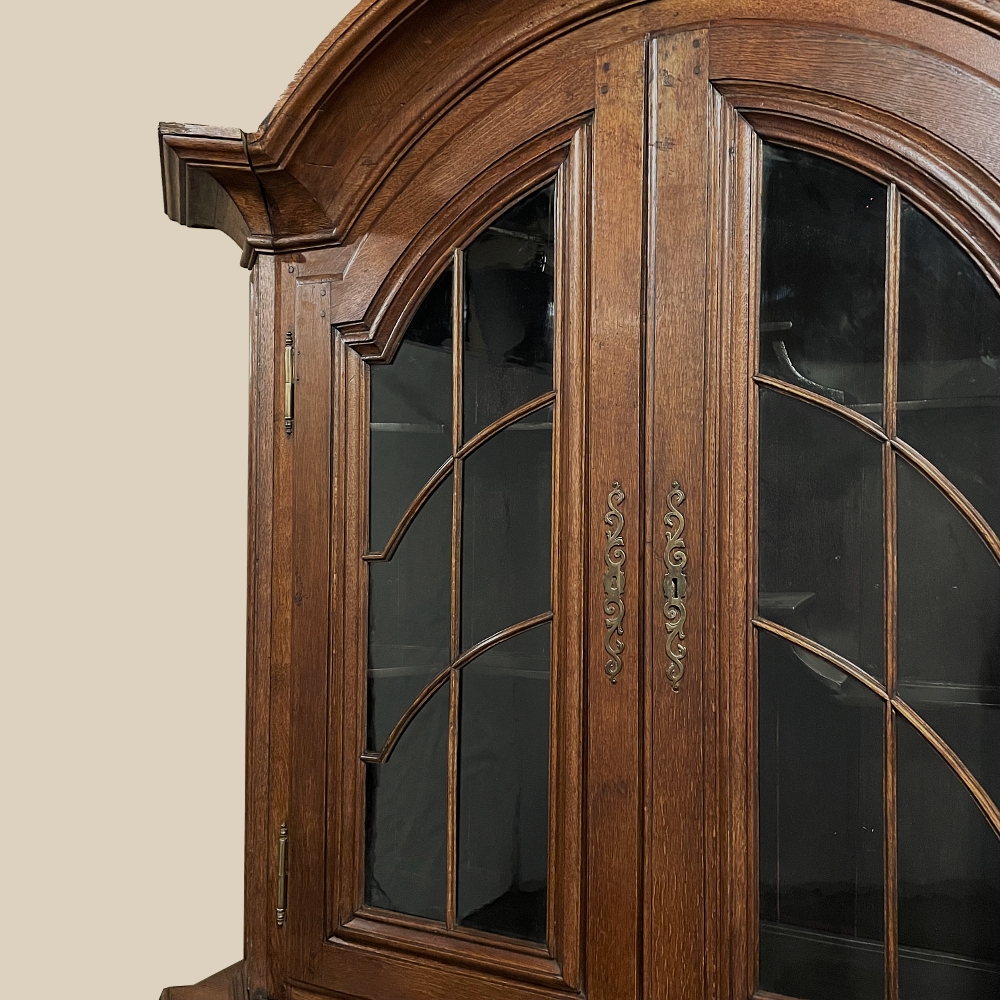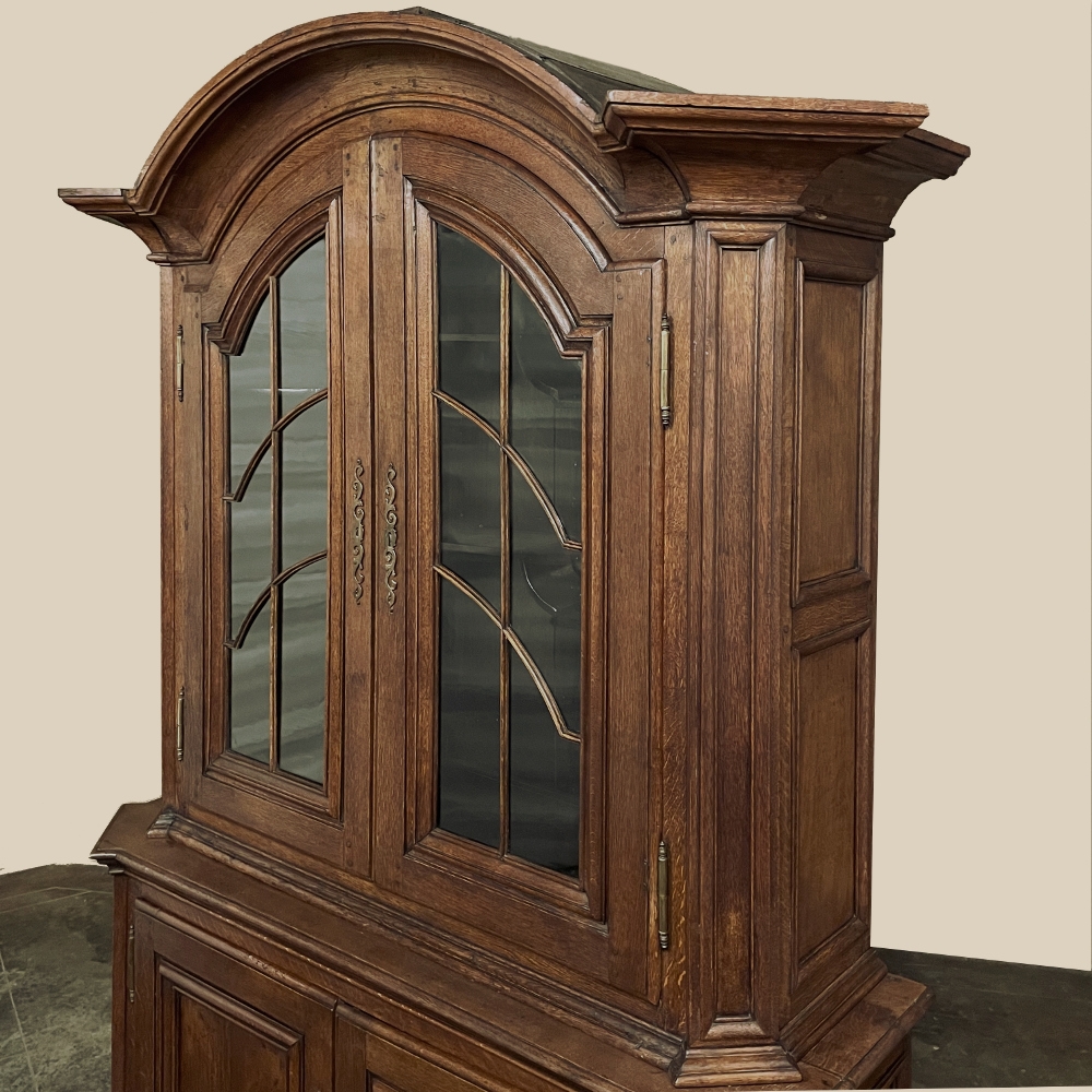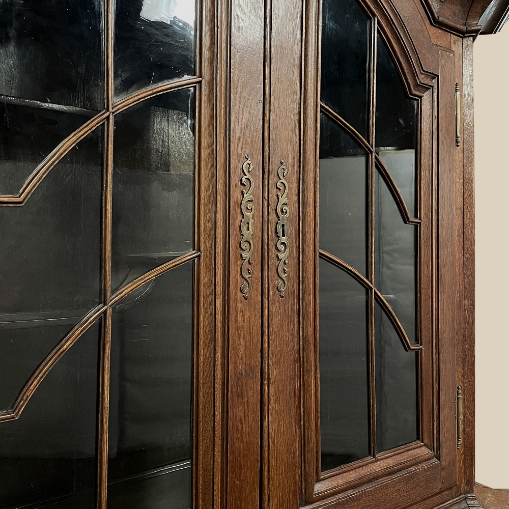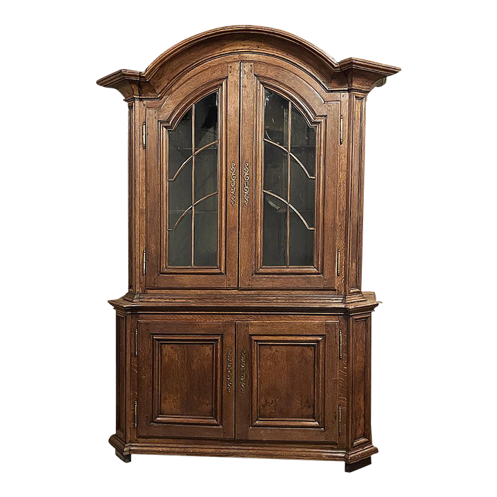 18th Century Dutch Bookcase ~ China Cabinet ~ China Cabinet was designed to command the room, plus house and display all a family's cherished keepsakes or books, with copious storage in the stepped-out cabinet below. The design, although almost two feet in total depth, reduces the traffic impact in the room with mitered corners, a feature that continues in the recessed upper tier for continuity. The corners are even outfitted with molded recessed panels to match the cabinet doors in the front as well as the upper and lower side panels. Bold molding on the base, a molding tier separating the top and bottom sections, and a magnificent arched crown with projecting corners cut at 45 degrees off the facade for visual intrigue, all combine to define the cabinetry as one produced by master artisans. The two upper doors are glazed with six panes each, with the tops of each pane matching the curvature of the crown above. Outboard brass barrel hinges above and below ensure all doors open wide for easy access, accented by the curvaceous brass key guards. The upper tier also has a stepped shelf pattern so that one can emphasize a particular book or keepsake at the center. Note the double pegged mortise & tenon joints used throughout the work, ensuring that this instant family heirloom piece will bring smiles for generations to come!
