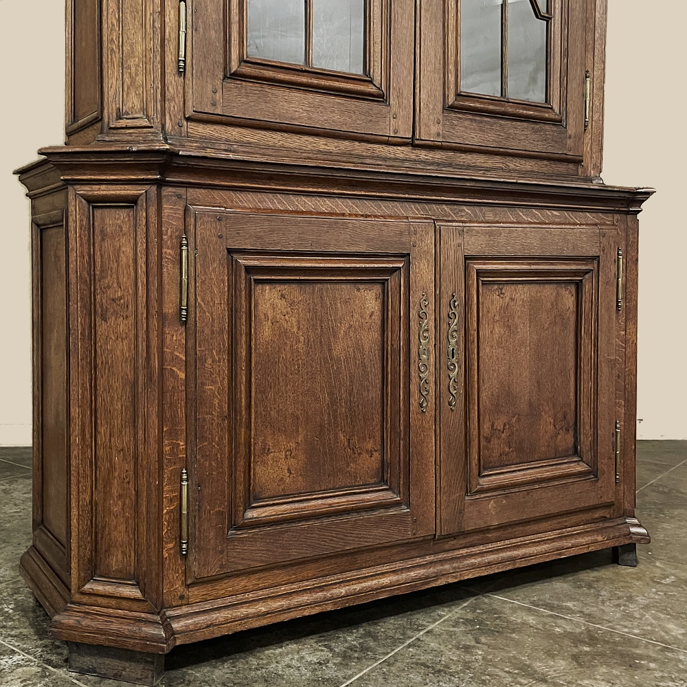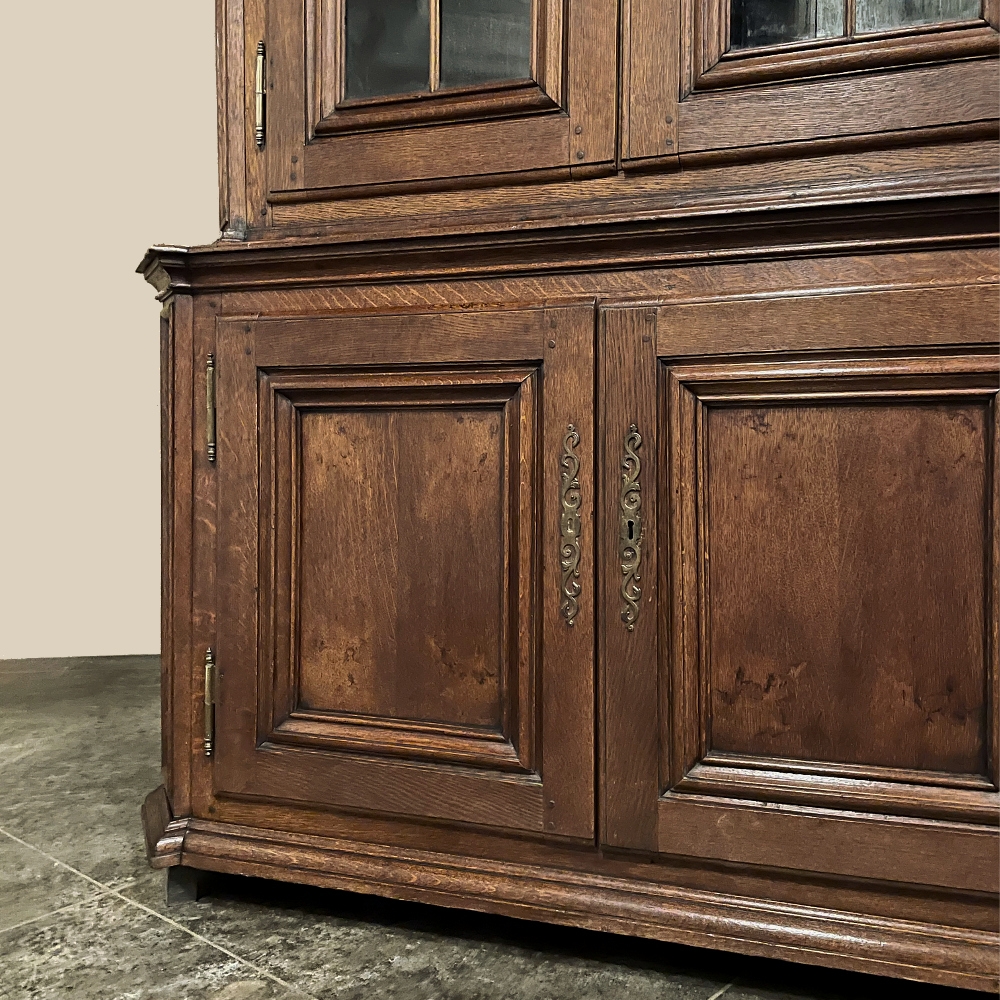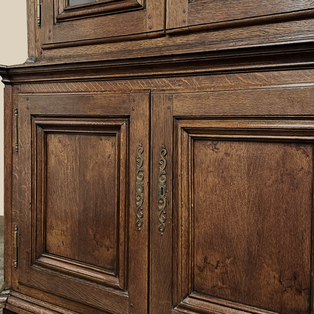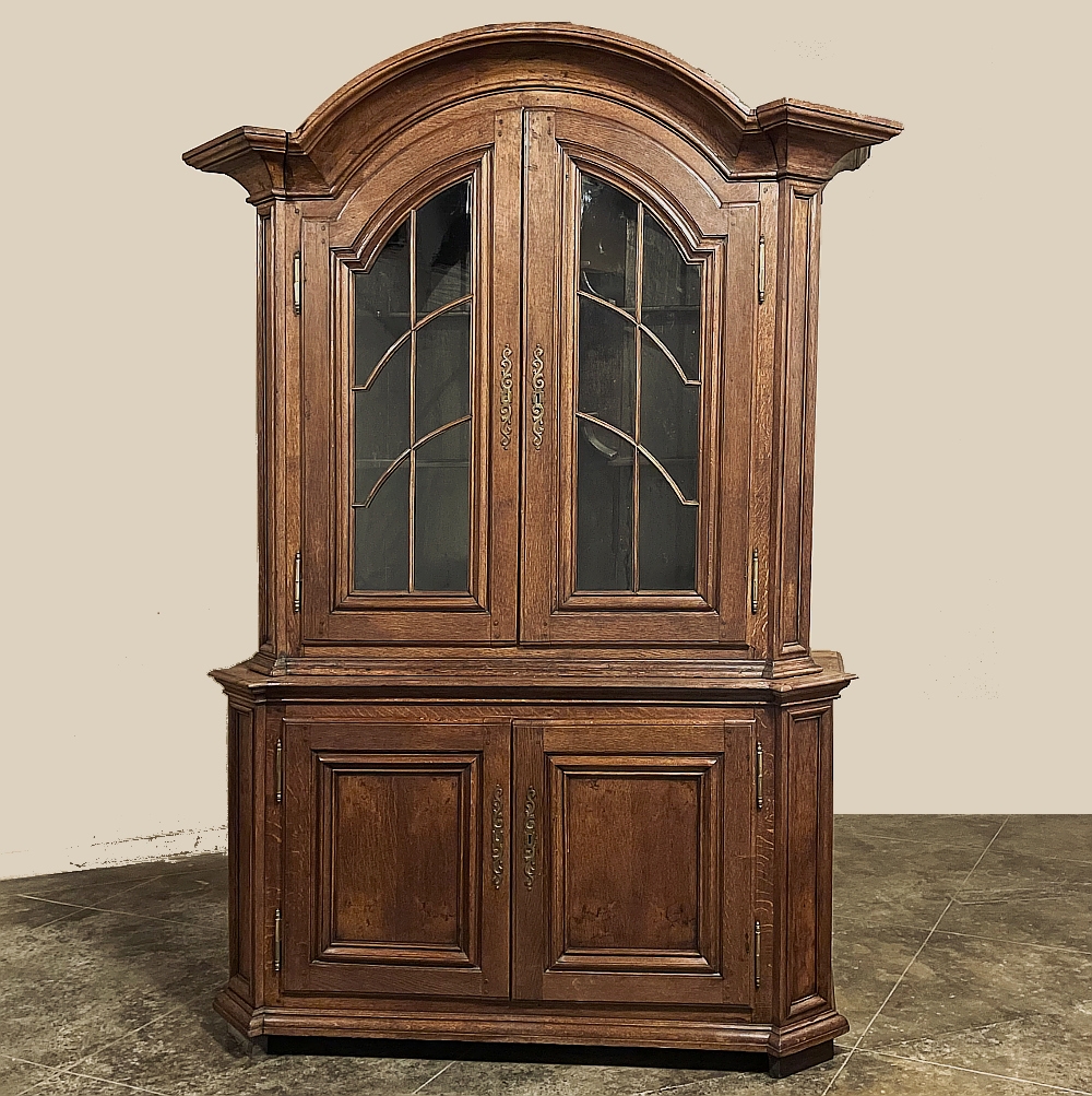 18th Century Dutch Bookcase ~ China Cabinet ~ China Cabinet was designed to command the room, plus house and display all a family's cherished keepsakes or books, with copious storage in the stepped-out cabinet below. The design, although almost two feet in total depth, reduces the traffic impact in the room with mitered corners, a feature that continues in the recessed upper tier for continuity. The corners are even outfitted with molded recessed panels to match the cabinet doors in the front as well as the upper and lower side panels. Bold molding on the base, a molding tier separating the top and bottom sections, and a magnificent arched crown with projecting corners cut at 45 degrees off the facade for visual intrigue, all combine to define the cabinetry as one produced by master artisans. The two upper doors are glazed with six panes each, with the tops of each pane matching the curvature of the crown above. Outboard brass barrel hinges above and below ensure all doors open wide for easy access, accented by the curvaceous brass key guards. The upper tier also has a stepped shelf pattern so that one can emphasize a particular book or keepsake at the center. Note the double pegged mortise & tenon joints used throughout the work, ensuring that this instant family heirloom piece will bring smiles for generations to come!
