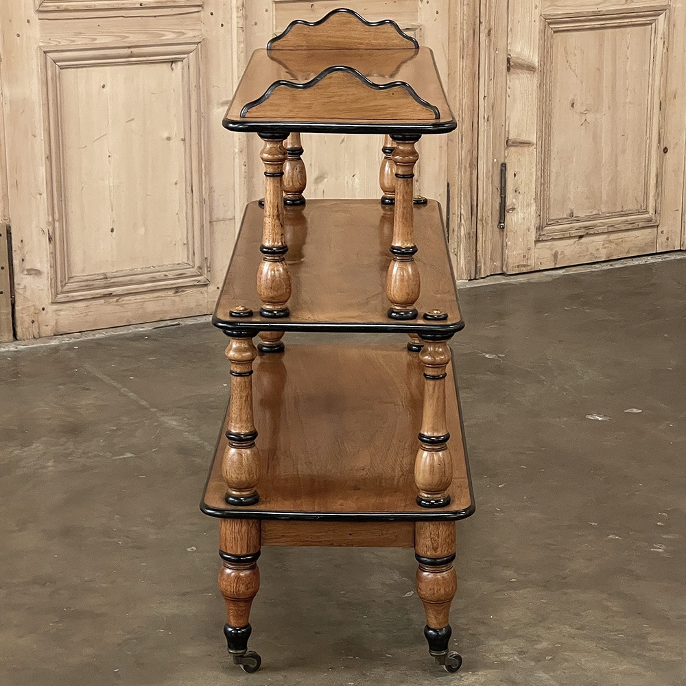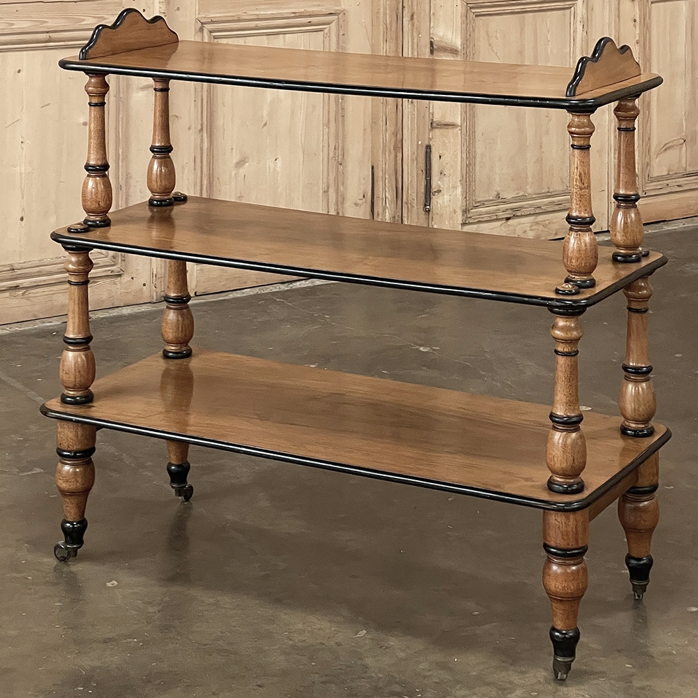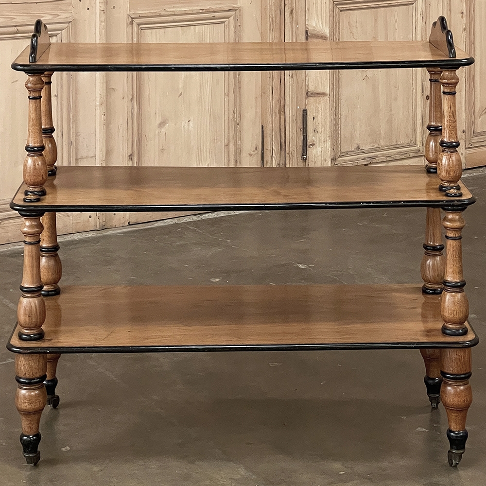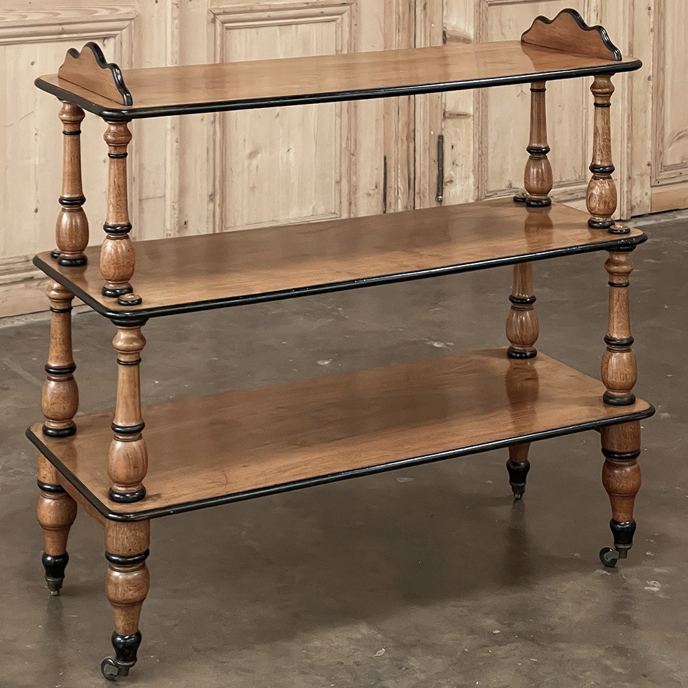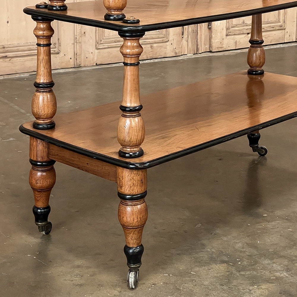 The shallow depth and tiered design make it exceptionally functional without overwhelming a room. Three open shelves are supported by beautifully turned solid wood baluster columns, lending rhythm and architectural balance to the piece. The warm tone of the wood—most likely maple or fruitwood rather than true satinwood—glows softly beneath its finish, complemented by crisp ebonized trim that outlines each shelf with refined contrast.