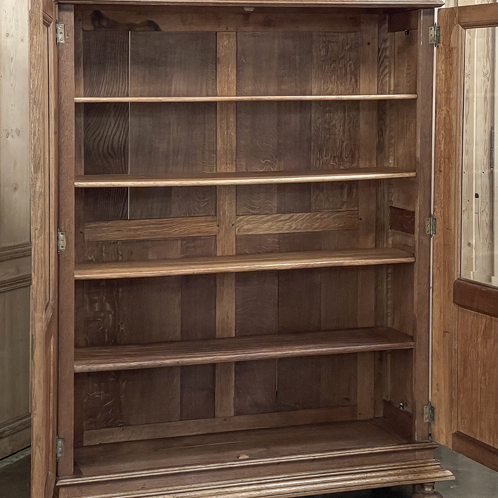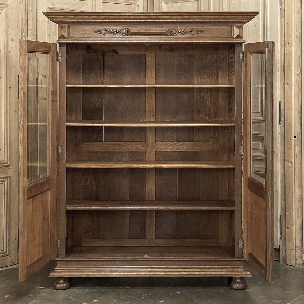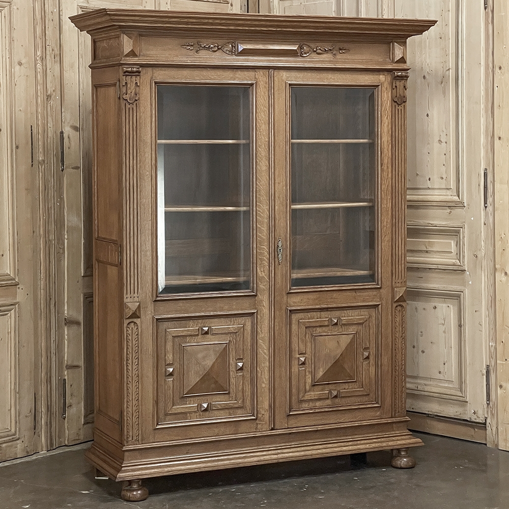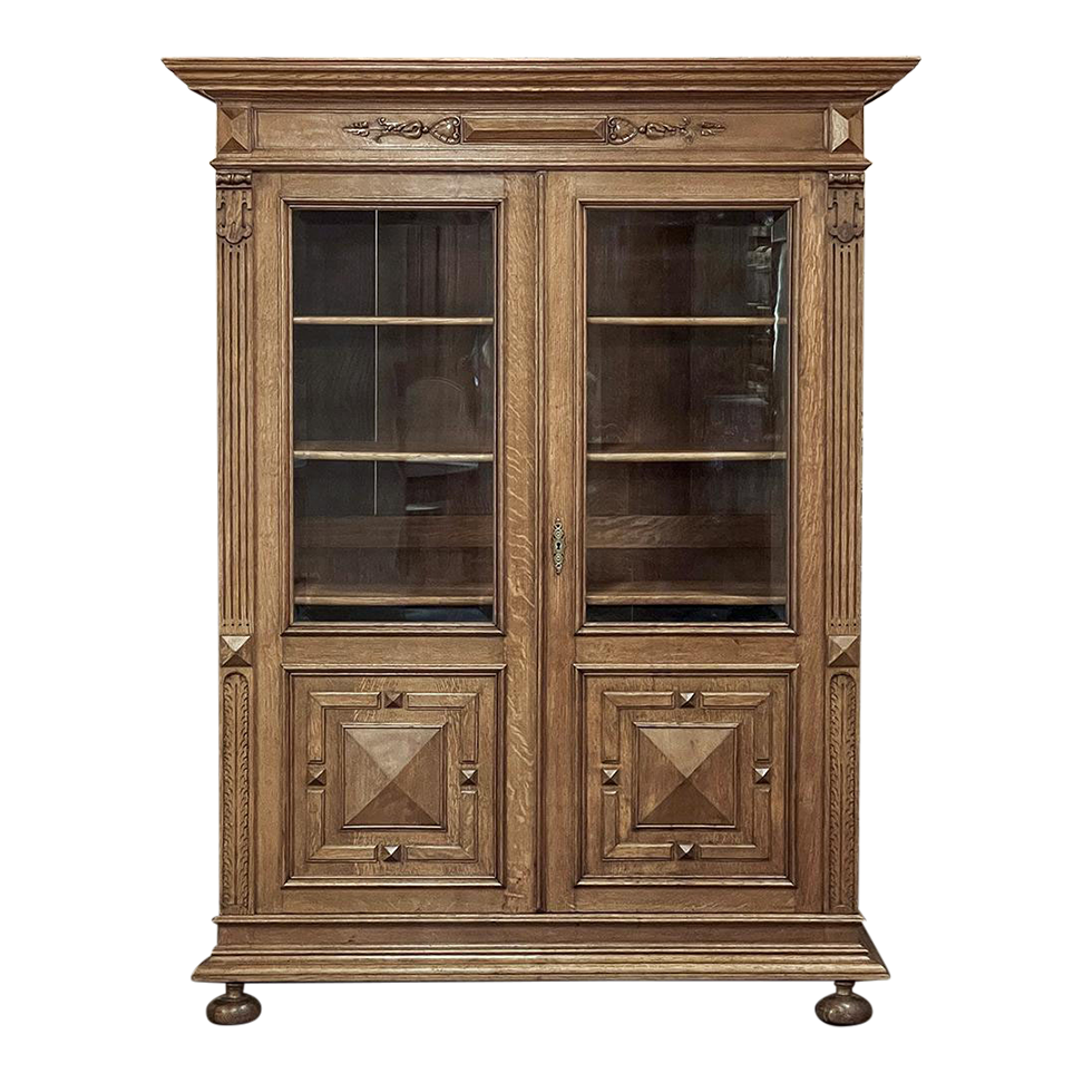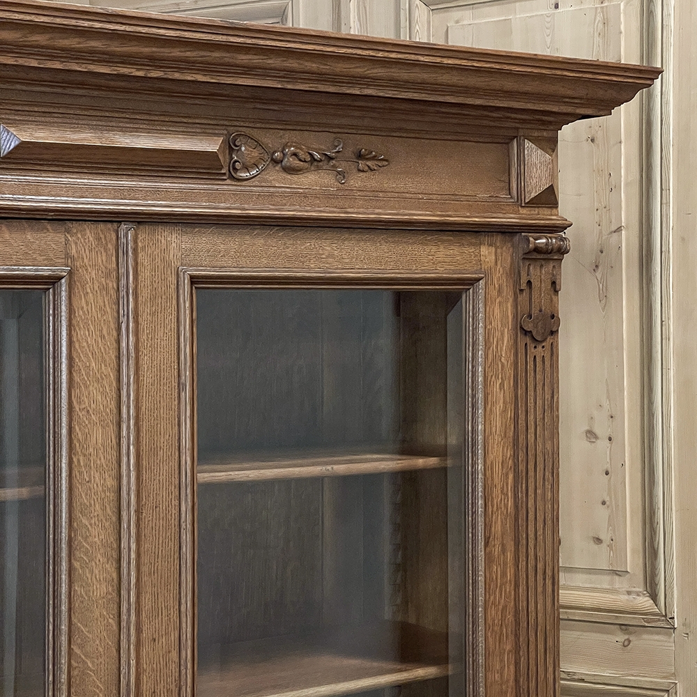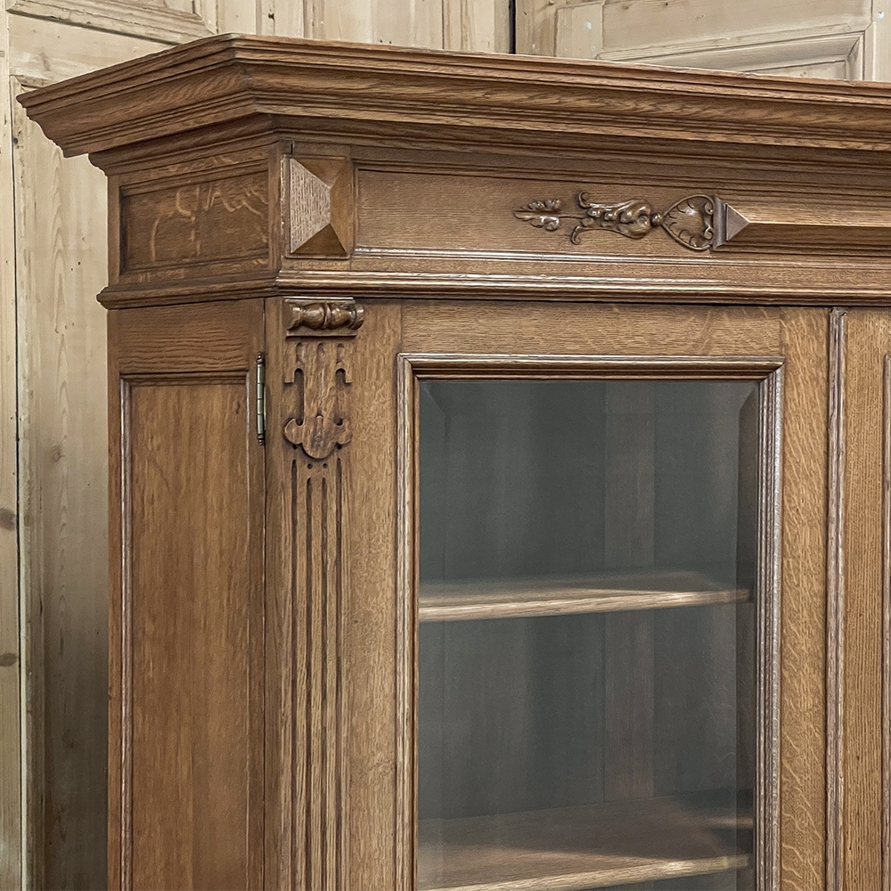 19th Century Flemish Neoclassical Bookcase boasts a tailored look with very subtle style enhancements inspired by ancient architecture. A bold multi-tiered crown overlooks the bonnet which features an elongated pyramidal block at the center flanked by shell and foliate carvings in bas relief, which in turn are flanked on each corner with another brace of pyramidal blocks. A tier of molding separates the bonnet from the casework below, flanked by fluted corner posts topped with elegant corbel forms. Each cabinet door consists of an upper beveled glass pane and a lower framed panel adorned with a large pyramidal block at the center and four more positioned in the surrounding border, with the entire work framed again to match the framework of the beveled glass above. The cornerposts at the height of the lower door panels feature fletching motif carved right into the wood itself, leading the eye down to the boldly executed multi-tiered base set up with half-bun feet. Even the side panels are finely framed providing visual appeal no matter the viewing angle. Doors are mounted on external hinges allowing wide opening for easy access to the four original adjustable shelves and floor surface, providing an almost unlimited configuration to store and display your books, prized possessions, family memorabilia or cherished collection. Hand-crafted from dense, quarter sawn oak to last for generations!