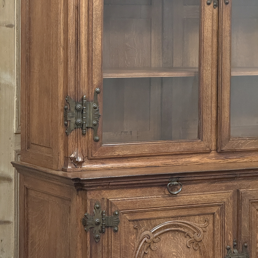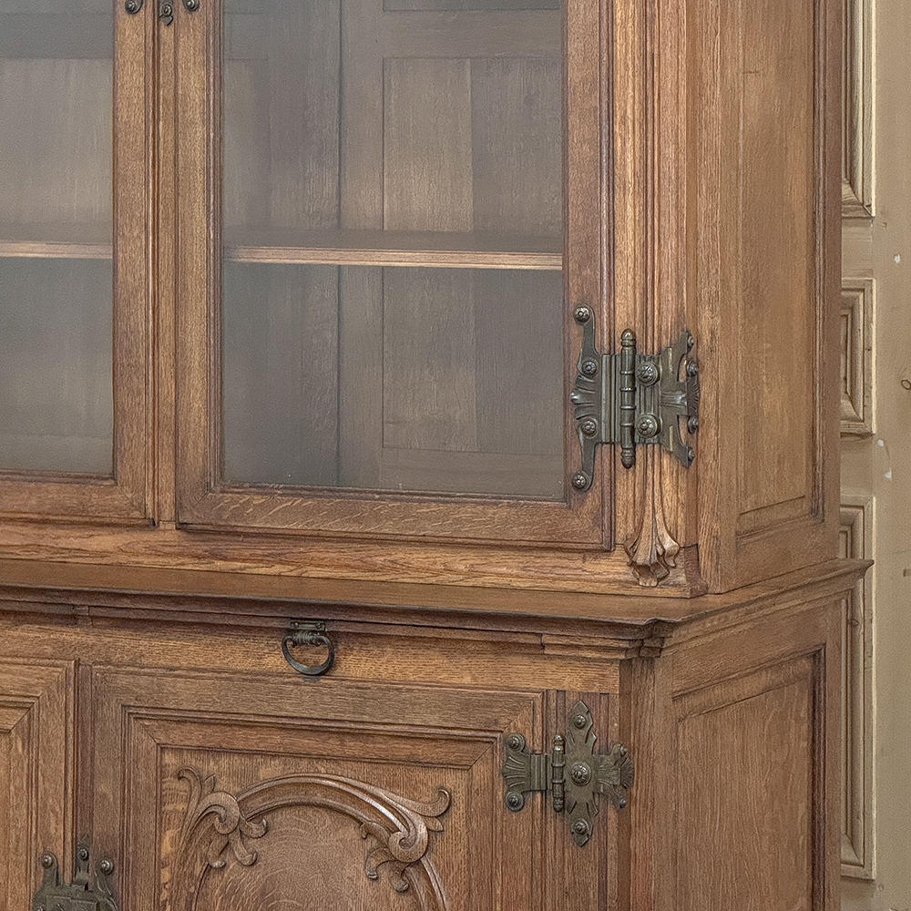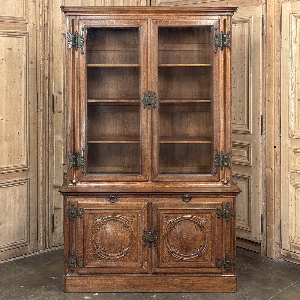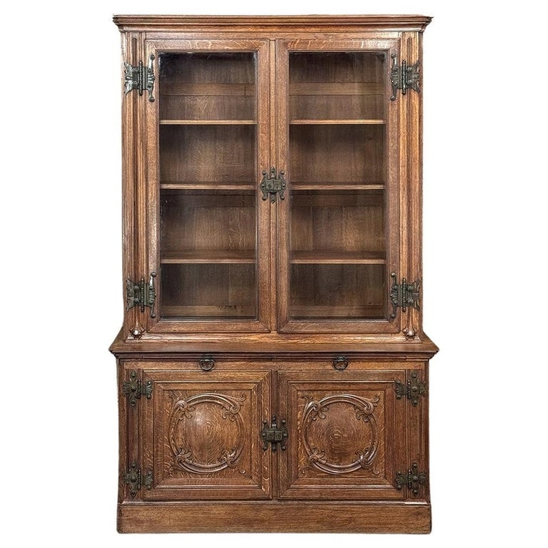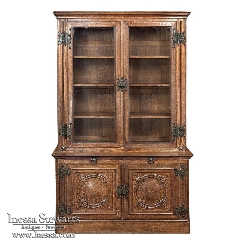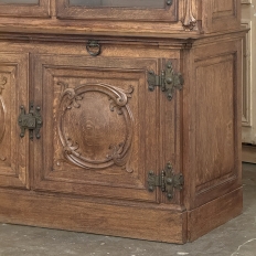19th Century French Art Nouveau Period Bookcase shows an intriguing touch of flair that foretells the more enthusiastic stylings yet to come. The interesting roundel on each cabinet door is created with relief molding with a stylized foliate motif, and a bombe center to the work. What immediately catches the eye are the unusual hinges and lockworks in bronze, elaborately styled and mounted. The upper tier sports generously glazed panes allowing one unfettered visual access, with doors that open wide to allow placement and retrieval, with three adjustable shelves and one floor for plenty of display or storage surface. A convenient pull-out surface separates the top tier from the bottom, and the lower tier features a cavernous interior accessed via the aforementioned cabinets, creating functionality that cannot be denied. Note the special architectural details on the upper corners, including flared foliate motifs that became common during the Art Nouveau period.
