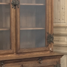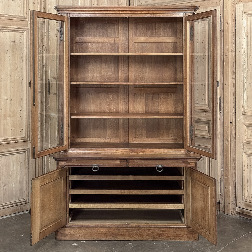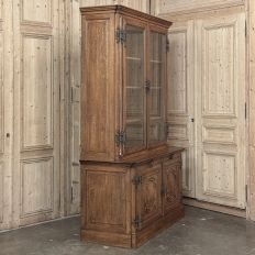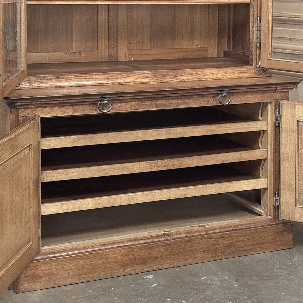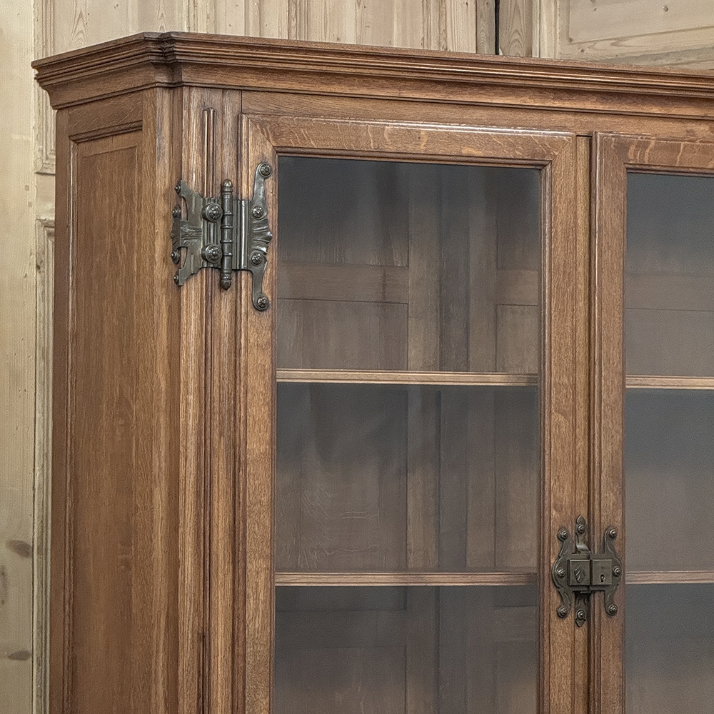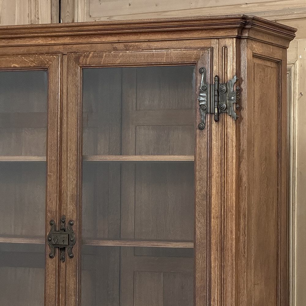 19th Century French Art Nouveau Period Bookcase shows an intriguing touch of flair that foretells the more enthusiastic stylings yet to come. The interesting roundel on each cabinet door is created with relief molding with a stylized foliate motif, and a bombe center to the work. What immediately catches the eye are the unusual hinges and lockworks in bronze, elaborately styled and mounted. The upper tier sports generously glazed panes allowing one unfettered visual access, with doors that open wide to allow placement and retrieval, with three adjustable shelves and one floor for plenty of display or storage surface. A convenient pull-out surface separates the top tier from the bottom, and the lower tier features a cavernous interior accessed via the aforementioned cabinets, creating functionality that cannot be denied. Note the special architectural details on the upper corners, including flared foliate motifs that became common during the Art Nouveau period.