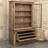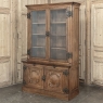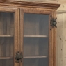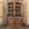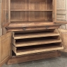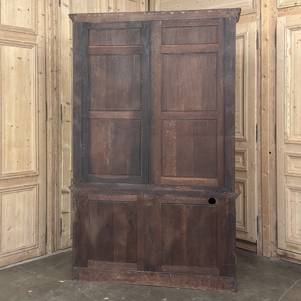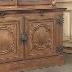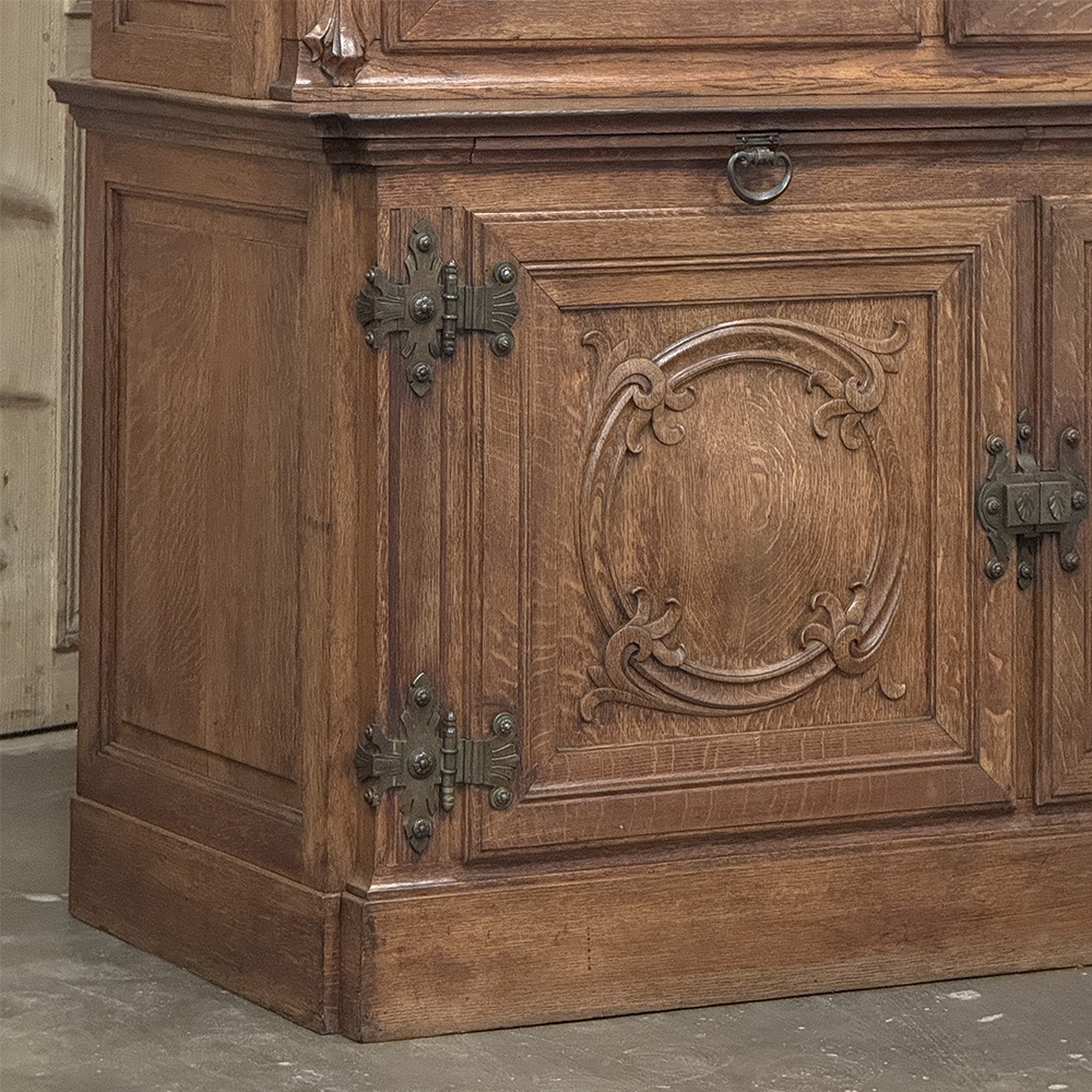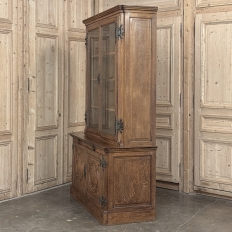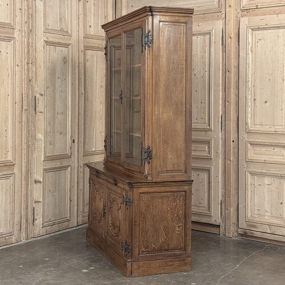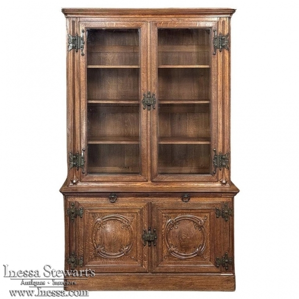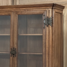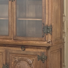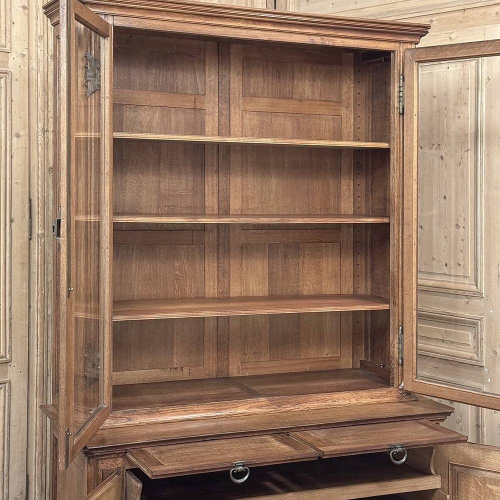 19th Century French Art Nouveau Period Bookcase shows an intriguing touch of flair that foretells the more enthusiastic stylings yet to come. The interesting roundel on each cabinet door is created with relief molding with a stylized foliate motif, and a bombe center to the work. What immediately catches the eye are the unusual hinges and lockworks in bronze, elaborately styled and mounted. The upper tier sports generously glazed panes allowing one unfettered visual access, with doors that open wide to allow placement and retrieval, with three adjustable shelves and one floor for plenty of display or storage surface. A convenient pull-out surface separates the top tier from the bottom, and the lower tier features a cavernous interior accessed via the aforementioned cabinets, creating functionality that cannot be denied. Note the special architectural details on the upper corners, including flared foliate motifs that became common during the Art Nouveau period.