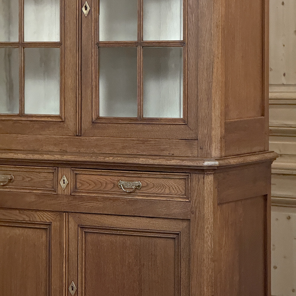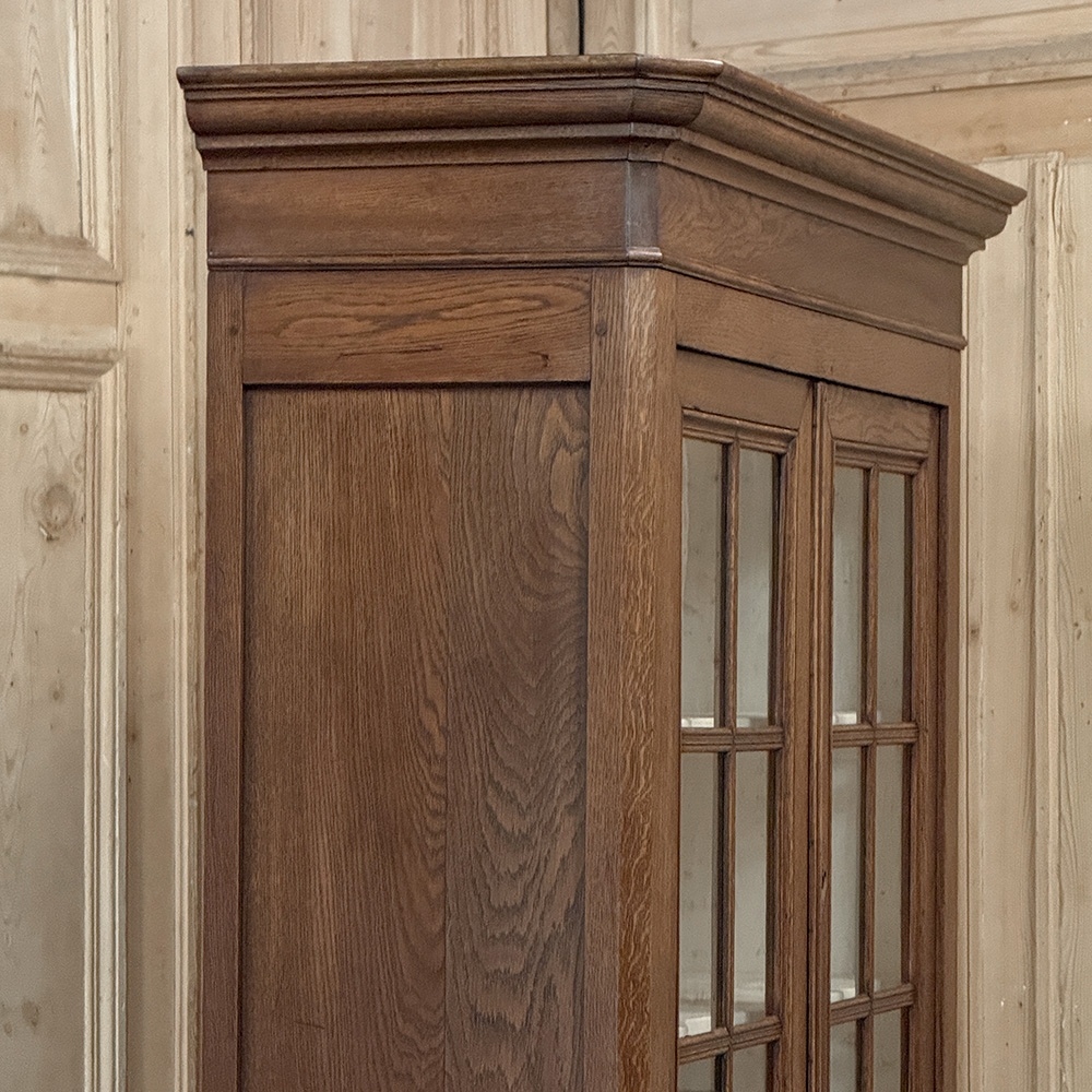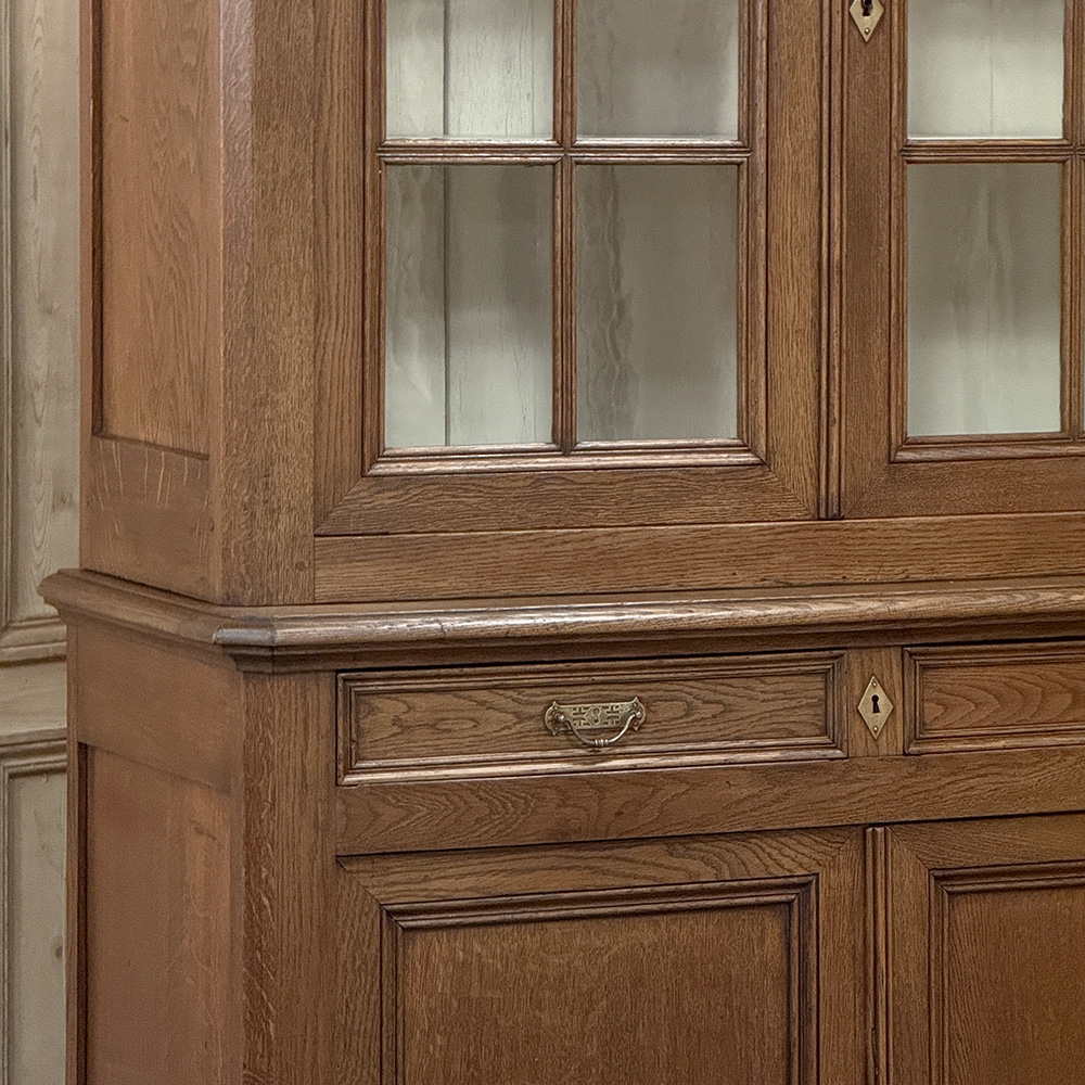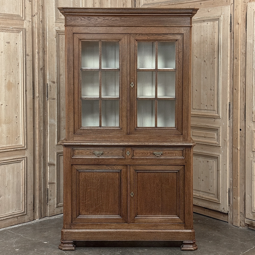 19th Century French Louis Philippe Period Bookcase ~ Bibliotheque is a stately example of the genre, rendered from dense, old-growth oak to literally last for centuries! The trademark multi-tiered crown with mitered corners presides over the upper tier, with a brace of doors fitted with six panes each and a white-painted interior designed to amplify ambient light and showcase your collection. The lower tier steps out a bit, providing a little more depth for the pair of drawers and surprisingly capacious cabinets. The casework also continues the bold yet restrained molding with mitered corners, even into the pediment feet. Brass bale pulls and key guards complete the look. What a wonderful way to blend with almost any decor and style!