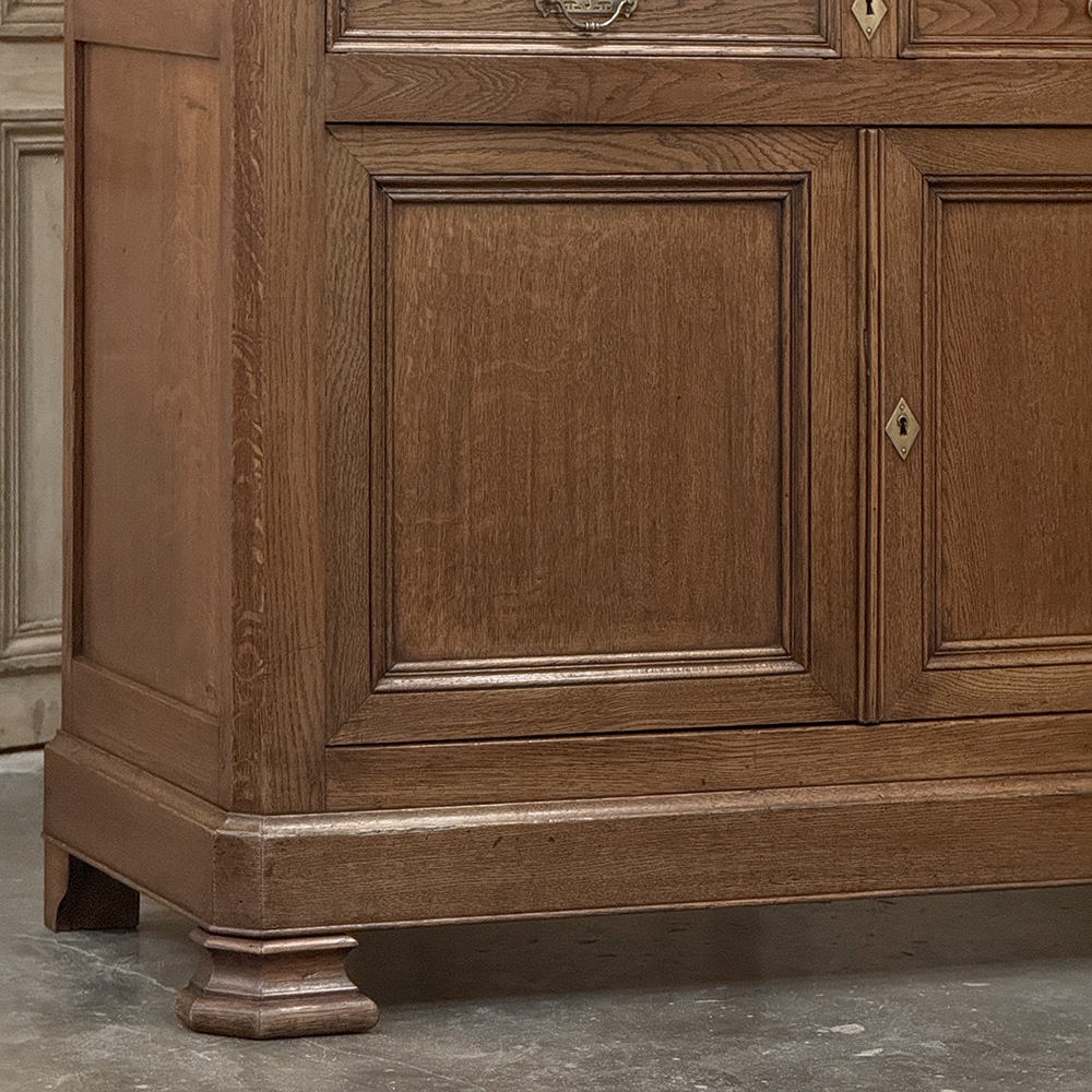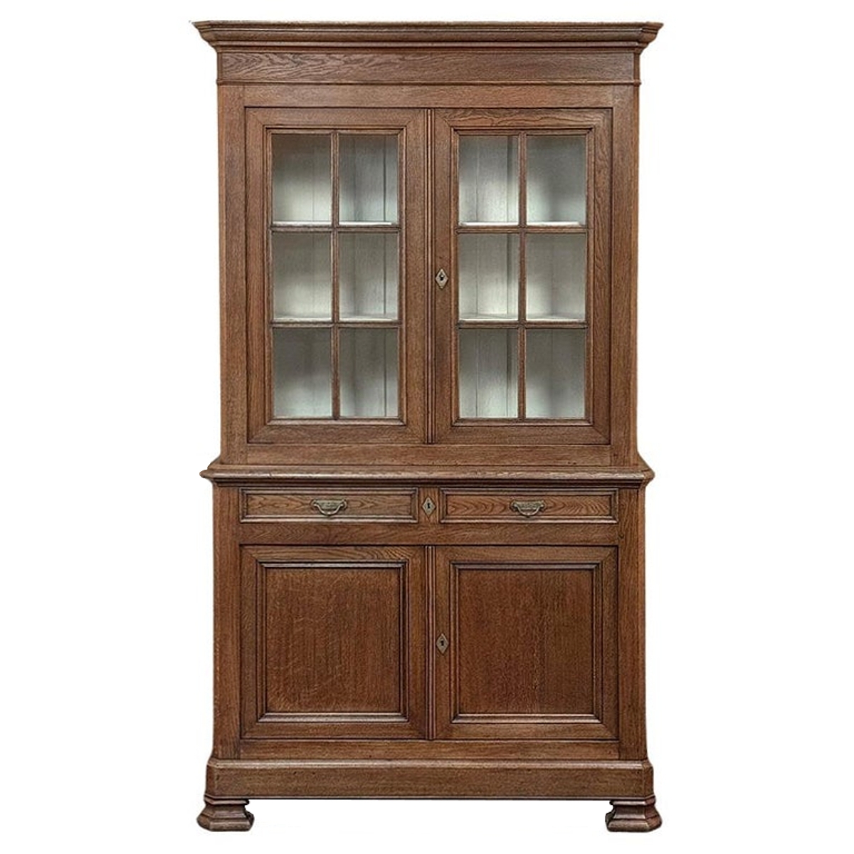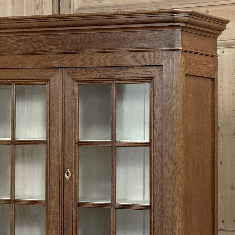 19th Century French Louis Philippe Period Bookcase ~ Bibliotheque is a stately example of the genre, rendered from dense, old-growth oak to literally last for centuries! The trademark multi-tiered crown with mitered corners presides over the upper tier, with a brace of doors fitted with six panes each and a white-painted interior designed to amplify ambient light and showcase your collection. The lower tier steps out a bit, providing a little more depth for the pair of drawers and surprisingly capacious cabinets. The casework also continues the bold yet restrained molding with mitered corners, even into the pediment feet. Brass bale pulls and key guards complete the look. What a wonderful way to blend with almost any decor and style!