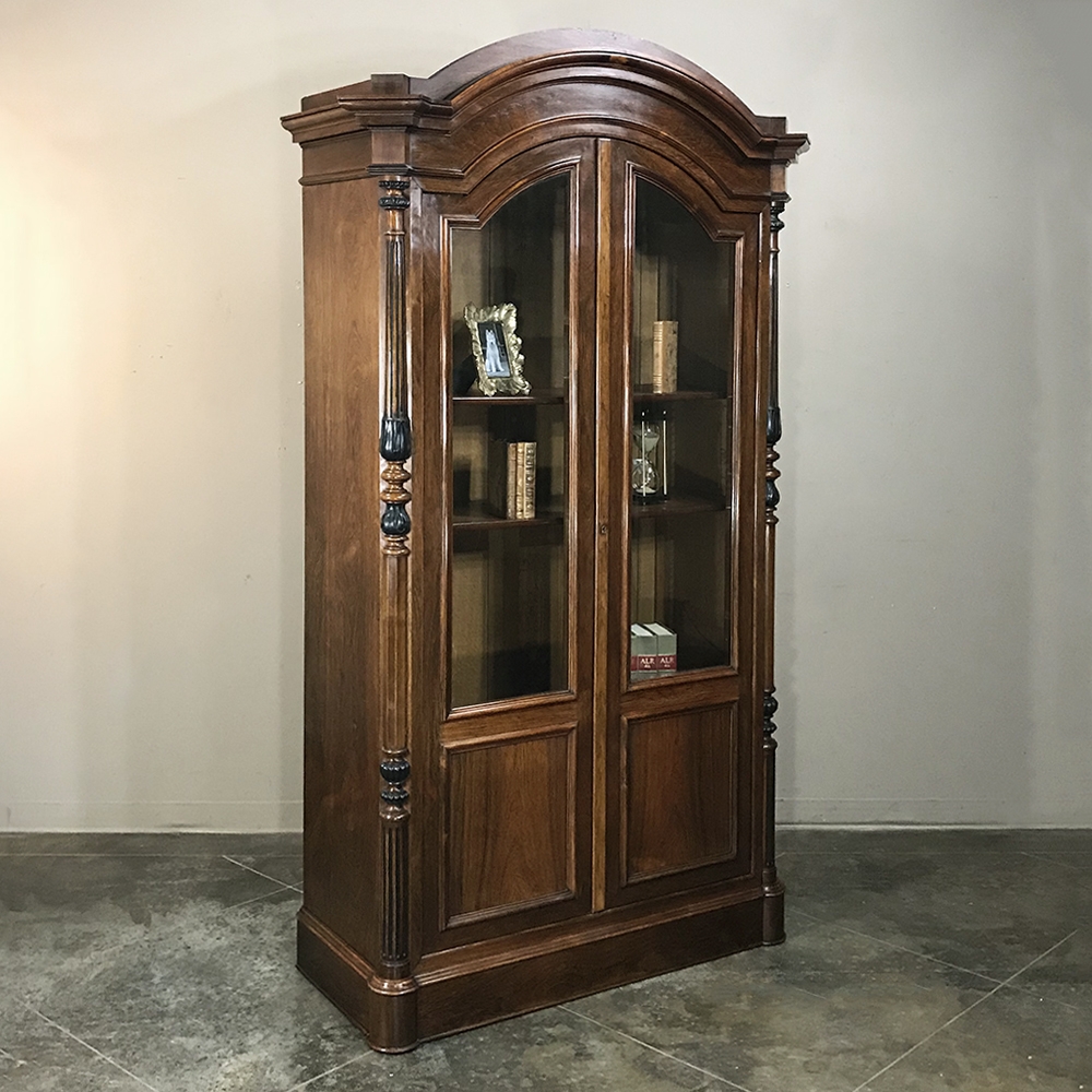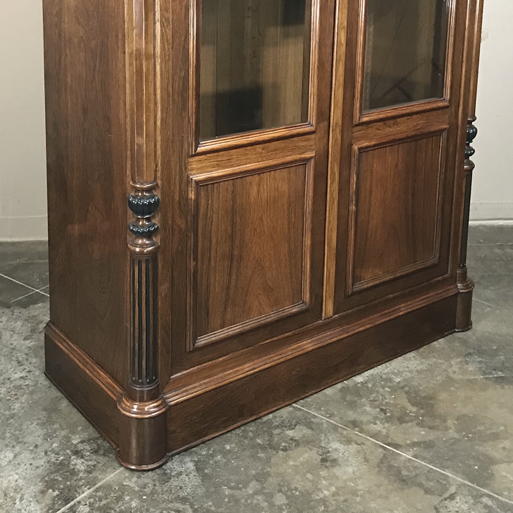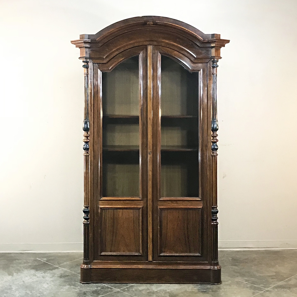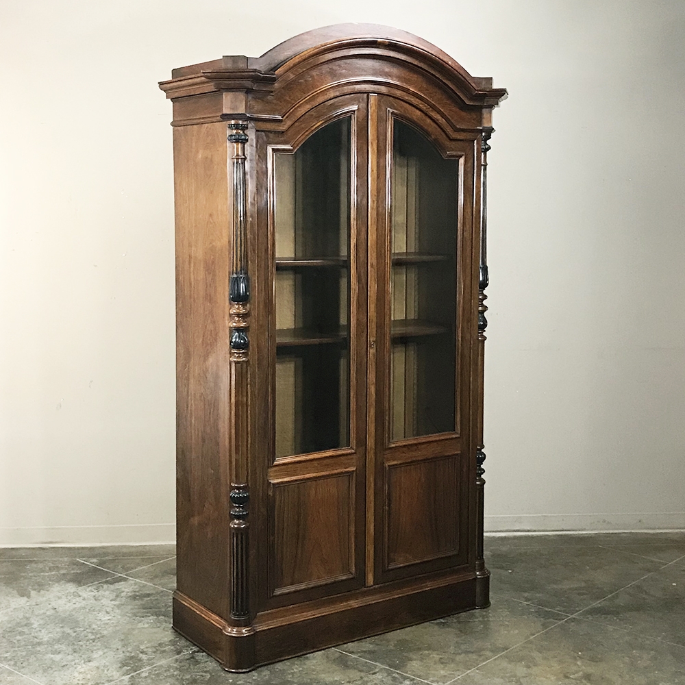 Sale19th Century French Louis Philippe Rosewood Bookcase is the perfect choice for those with a special collection, prized family heirlooms, or for your library of books! Rosewood, sometimes called Kingwood, was considered the finest furniture wood extant, and available only to the most prestigious furniture houses during the period due to its extraordinary expense, being harvested in the Americas and brought back to Europe via arduous sea voyages. This example exhibits a traditional style relying on the sheer natural beauty of the exotic wood and expert molding detail which conveys understated elegance. It features a bold chapeau de gendarme cornice, mitered corners with finely turned and carved half columns framing the doors, and classic tailored lines allowing it to work with a huge variety of styles and tastes.