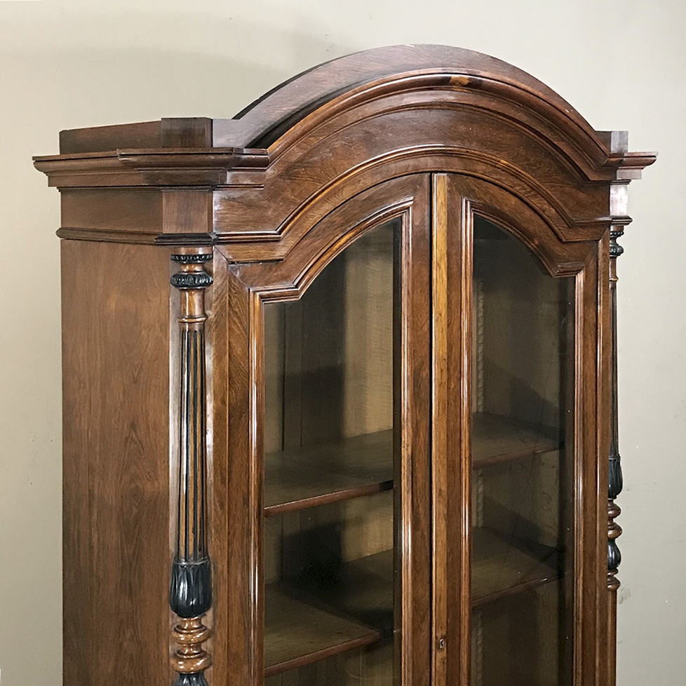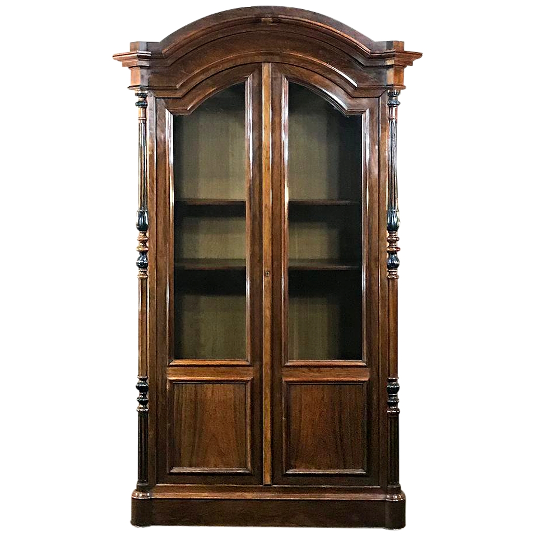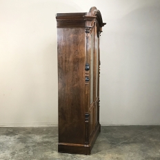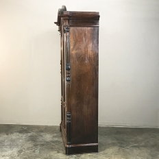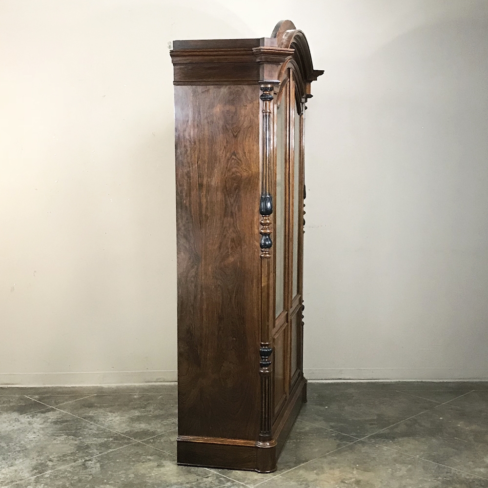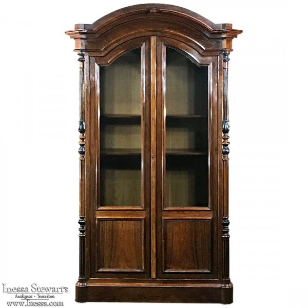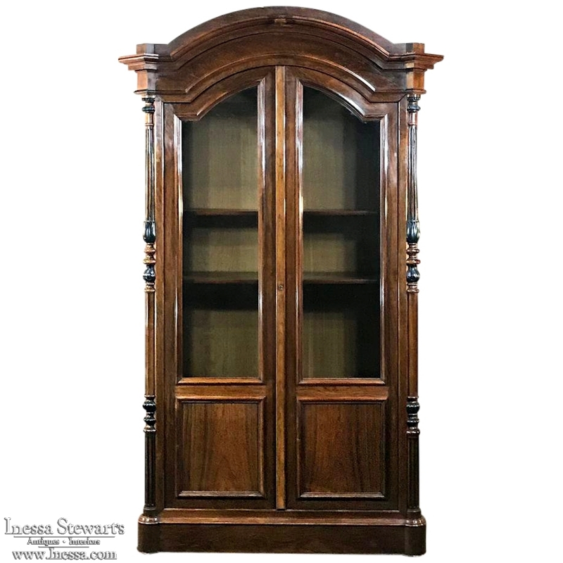 Sale19th Century French Louis Philippe Rosewood Bookcase is the perfect choice for those with a special collection, prized family heirlooms, or for your library of books! Rosewood, sometimes called Kingwood, was considered the finest furniture wood extant, and available only to the most prestigious furniture houses during the period due to its extraordinary expense, being harvested in the Americas and brought back to Europe via arduous sea voyages. This example exhibits a traditional style relying on the sheer natural beauty of the exotic wood and expert molding detail which conveys understated elegance. It features a bold chapeau de gendarme cornice, mitered corners with finely turned and carved half columns framing the doors, and classic tailored lines allowing it to work with a huge variety of styles and tastes.