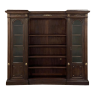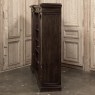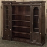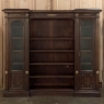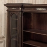 19th Century French Louis XVI Neoclassical Mahogany Bookcase ~ Bibliotheque is a marvel of style and craftsmanship, rendered from fine imported mahogany to create an instant family heirloom that will last for generations! In a design that could be considered a barrister's bookcase because of the relatively short height of the piece, the casework features stately neoclassical architecture inspired by ancient Greek and Roman designs, including two independent side cabinets stepped out from the centered open-shelf casework. The step-front design is defined by the incredibly complex molding detail, with enhancements including fully fluted pilasters on each corner accented by cast bronze bell flowers above, and rosettes towards the bast, with small rosettes on the raised panel at the bottom of the door which boasts a 3/4 arched glazed panel on the upper part of the door allowing one to admire and appreciate the collection within. There's a matching bronze key guard, of course, and both doors open to reveal a total of ten adjustable shelves plus the floor surface, of course. The center is slightly recessed, and features four adjustable shelves for five total surfaces, creating an easily accessible place for frequently used items or books. A tailored multi-tiered base below provides support, but is overshadowed by the intricate molded detail of the crown above, finished with four rosettes, a brace of foliate sprays with ribbon, and a center foliate embellishment all rendered in luxurious cast bronze.