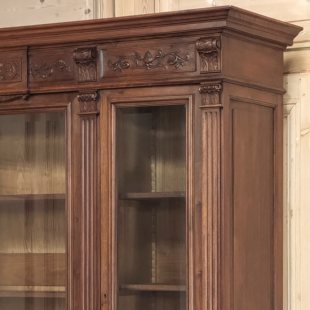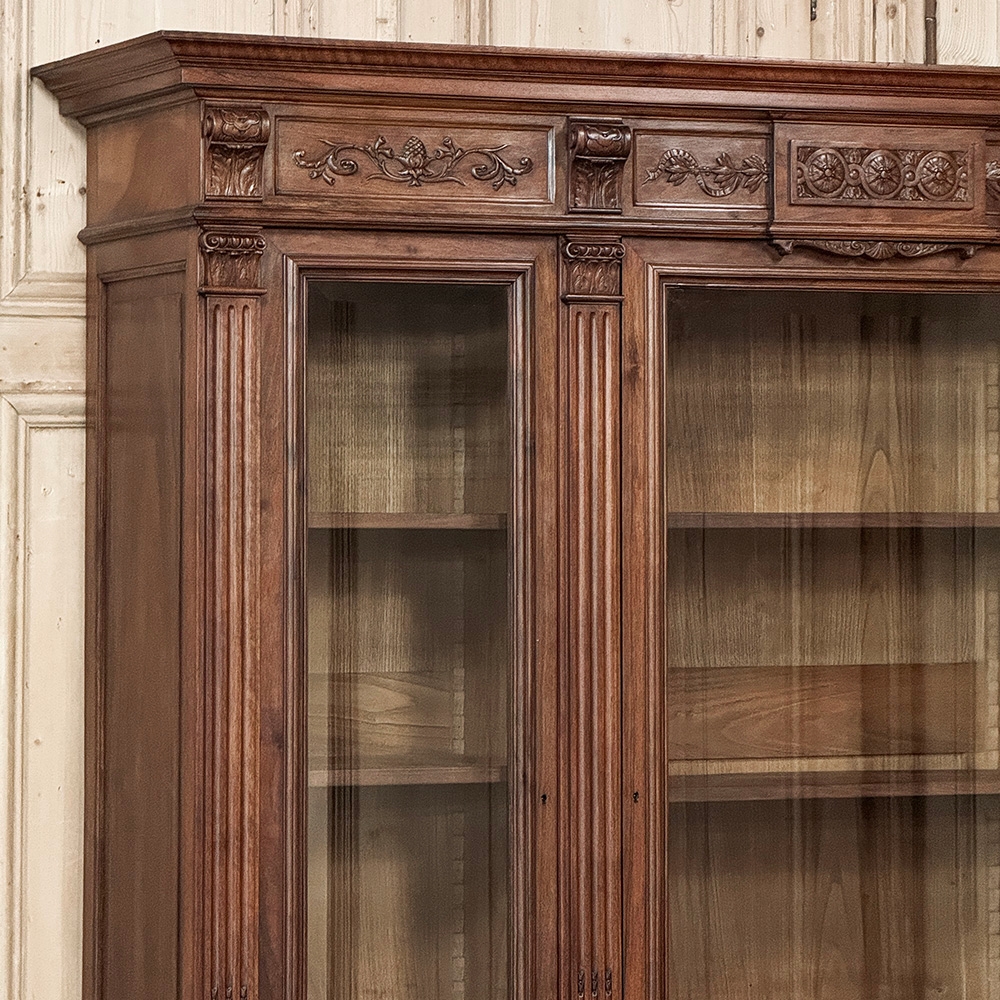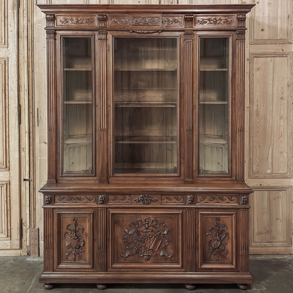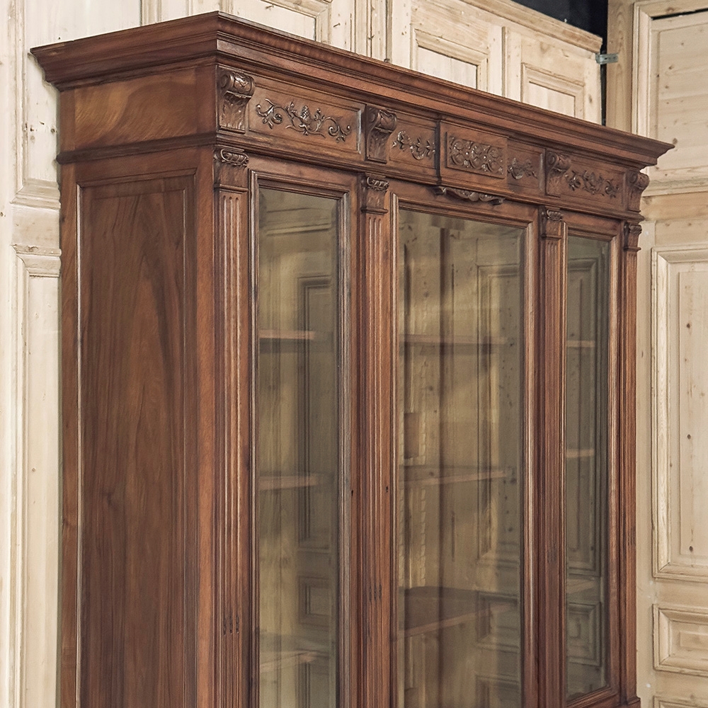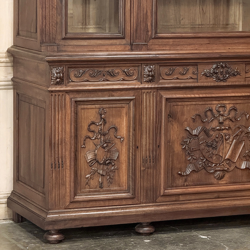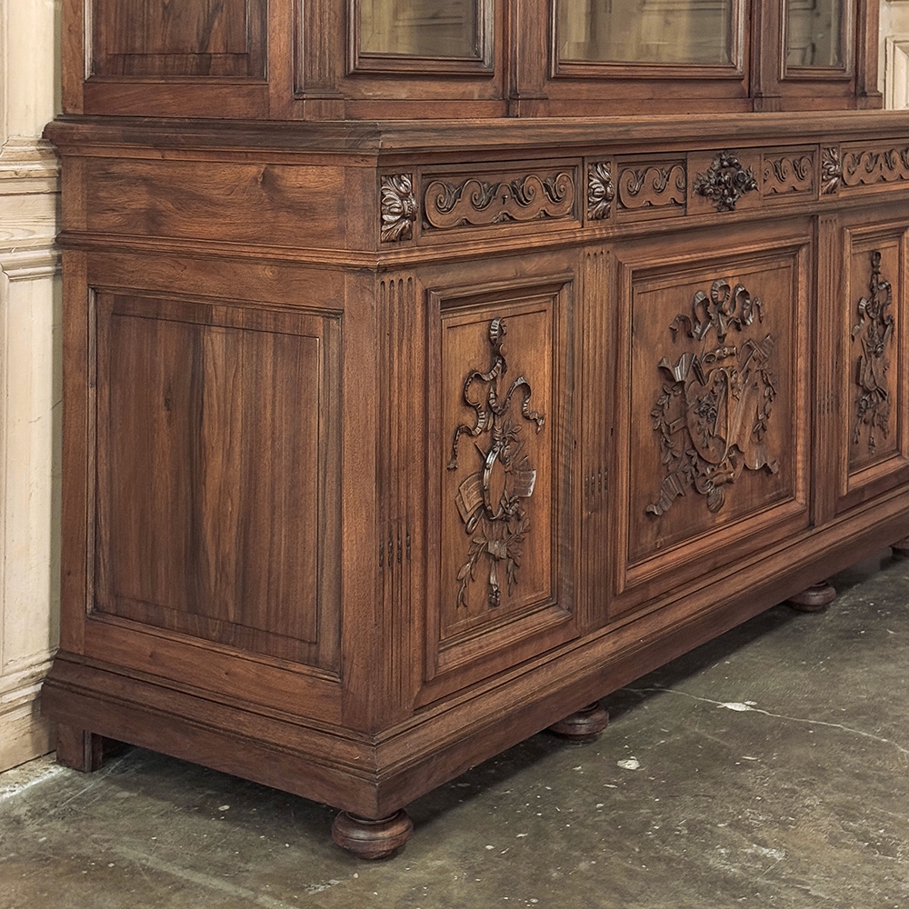 19th Century French Louis XVI Neoclassical Walnut Triple Bookcase is a superlative example of the cabinetmaker's art! The talented artisans utilized sumptuous, indigenous French walnut to create a grand cabinet with three glazed doors fitted with beveled glass above, three doors below, and three drawers in between. The boldly molded crown above features elaborate bas relief carvings across the front, separated by corbels which are positioned above pilasters on the upper tier that define the corners and separate the glass doors. Inside, adjustable shelves allow you an almost infinite range of positions to best display your finest books, collection, or family memorabilia. Three drawers just underneath are defined with rosettes and carved Greek wave across the facade, centered with a relief of a floral wreath with sprays. All three doors below are lavished with exquisite relief carvings of classical themes including musical instruments, flowing ribbon, shells, open books, foliates and even music scores. Bold molding throughout the design ensures a stunning visual presence from all angles.