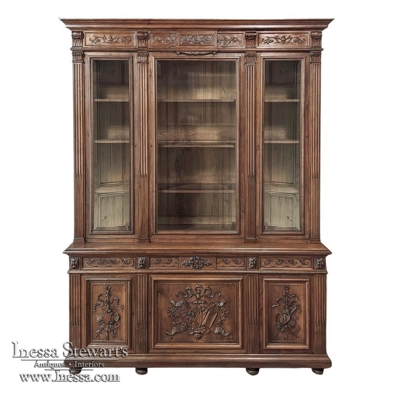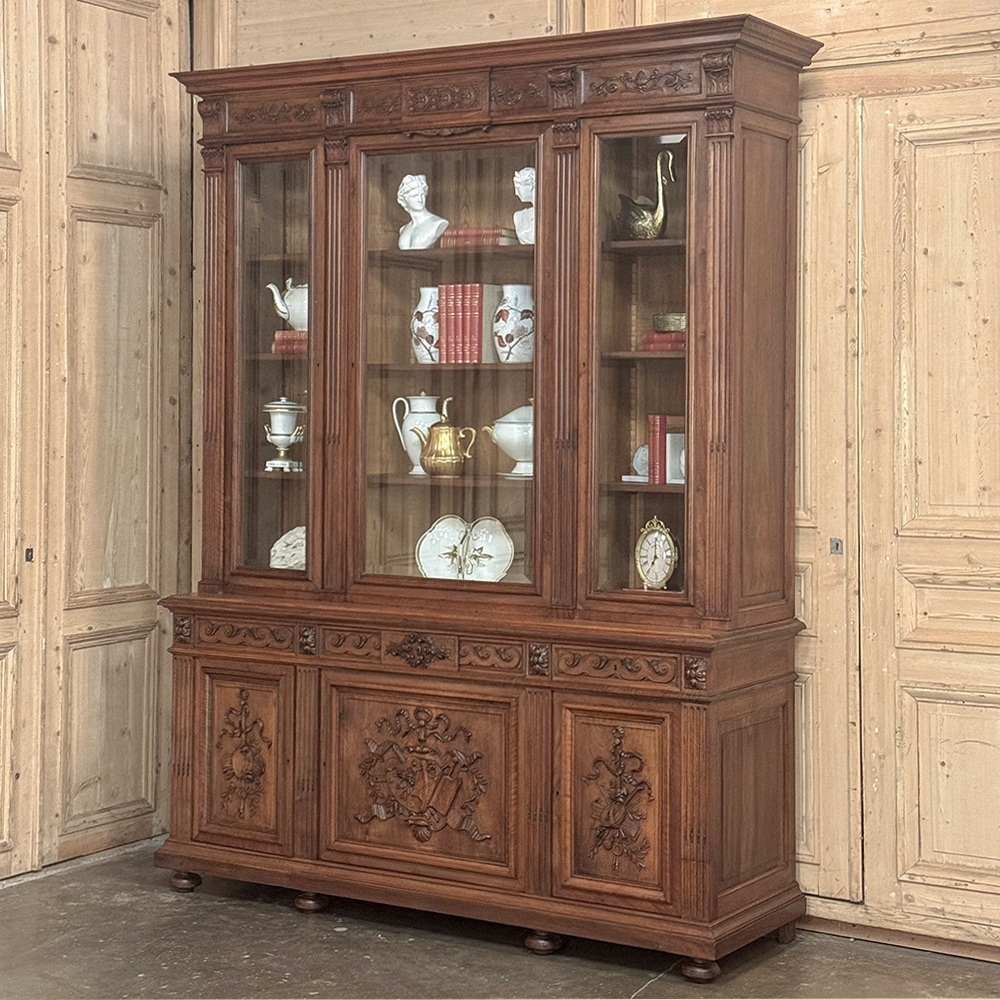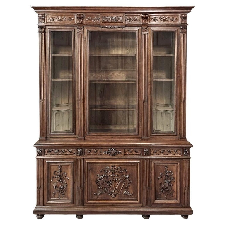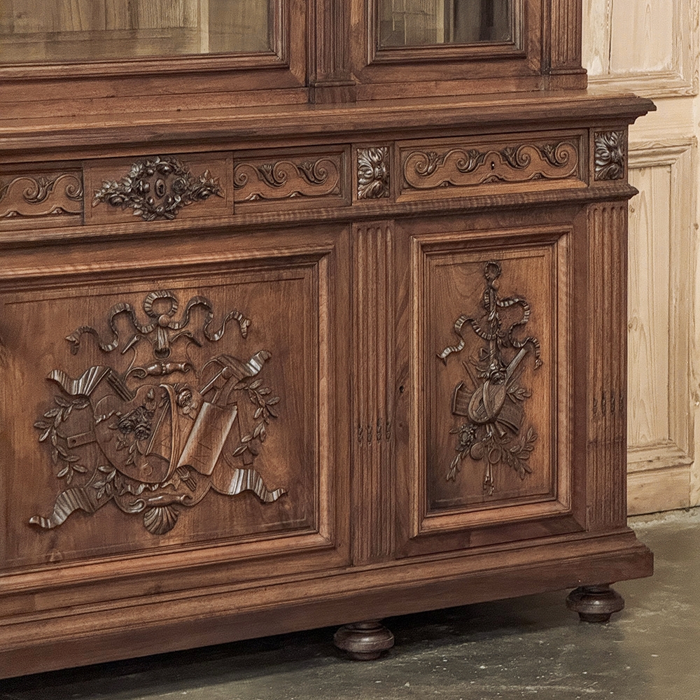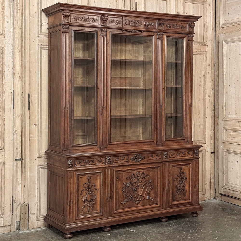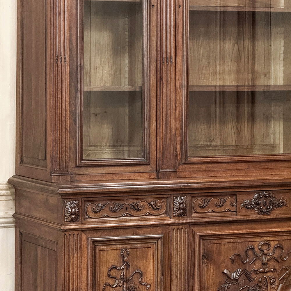 19th Century French Louis XVI Neoclassical Walnut Triple Bookcase is a superlative example of the cabinetmaker's art! The talented artisans utilized sumptuous, indigenous French walnut to create a grand cabinet with three glazed doors fitted with beveled glass above, three doors below, and three drawers in between. The boldly molded crown above features elaborate bas relief carvings across the front, separated by corbels which are positioned above pilasters on the upper tier that define the corners and separate the glass doors. Inside, adjustable shelves allow you an almost infinite range of positions to best display your finest books, collection, or family memorabilia. Three drawers just underneath are defined with rosettes and carved Greek wave across the facade, centered with a relief of a floral wreath with sprays. All three doors below are lavished with exquisite relief carvings of classical themes including musical instruments, flowing ribbon, shells, open books, foliates and even music scores. Bold molding throughout the design ensures a stunning visual presence from all angles.