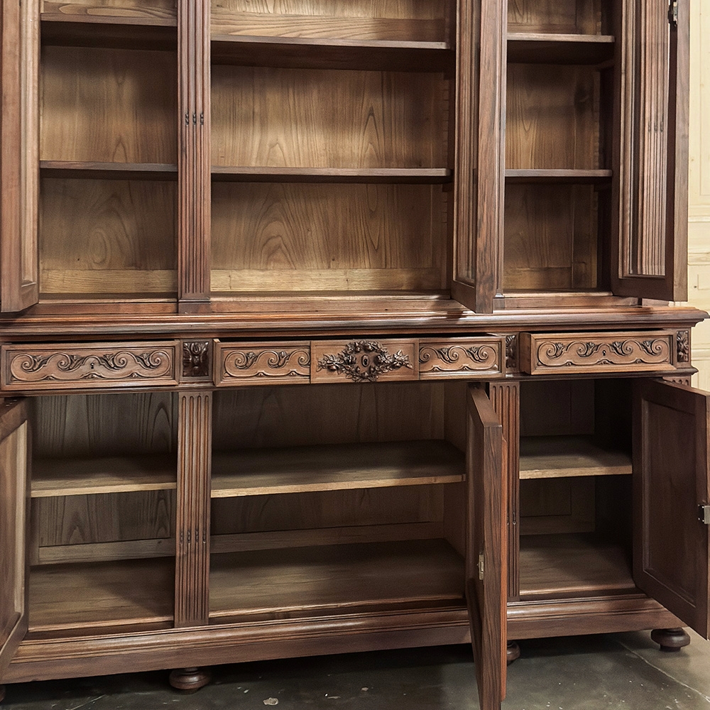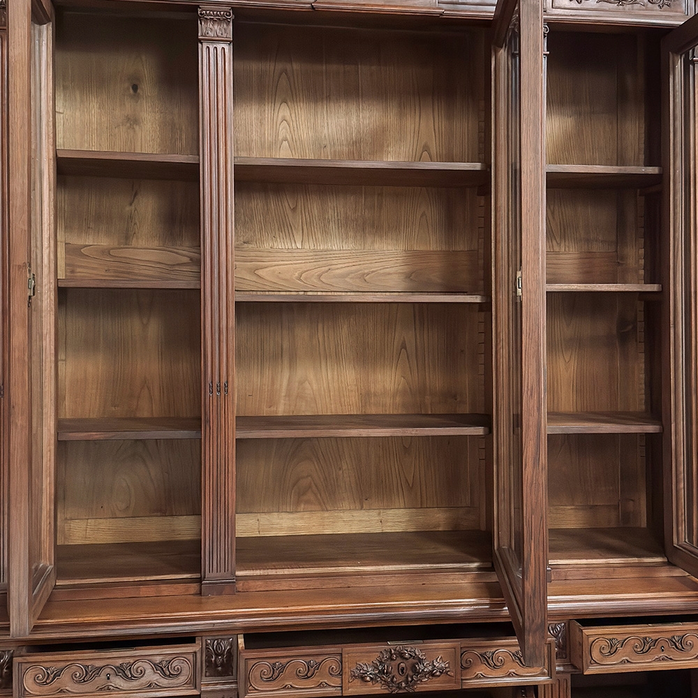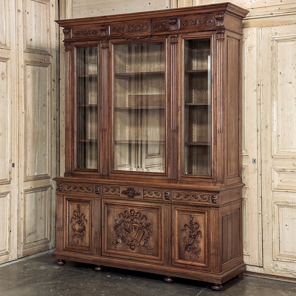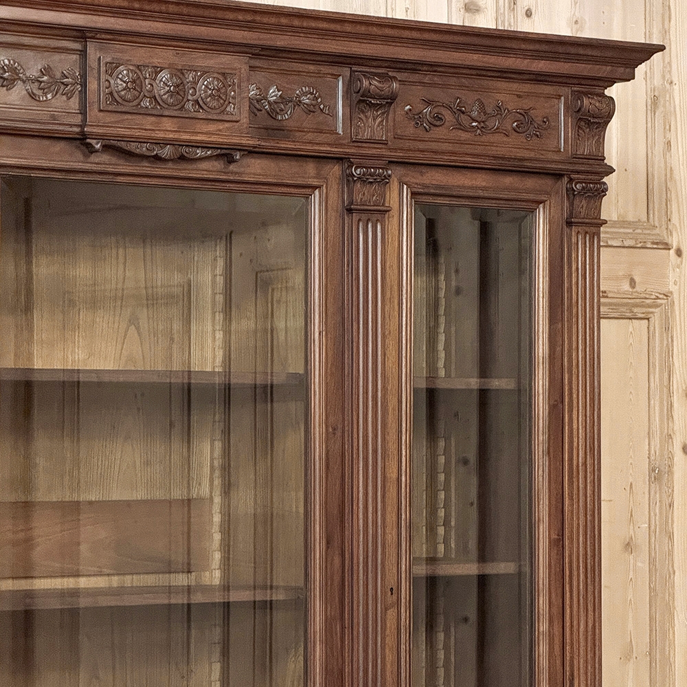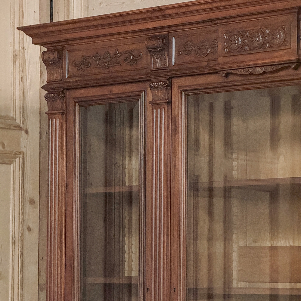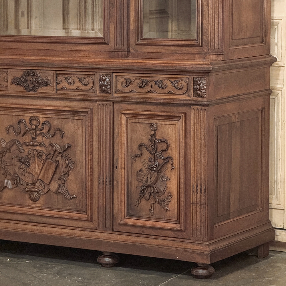 19th Century French Louis XVI Neoclassical Walnut Triple Bookcase is a superlative example of the cabinetmaker's art! The talented artisans utilized sumptuous, indigenous French walnut to create a grand cabinet with three glazed doors fitted with beveled glass above, three doors below, and three drawers in between. The boldly molded crown above features elaborate bas relief carvings across the front, separated by corbels which are positioned above pilasters on the upper tier that define the corners and separate the glass doors. Inside, adjustable shelves allow you an almost infinite range of positions to best display your finest books, collection, or family memorabilia. Three drawers just underneath are defined with rosettes and carved Greek wave across the facade, centered with a relief of a floral wreath with sprays. All three doors below are lavished with exquisite relief carvings of classical themes including musical instruments, flowing ribbon, shells, open books, foliates and even music scores. Bold molding throughout the design ensures a stunning visual presence from all angles.