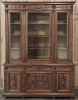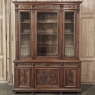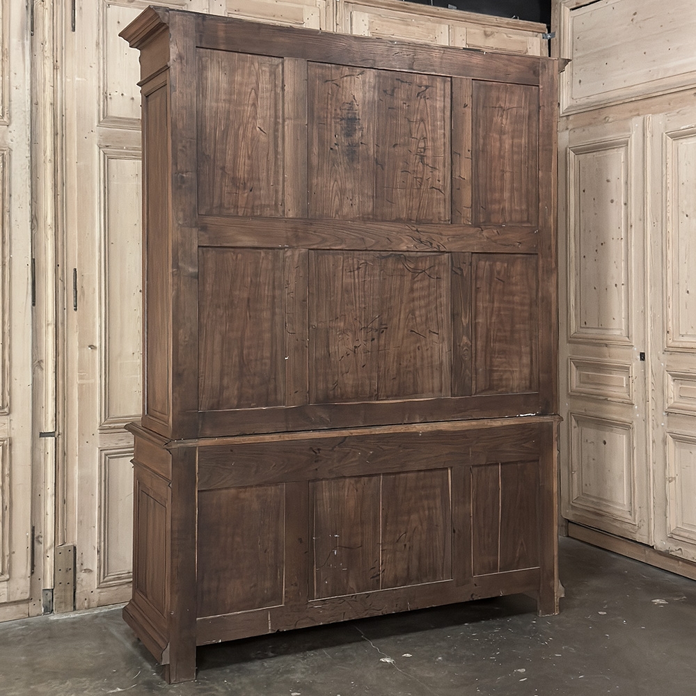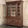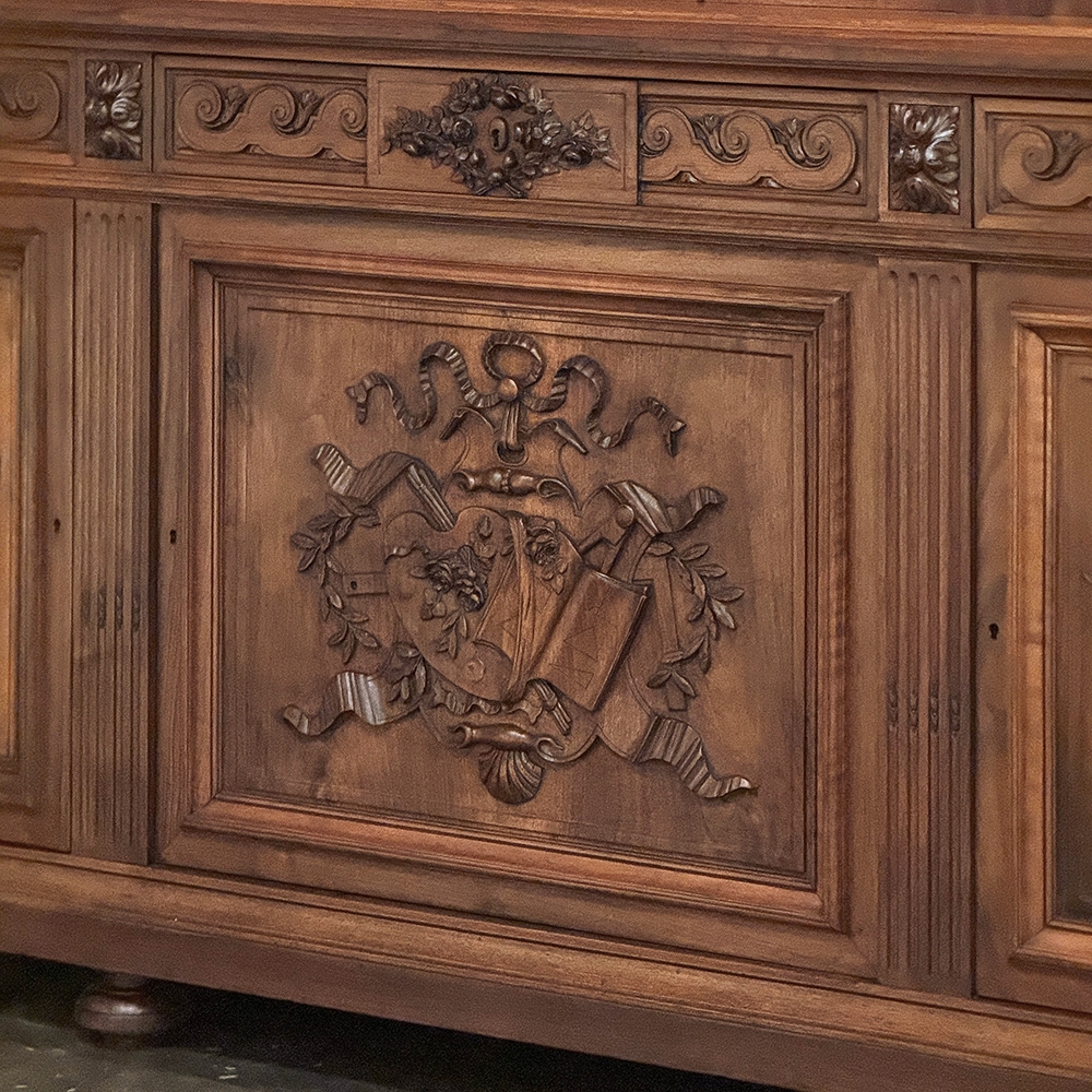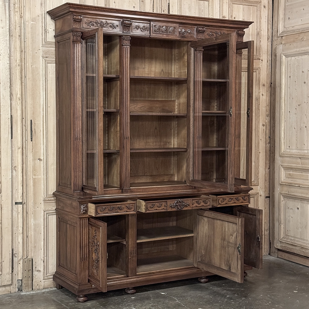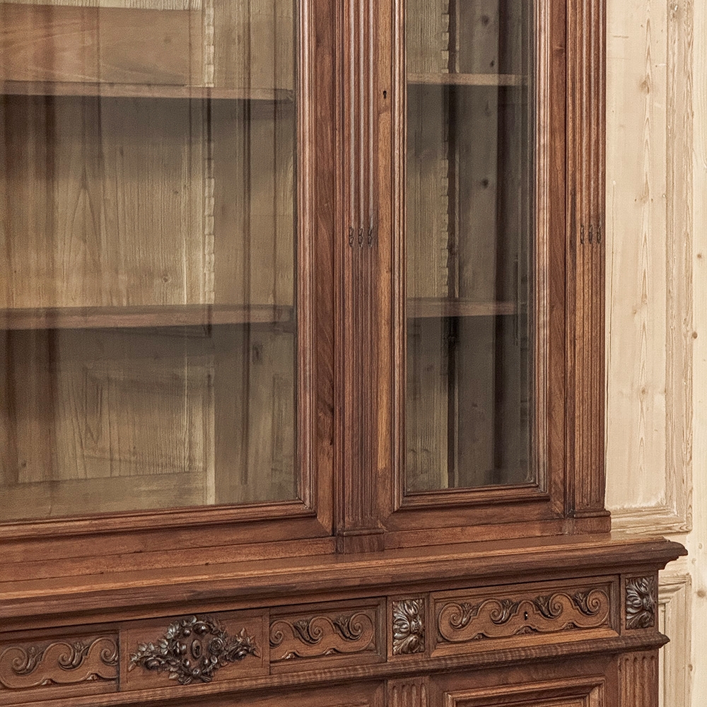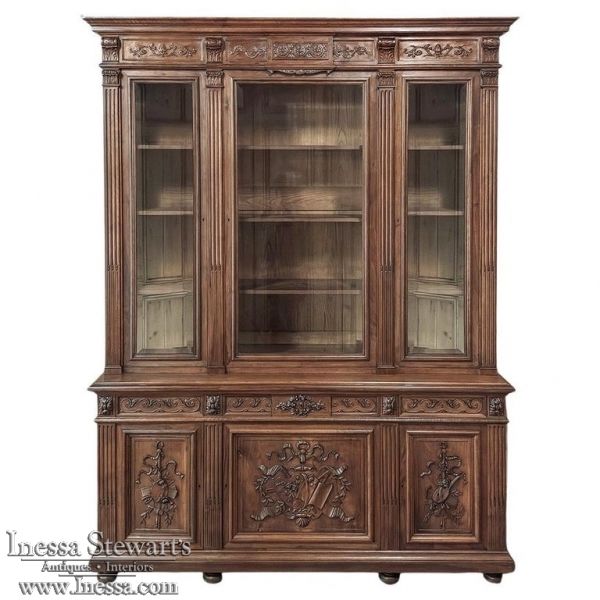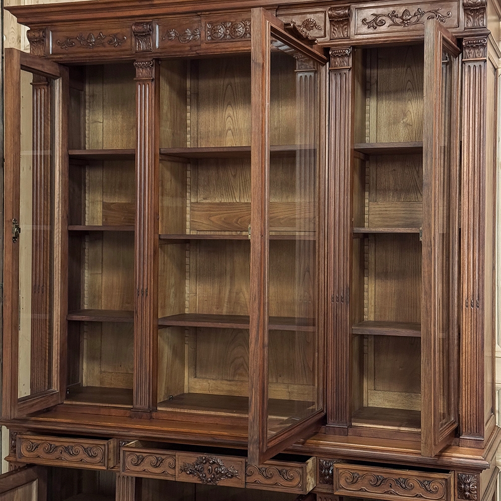 19th Century French Louis XVI Neoclassical Walnut Triple Bookcase is a superlative example of the cabinetmaker's art! The talented artisans utilized sumptuous, indigenous French walnut to create a grand cabinet with three glazed doors fitted with beveled glass above, three doors below, and three drawers in between. The boldly molded crown above features elaborate bas relief carvings across the front, separated by corbels which are positioned above pilasters on the upper tier that define the corners and separate the glass doors. Inside, adjustable shelves allow you an almost infinite range of positions to best display your finest books, collection, or family memorabilia. Three drawers just underneath are defined with rosettes and carved Greek wave across the facade, centered with a relief of a floral wreath with sprays. All three doors below are lavished with exquisite relief carvings of classical themes including musical instruments, flowing ribbon, shells, open books, foliates and even music scores. Bold molding throughout the design ensures a stunning visual presence from all angles.