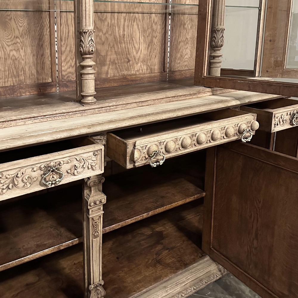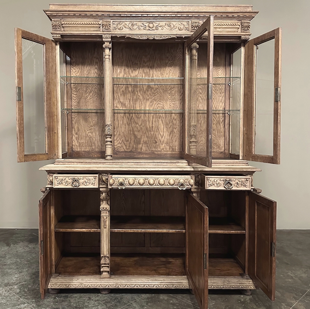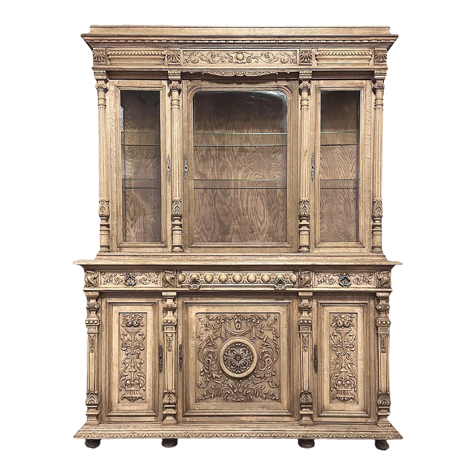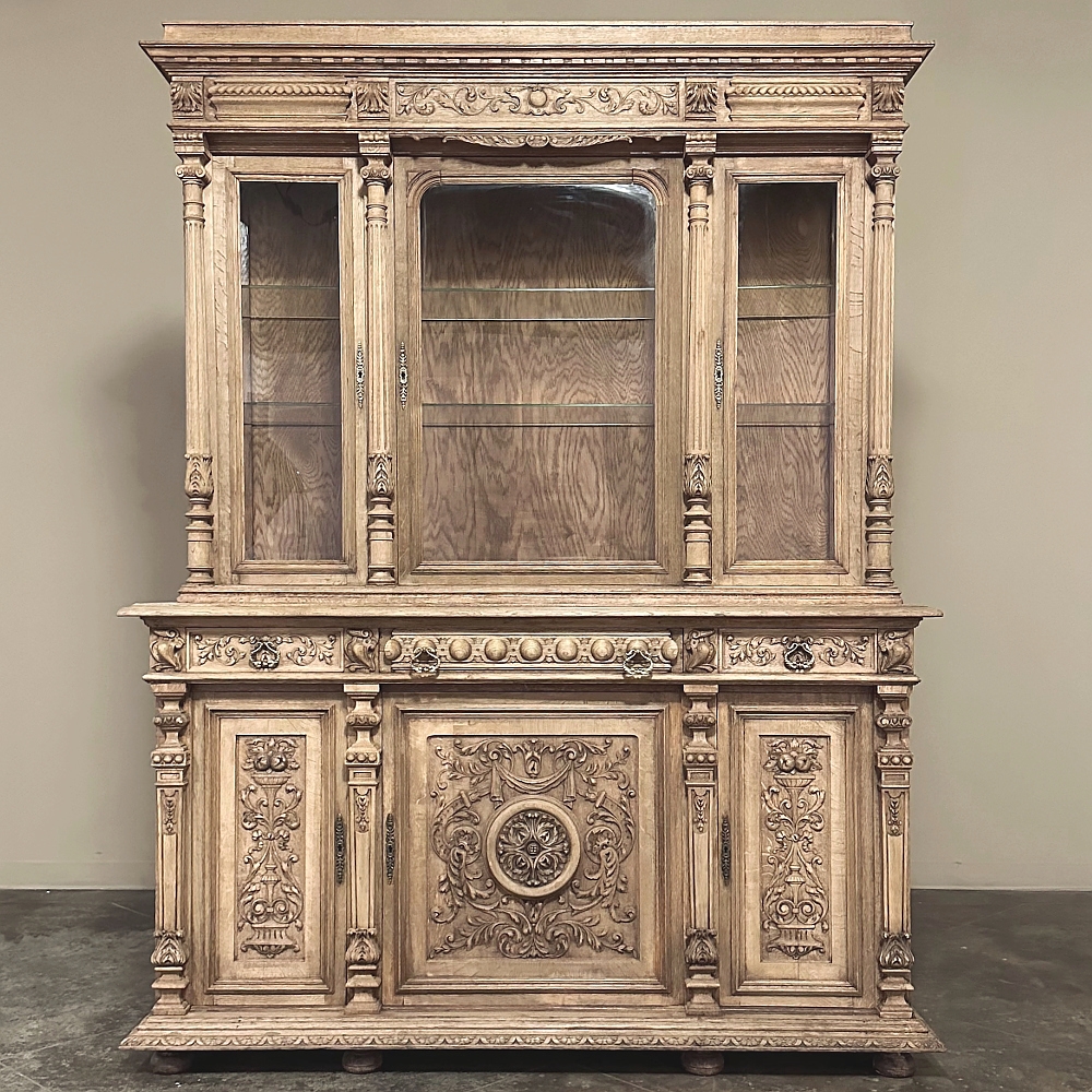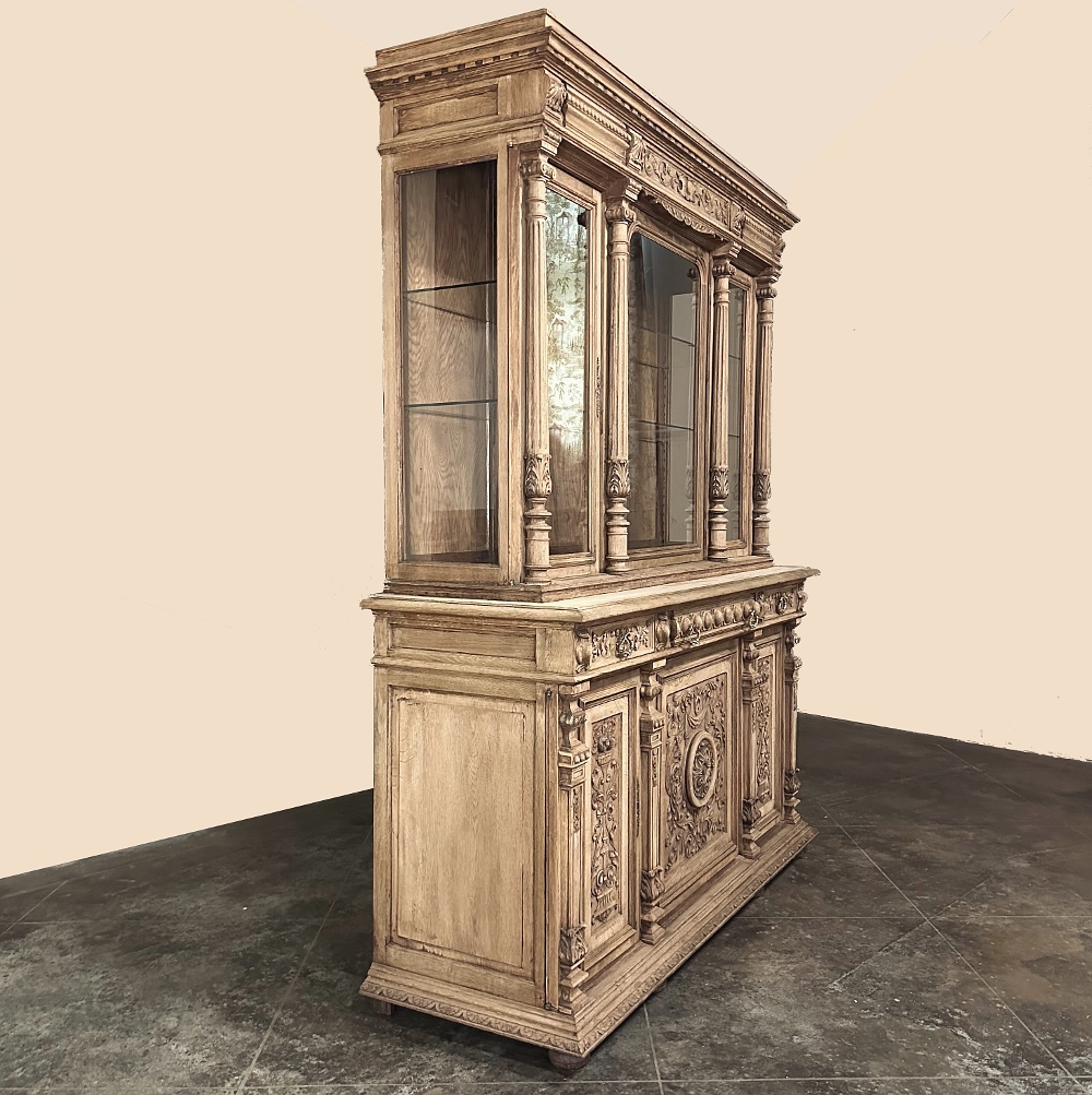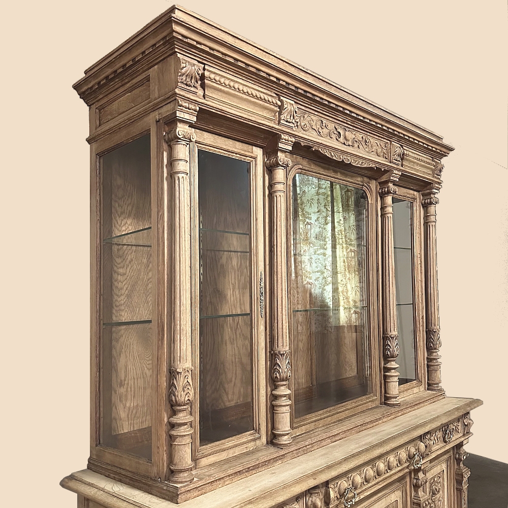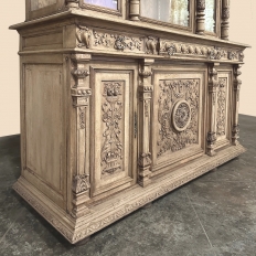 19th Century French Renaissance Bookcase ~ Bibliotheque is a masterpiece of the wood sculptor's art! The timeless architecture features a triple glass door cabinet atop a lower tier that is basically a buffet, combining storage with display in a stunning fashion. The tailored crown molding features subtle dentil over the bonnet which is divided into three sections ~ elongated pediments flanking both sides of a center panel lavished with foliate and heraldic crest carved in full relief. The panels are separated by carved corbels which are positioned above tapered & fluted columns topped with Ionic capitals and resting on bases carved with upturned acanthus plumes, each of which serves to frame the three beveled glass front doors of the upper tier. Glass shelves within take maximum advantage of ambient light. The lower tier juts out to the full depth, and begins with three drawers in a like manner as the architecture of the bonnet above, with relief carved foliates on the left and right, and a Greek coin motif on the center drawer with egg forms accentuating the three dimensionality. The drawers are separated by Baroque medallions in an interesting style departure, which appear above the tapered and carved pilasters below positioned like the columns above to frame the stunning sculpture of the three door panels below. On the left and right are ageless neoclassical designs in bold relief, but the center door ads those themes around a boldly expressed, large acanthus rosette in a circular framework. Demilune carvings appear on the flared base below, supported by bun feet. Solid cast brass key guards and bale pulls provide a special jewelry-like accent, contrasting with the natural beauty of the solid oak, painstakingly stripped by our expert in-house professionals to retain the natural patina.