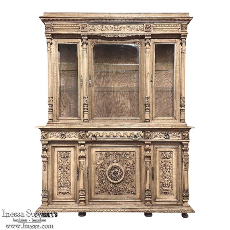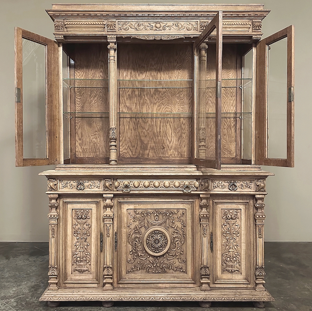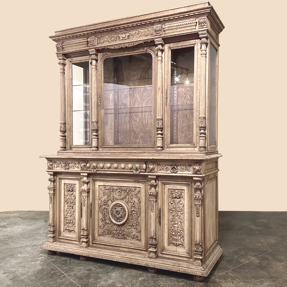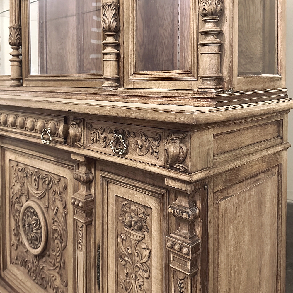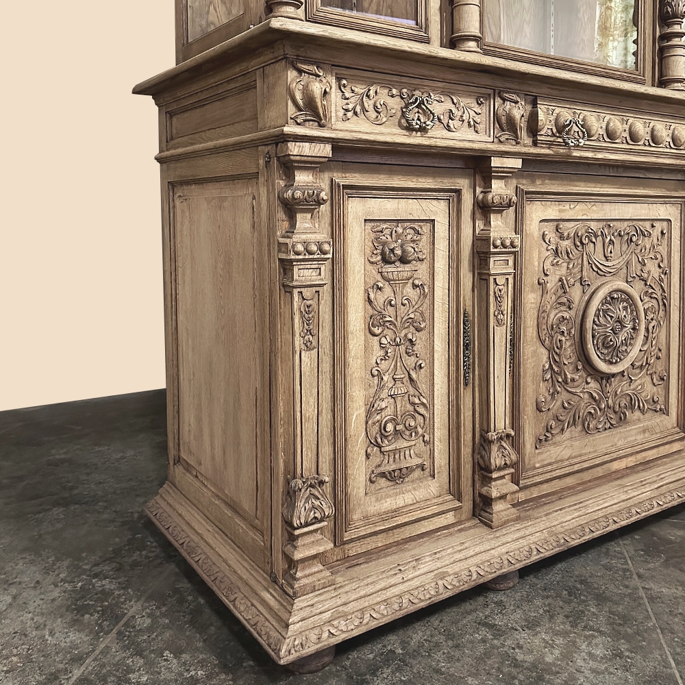 19th Century French Renaissance Bookcase ~ Bibliotheque is a masterpiece of the wood sculptor's art! The timeless architecture features a triple glass door cabinet atop a lower tier that is basically a buffet, combining storage with display in a stunning fashion. The tailored crown molding features subtle dentil over the bonnet which is divided into three sections ~ elongated pediments flanking both sides of a center panel lavished with foliate and heraldic crest carved in full relief. The panels are separated by carved corbels which are positioned above tapered & fluted columns topped with Ionic capitals and resting on bases carved with upturned acanthus plumes, each of which serves to frame the three beveled glass front doors of the upper tier. Glass shelves within take maximum advantage of ambient light. The lower tier juts out to the full depth, and begins with three drawers in a like manner as the architecture of the bonnet above, with relief carved foliates on the left and right, and a Greek coin motif on the center drawer with egg forms accentuating the three dimensionality. The drawers are separated by Baroque medallions in an interesting style departure, which appear above the tapered and carved pilasters below positioned like the columns above to frame the stunning sculpture of the three door panels below. On the left and right are ageless neoclassical designs in bold relief, but the center door ads those themes around a boldly expressed, large acanthus rosette in a circular framework. Demilune carvings appear on the flared base below, supported by bun feet. Solid cast brass key guards and bale pulls provide a special jewelry-like accent, contrasting with the natural beauty of the solid oak, painstakingly stripped by our expert in-house professionals to retain the natural patina.