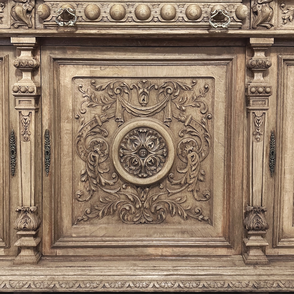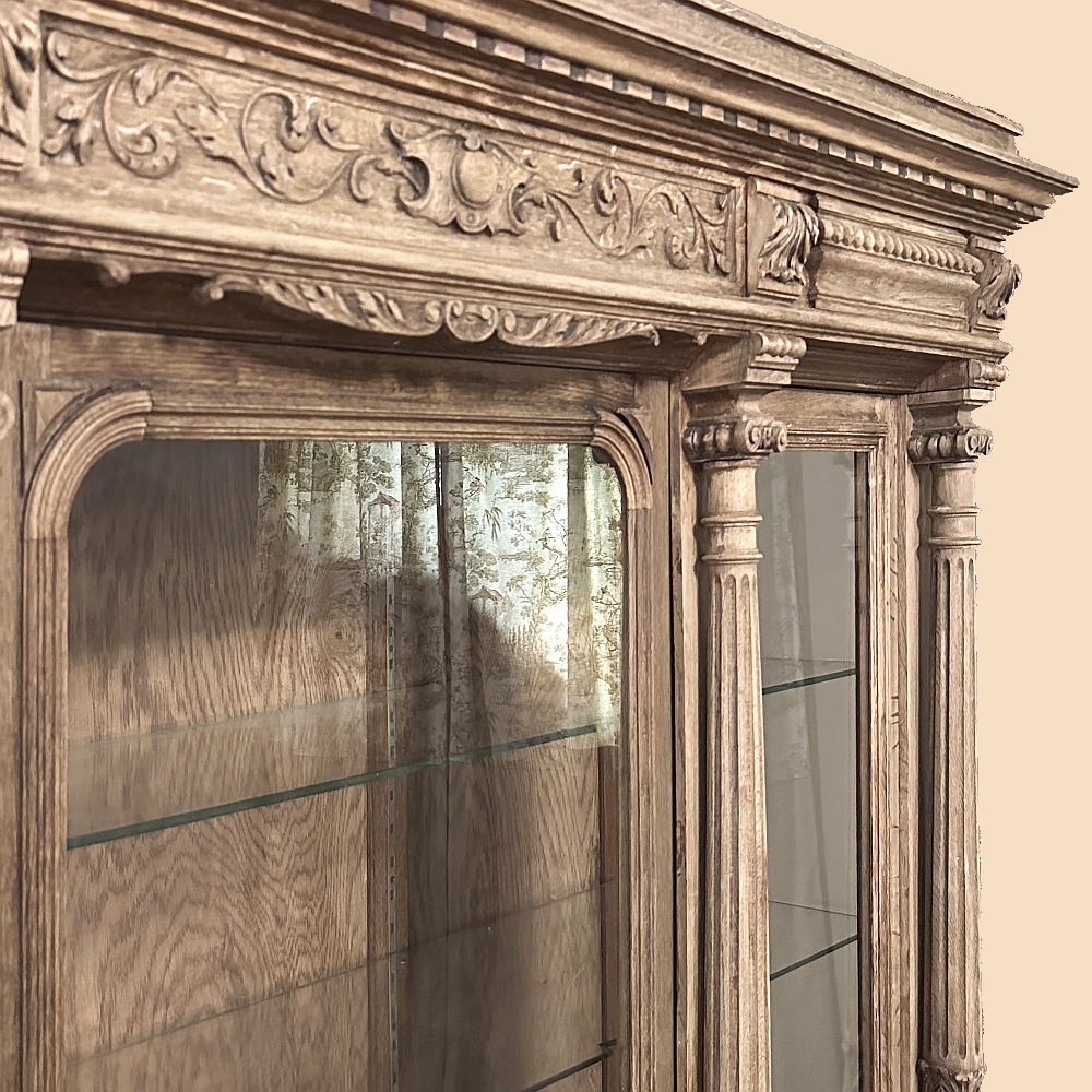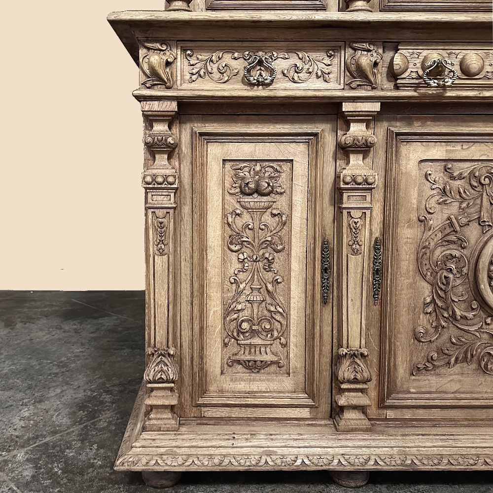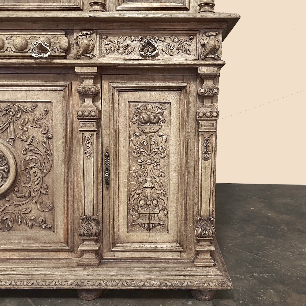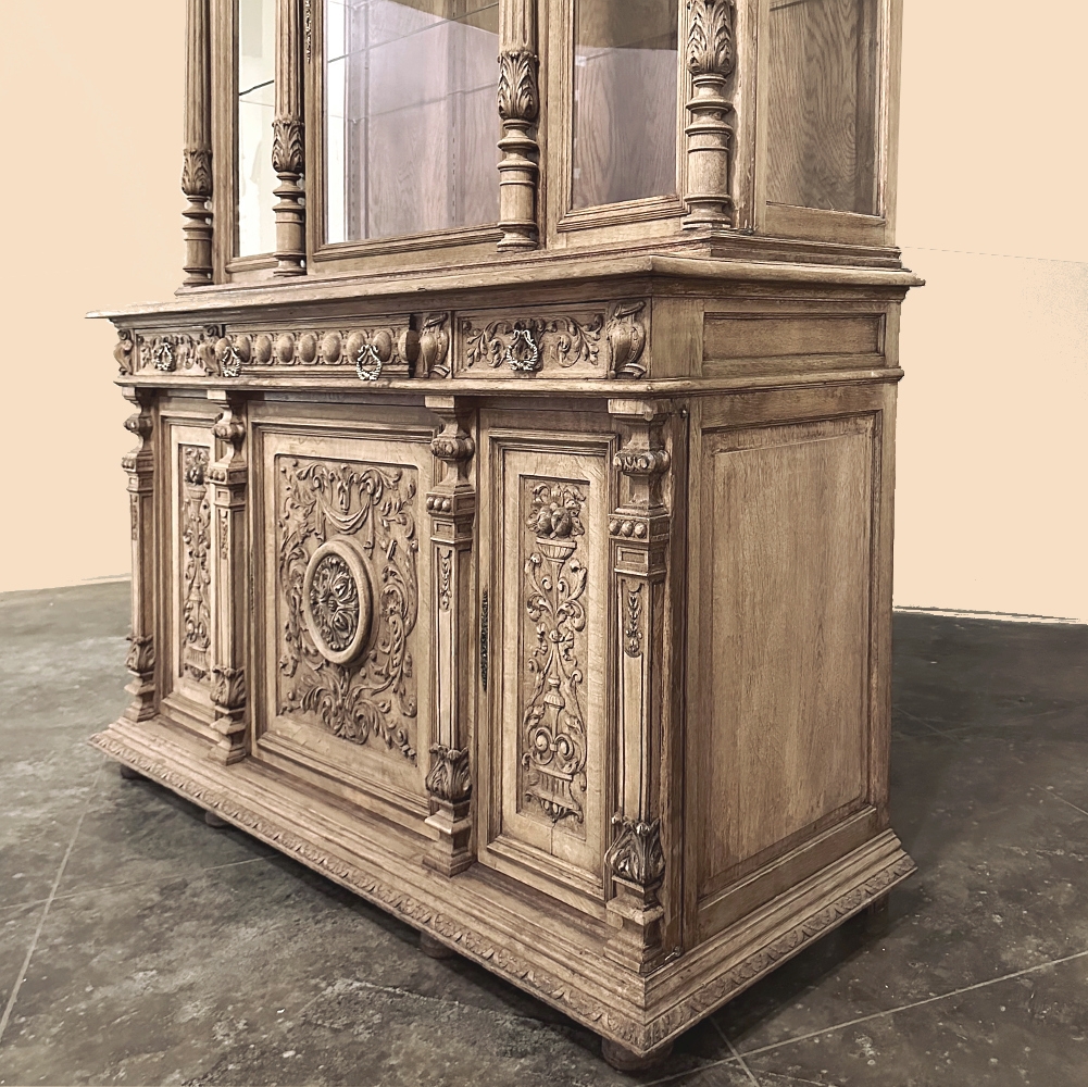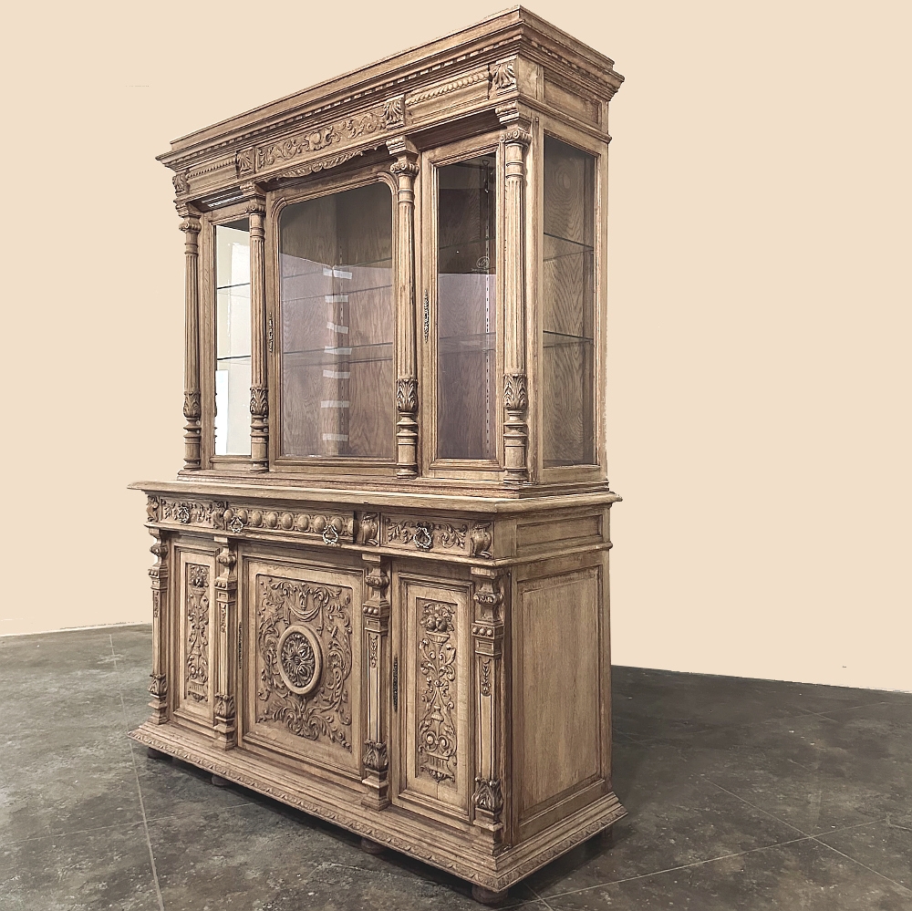 19th Century French Renaissance Bookcase ~ Bibliotheque is a masterpiece of the wood sculptor's art! The timeless architecture features a triple glass door cabinet atop a lower tier that is basically a buffet, combining storage with display in a stunning fashion. The tailored crown molding features subtle dentil over the bonnet which is divided into three sections ~ elongated pediments flanking both sides of a center panel lavished with foliate and heraldic crest carved in full relief. The panels are separated by carved corbels which are positioned above tapered & fluted columns topped with Ionic capitals and resting on bases carved with upturned acanthus plumes, each of which serves to frame the three beveled glass front doors of the upper tier. Glass shelves within take maximum advantage of ambient light. The lower tier juts out to the full depth, and begins with three drawers in a like manner as the architecture of the bonnet above, with relief carved foliates on the left and right, and a Greek coin motif on the center drawer with egg forms accentuating the three dimensionality. The drawers are separated by Baroque medallions in an interesting style departure, which appear above the tapered and carved pilasters below positioned like the columns above to frame the stunning sculpture of the three door panels below. On the left and right are ageless neoclassical designs in bold relief, but the center door ads those themes around a boldly expressed, large acanthus rosette in a circular framework. Demilune carvings appear on the flared base below, supported by bun feet. Solid cast brass key guards and bale pulls provide a special jewelry-like accent, contrasting with the natural beauty of the solid oak, painstakingly stripped by our expert in-house professionals to retain the natural patina.