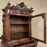 19th Century French Renaissance Bookcase ~ Bibliotheque is a stunning testament to the artistic talents of French sculptors combined with master craftsman cabinetmaking skills. Utilizing hand-select old-growth oak, a two-tiered design was created making it versatile for storing and displaying much more than books ~ your imagination is the only limitation! A fierce lion overlooks the entire work nestled amongst foliate sprays above, flanked by turned finials, all appearing over complex molded detail with full relief carvings on the front and intaglio carvings on the sides, even on the side panels for the main case above and below. The upper tier is centered with a large single door fitted with beveled glass and framed by tapered, fluted and turned columns. The casework below features a drawer and a single door that is the focal point for the entire work, displaying in bold full relief a woodland scene with a covey of quail. Extra bold molding and architectural design provides the framework, and the door opens to reveal capacious storage.