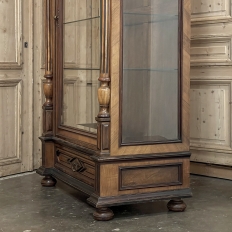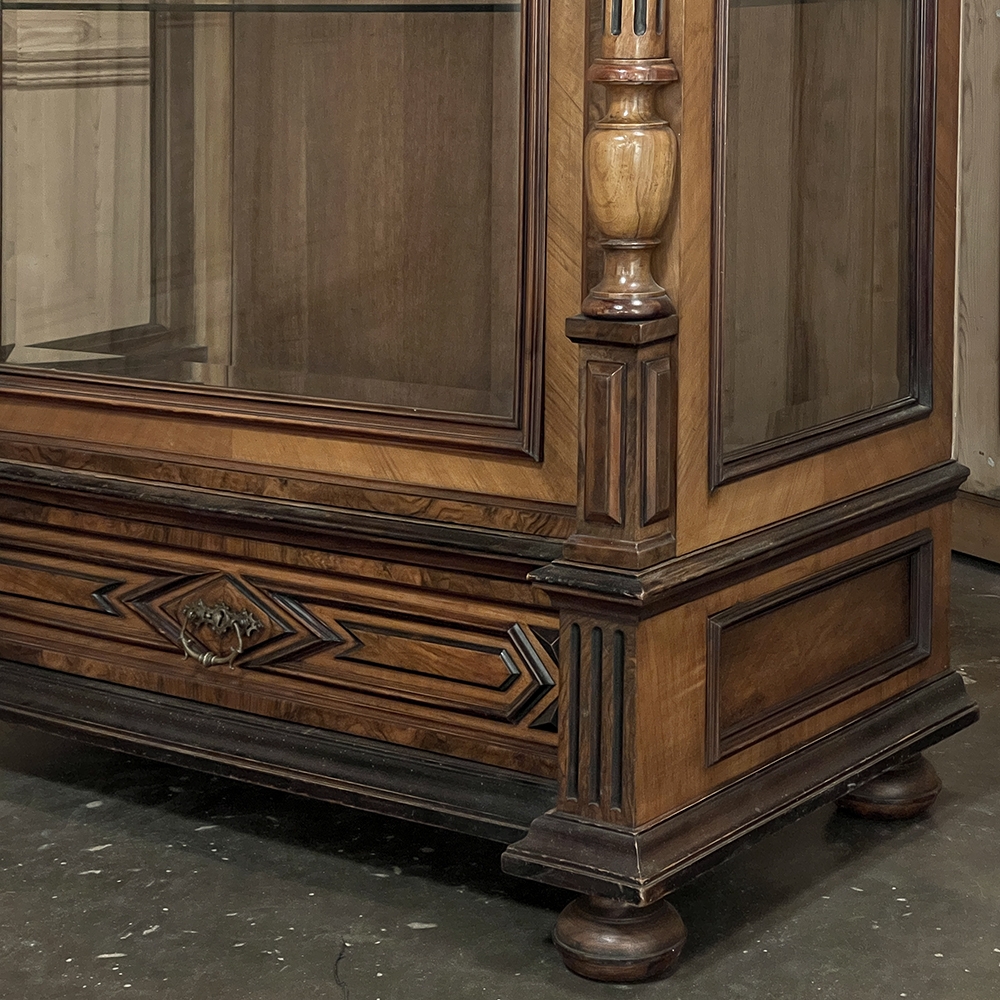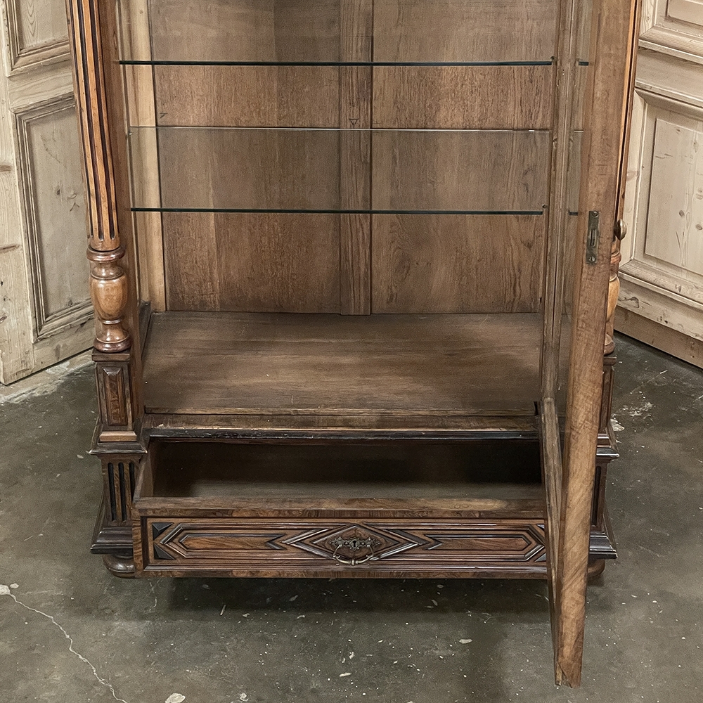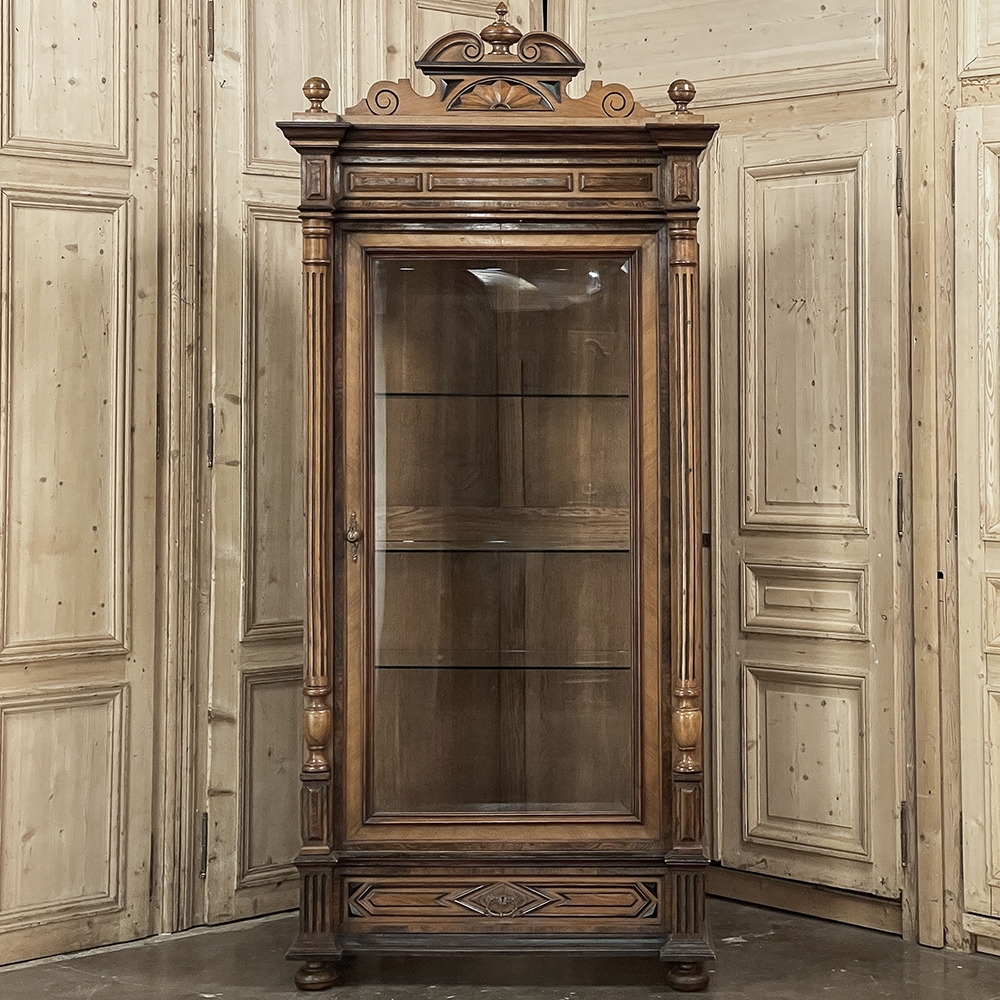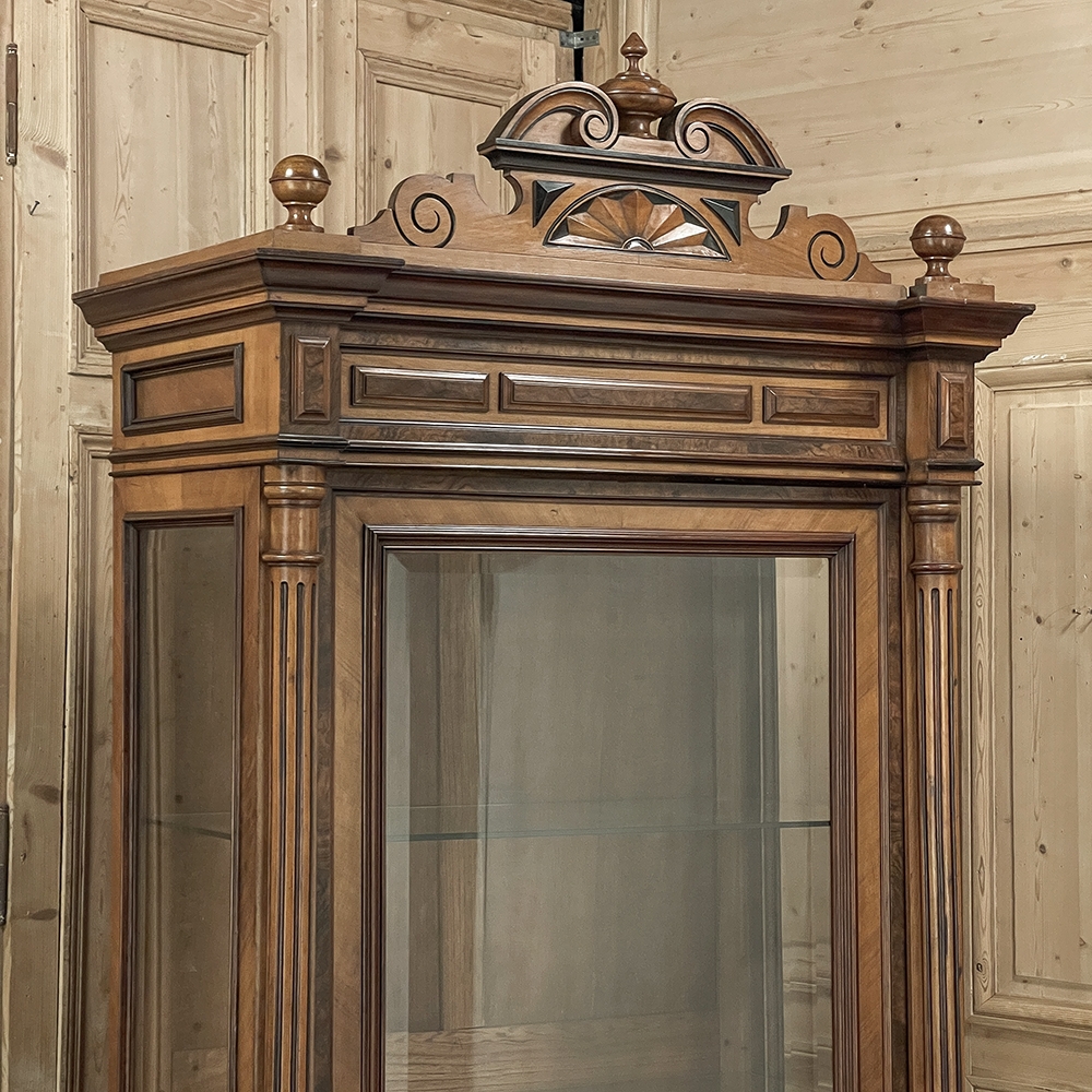 Sale19th Century French Walnut Henri II Bookcase ~ Display Armoire is a splendid example of one of the classic French styles revived during the reign of the country's last monarch, Napoleon III. Rendered from highly prized blonde walnut, it features a lighter and more airy effect with the coloration of the sumptuous wood, accentuated with ebonized molding and accents, plus decorative panels of burl wood for a truly special effect. The architecture is classically inspired, and features a boldly carved crown with scrolls and a spire finial at the center, flanked by orb finials on each corner. The intricately molded bonnet below includes framed panels on the sides with raised panel accents across the front. The bonnet overlooks the glazed casework below, with original beveled glass full length on each side, and fitted into the door which sports a brass pull and guard. The door opens to reveal three glass shelves and a floor, perfect for display, with plenty of ambient light affording a wonderful view of your prized possessions. Below the display space is a full width drawer, accented with diagonal molding and a brass bale pull with guard. The corners feature half-columns fluted and turned in an urn form over a plinth block above a fluted base, with fine molding and bun feet completing the look.