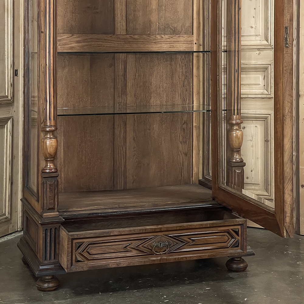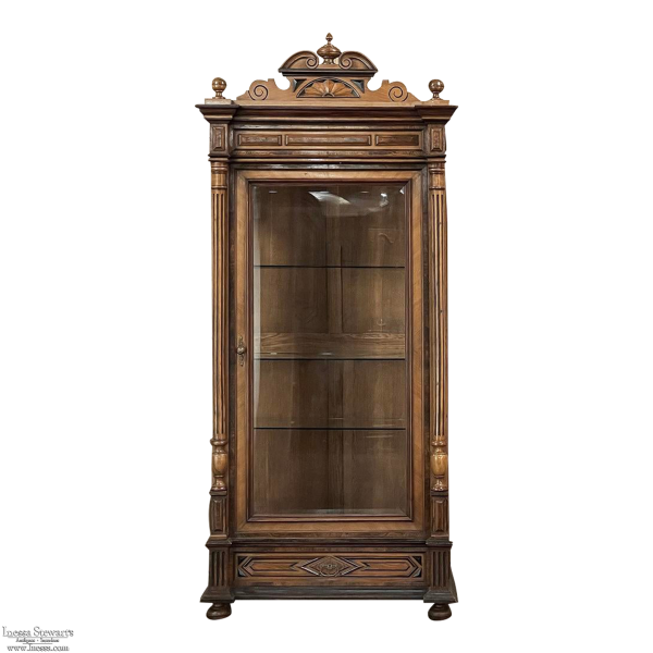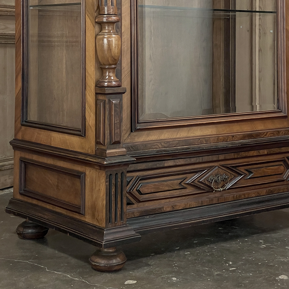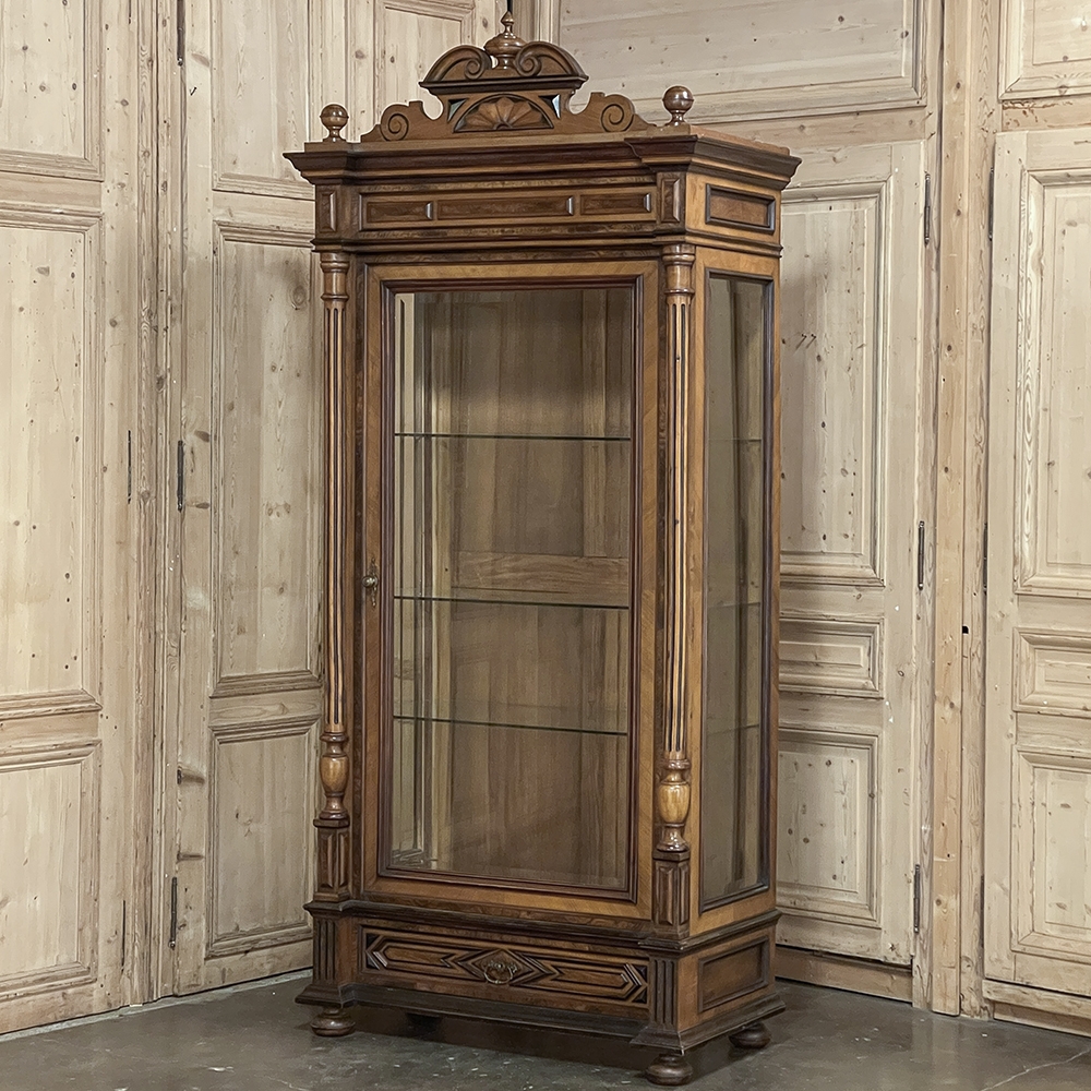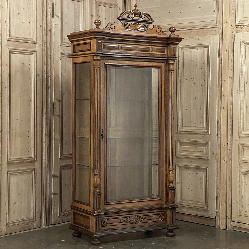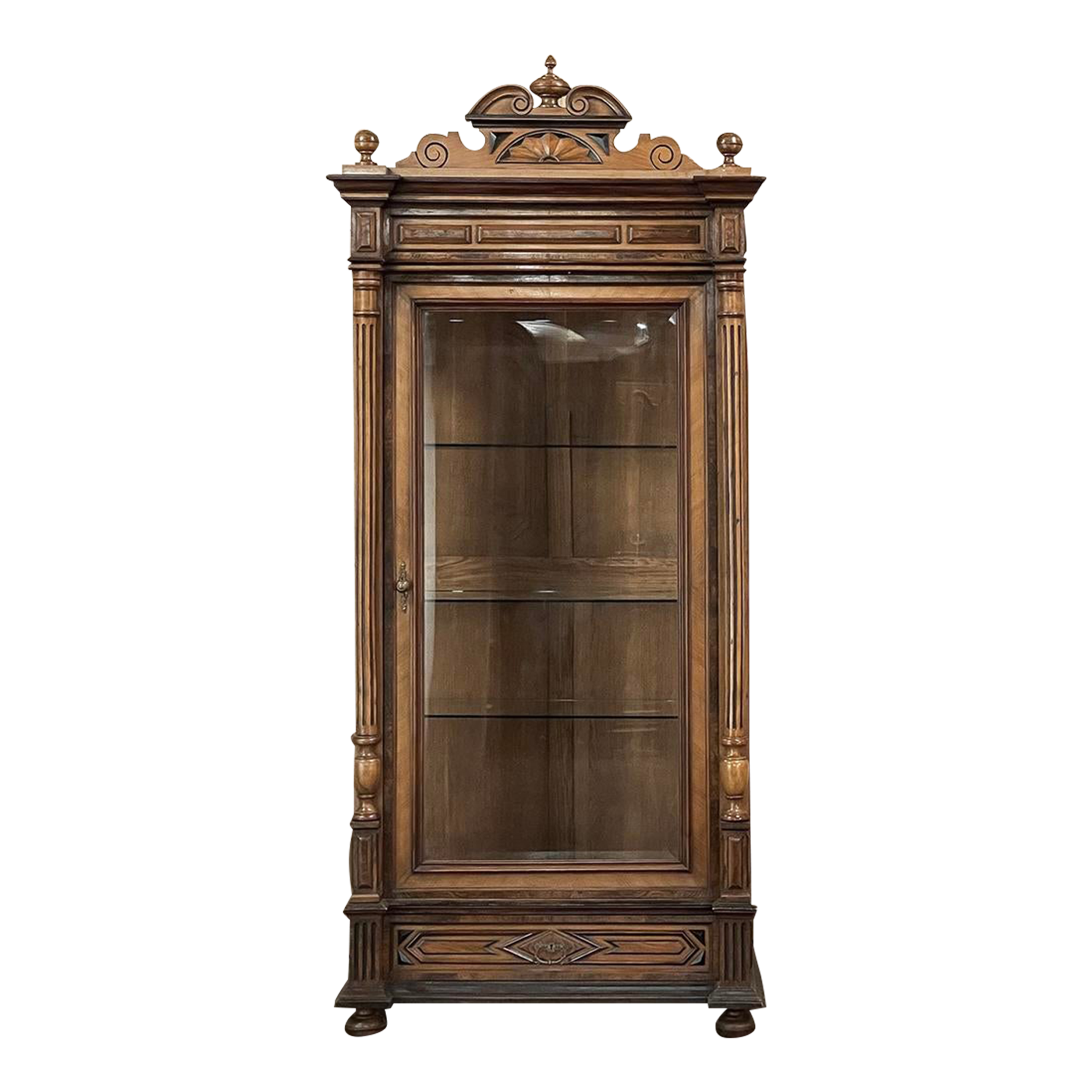Sale19th Century French Walnut Henri II Bookcase ~ Display Armoire is a splendid example of one of the classic French styles revived during the reign of the country's last monarch, Napoleon III. Rendered from highly prized blonde walnut, it features a lighter and more airy effect with the coloration of the sumptuous wood, accentuated with ebonized molding and accents, plus decorative panels of burl wood for a truly special effect. The architecture is classically inspired, and features a boldly carved crown with scrolls and a spire finial at the center, flanked by orb finials on each corner. The intricately molded bonnet below includes framed panels on the sides with raised panel accents across the front. The bonnet overlooks the glazed casework below, with original beveled glass full length on each side, and fitted into the door which sports a brass pull and guard. The door opens to reveal three glass shelves and a floor, perfect for display, with plenty of ambient light affording a wonderful view of your prized possessions. Below the display space is a full width drawer, accented with diagonal molding and a brass bale pull with guard. The corners feature half-columns fluted and turned in an urn form over a plinth block above a fluted base, with fine molding and bun feet completing the look.