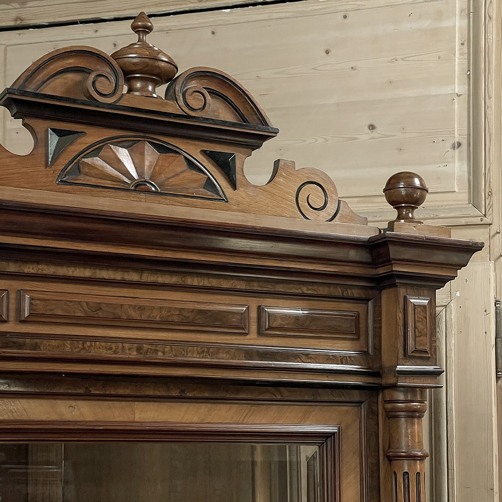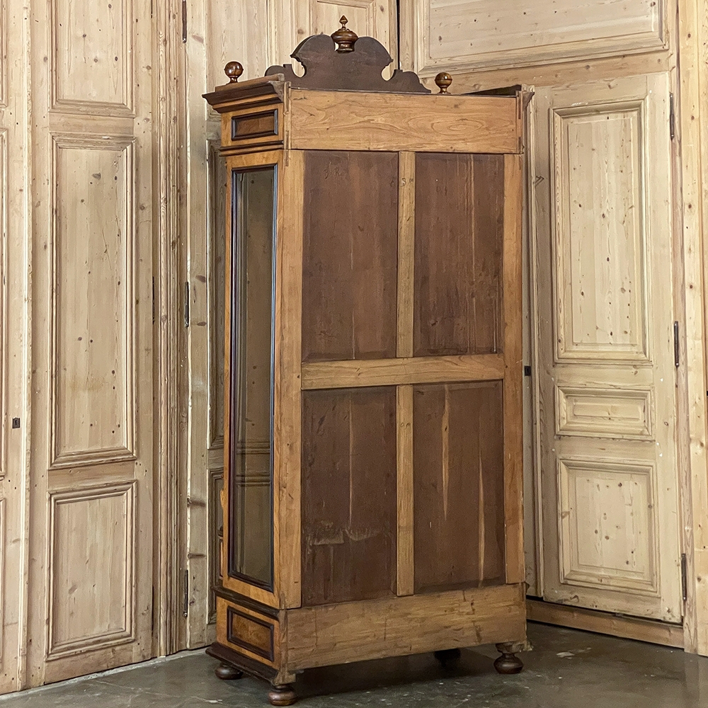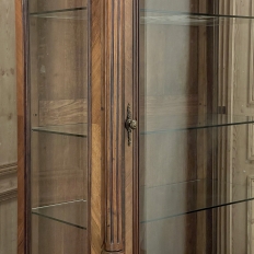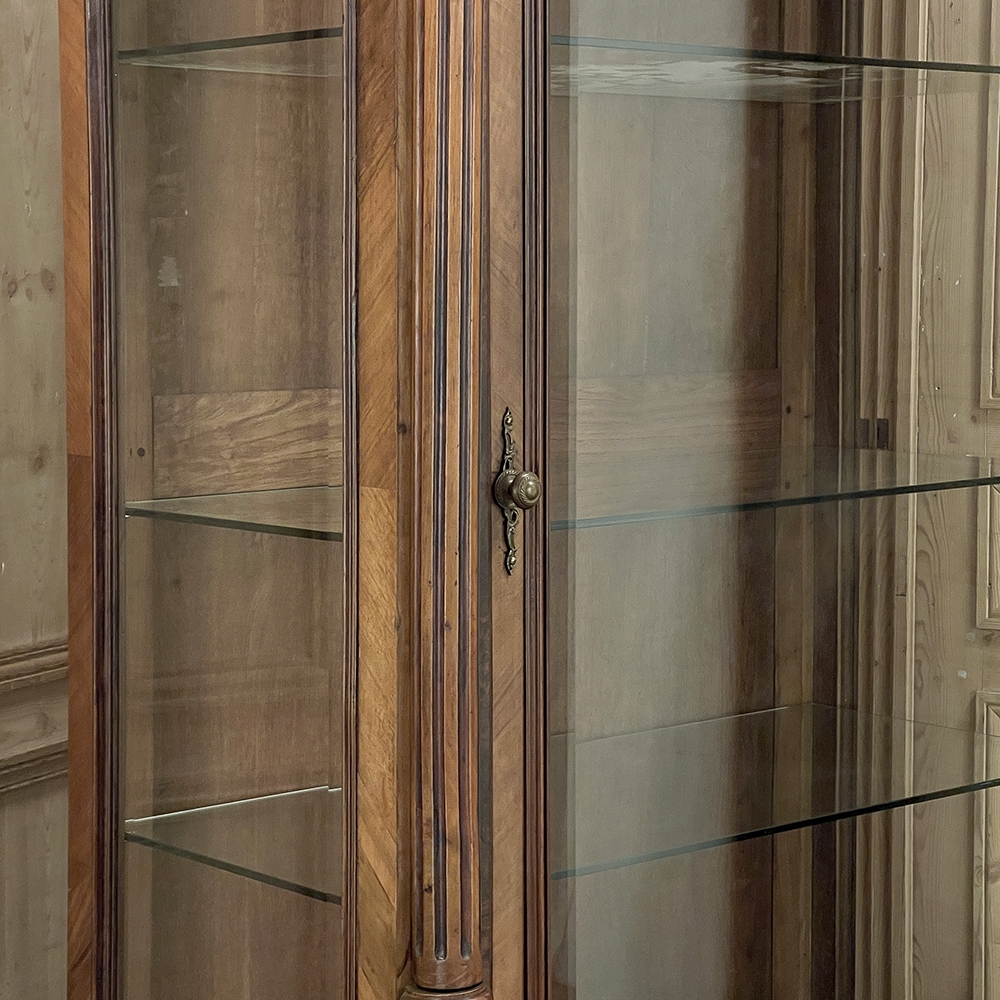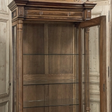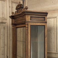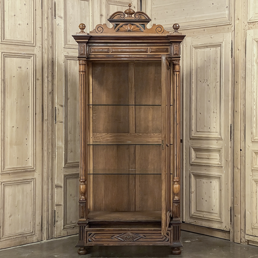 Sale19th Century French Walnut Henri II Bookcase ~ Display Armoire is a splendid example of one of the classic French styles revived during the reign of the country's last monarch, Napoleon III. Rendered from highly prized blonde walnut, it features a lighter and more airy effect with the coloration of the sumptuous wood, accentuated with ebonized molding and accents, plus decorative panels of burl wood for a truly special effect. The architecture is classically inspired, and features a boldly carved crown with scrolls and a spire finial at the center, flanked by orb finials on each corner. The intricately molded bonnet below includes framed panels on the sides with raised panel accents across the front. The bonnet overlooks the glazed casework below, with original beveled glass full length on each side, and fitted into the door which sports a brass pull and guard. The door opens to reveal three glass shelves and a floor, perfect for display, with plenty of ambient light affording a wonderful view of your prized possessions. Below the display space is a full width drawer, accented with diagonal molding and a brass bale pull with guard. The corners feature half-columns fluted and turned in an urn form over a plinth block above a fluted base, with fine molding and bun feet completing the look.