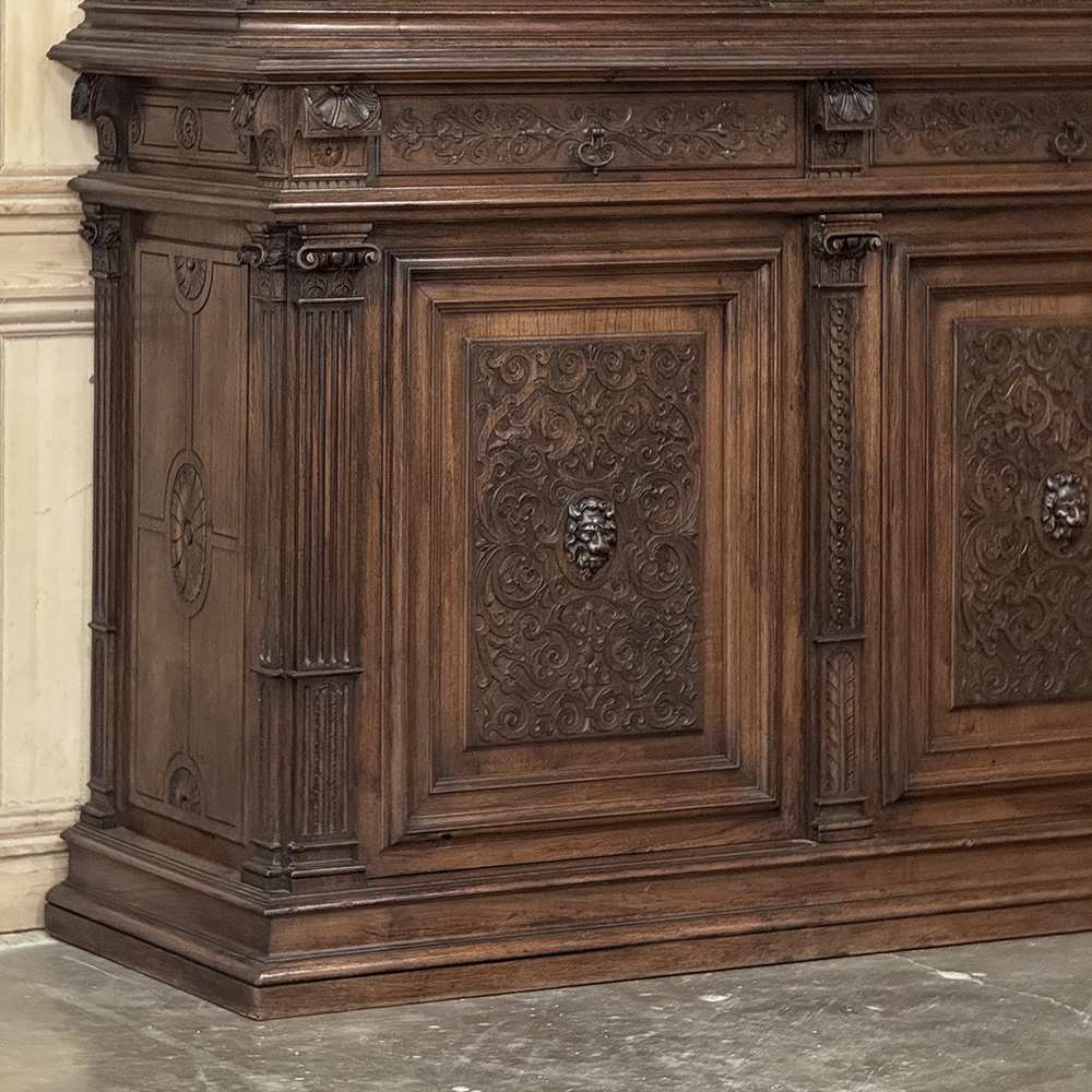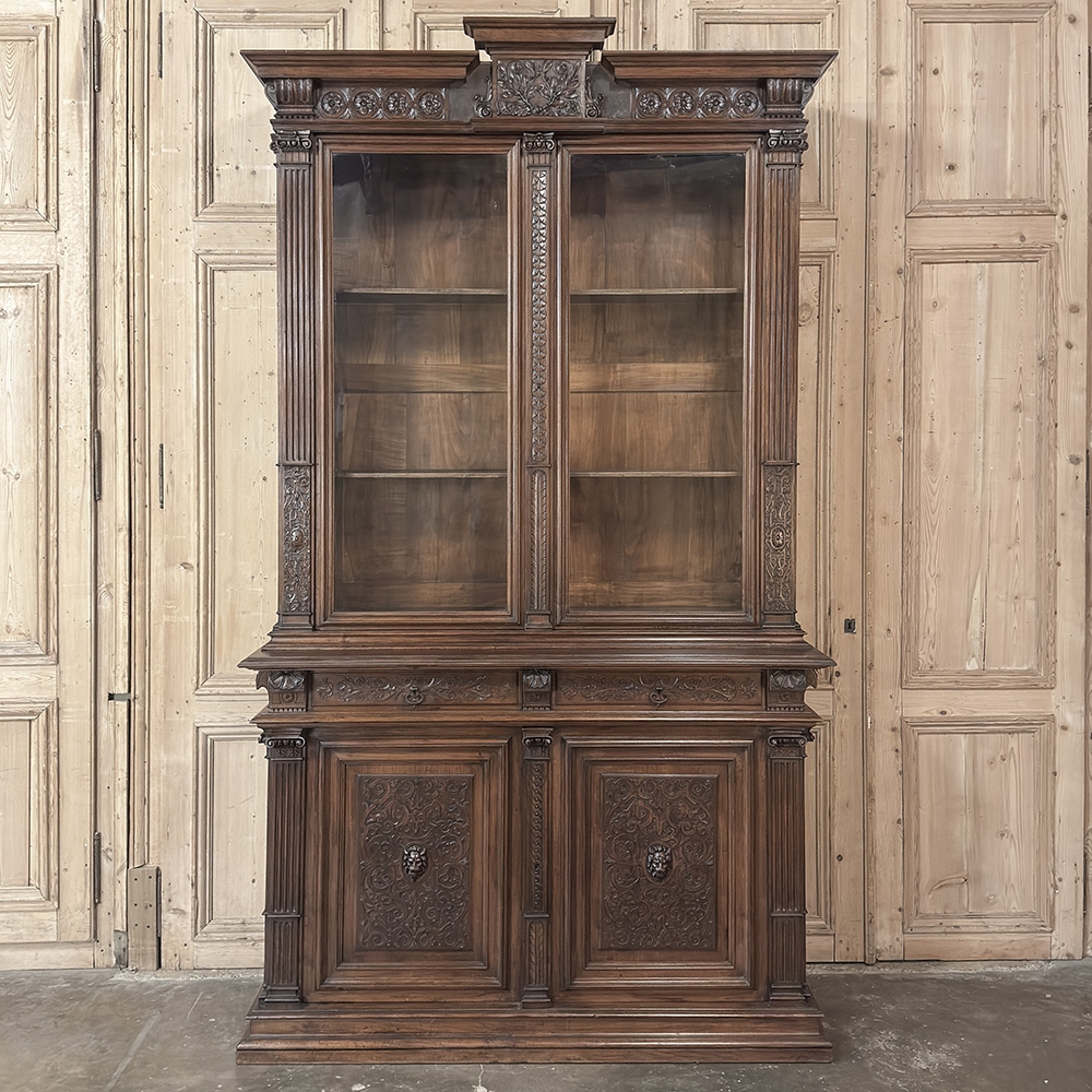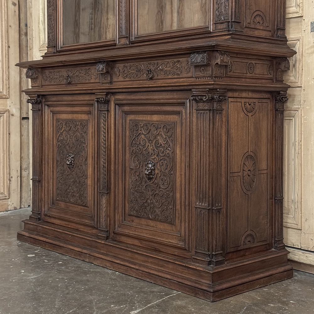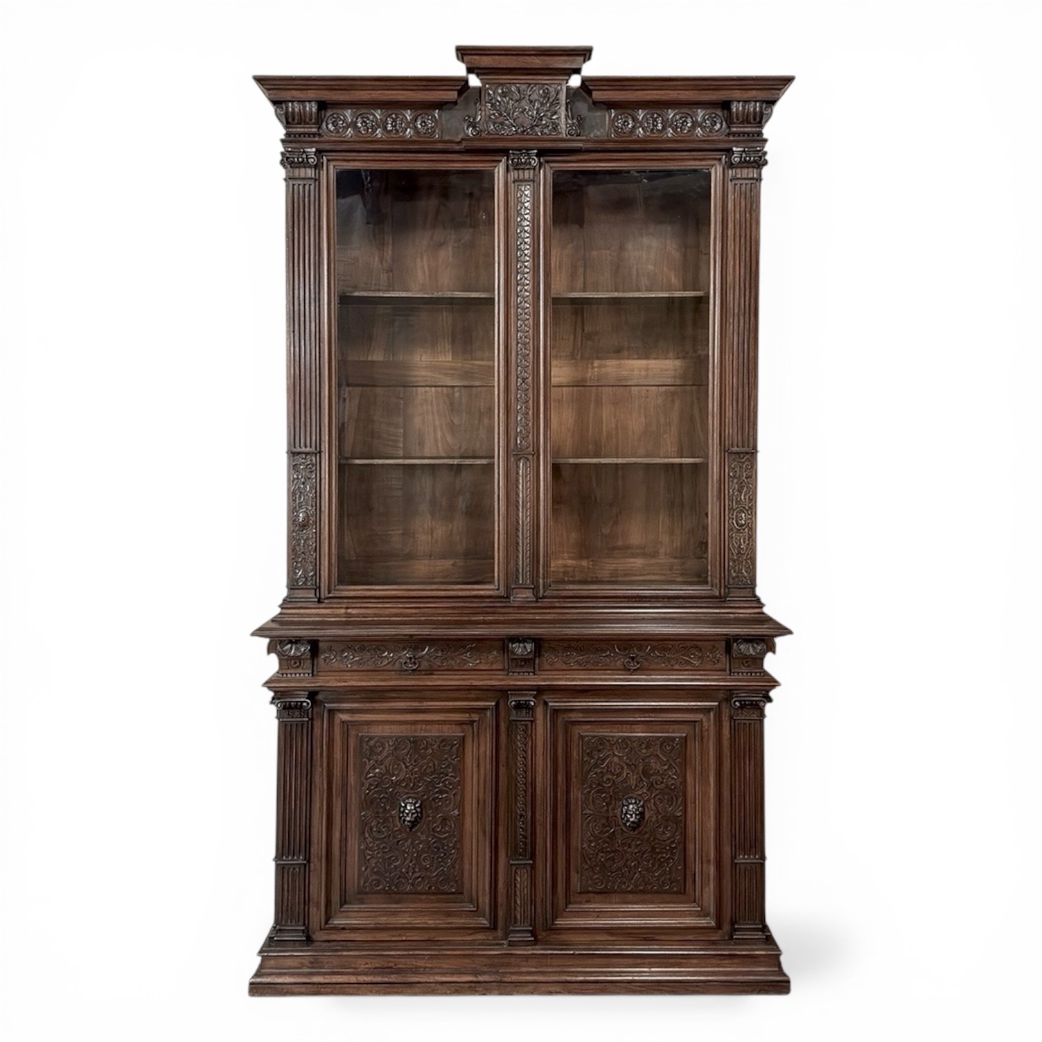 Executed in the Henry II style of the 19th century, it reflects the architectural influence of the French Renaissance, with fluted pilasters, a carved frieze, and deeply paneled doors adorned with intricate relief work. The upper glass-fronted cabinet provides an elegant display, while the lower section adds weight and presence with its bold carving and balanced proportions.