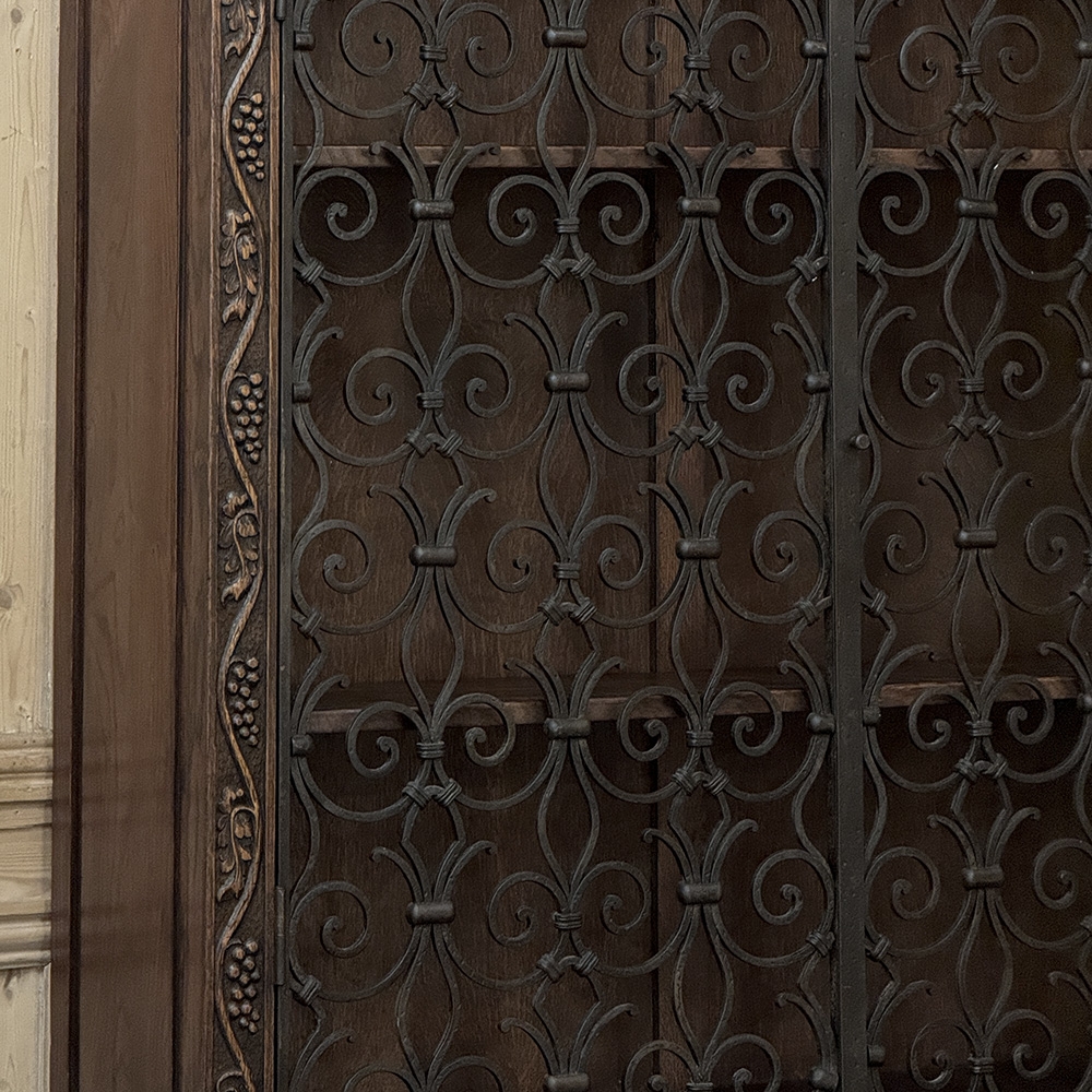 Antique French Gothic & Wrought Iron Bookcase ~ Bibliotheque from Toulouse is a beautifully crafted piece from southwestern France displaying an obvious influence of Spanish design being close to that border. The architecture reflects a refined interpretation of the Gothic tradition. The doors are entirely hand-forged wrought iron, constructed in the manner of decorative gates and fitted directly into the oak case. The design features a classic fleur-de-lis motif, a timeless symbol in French decorative arts, giving the façade a strong timeless presence and unmistakable character. Shelves within are mounted on adjustable brackets.