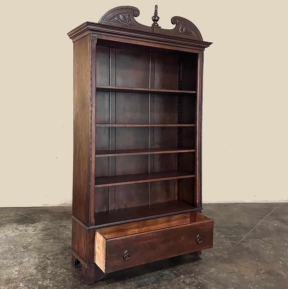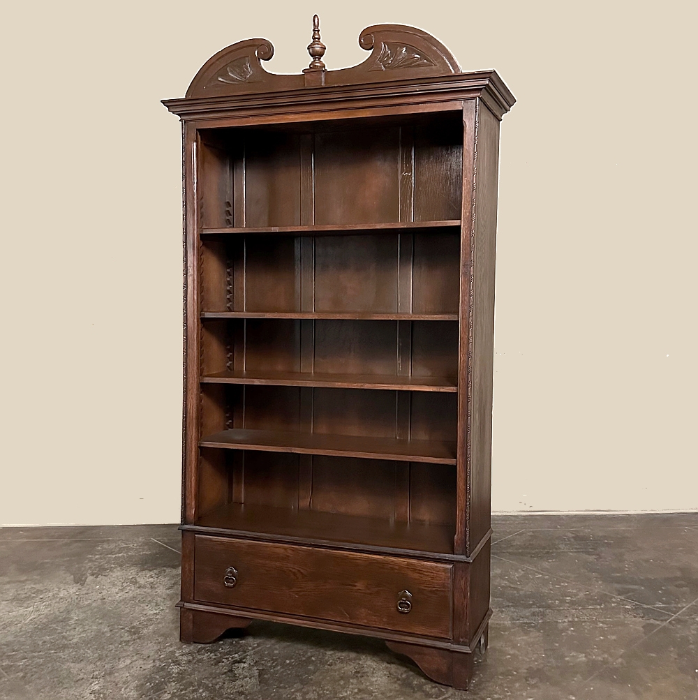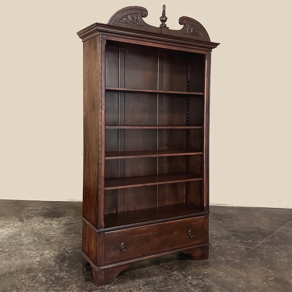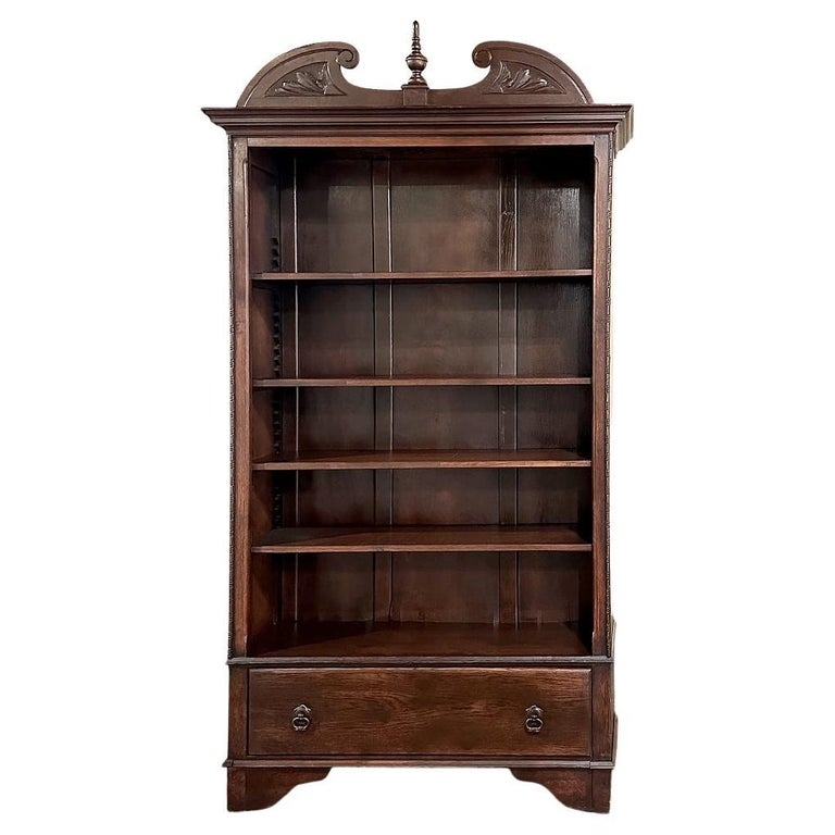 SaleAntique French Henri II Neoclassical Open Bookcase represents a tailored expression of the neoclassical revival style that has persevered for century after century! Crafted from solid oak, its most notable visual feature is the double arched crown on top, subtly carved with acanthus foliates and centered with a turned finial. The tailored crown molding is indicative of the overall style effect, with a pediment style base just above the deep, full width drawer. Four adjustable shelves create five surfaces with the bottom fixed shelf, allowing one hundreds of configuration combinations to fit your books, family memorabilia, trophies, collectibles or whatever you wish to display!