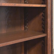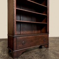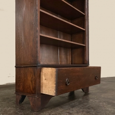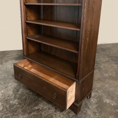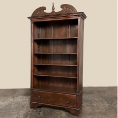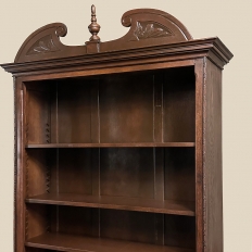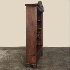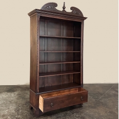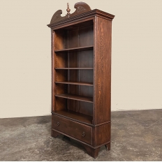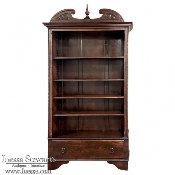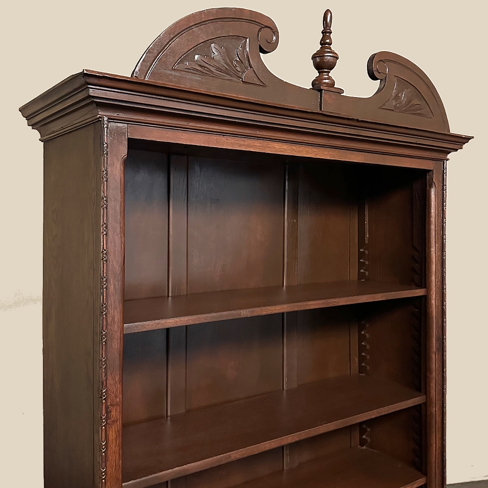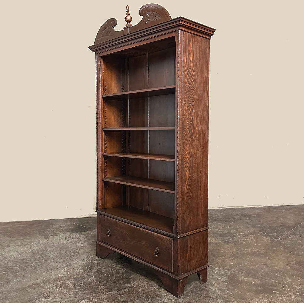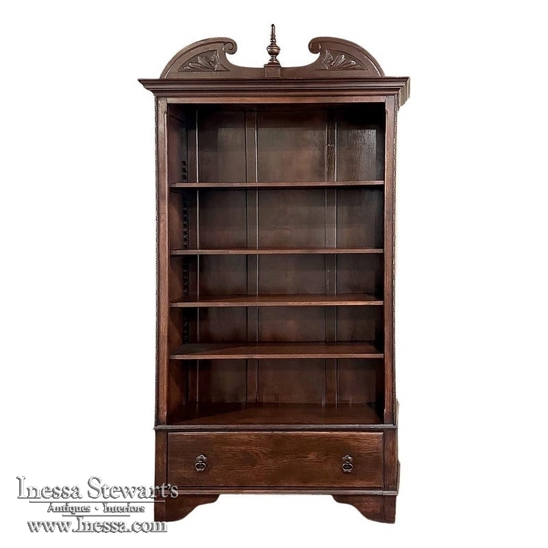 SaleAntique French Henri II Neoclassical Open Bookcase represents a tailored expression of the neoclassical revival style that has persevered for century after century! Crafted from solid oak, its most notable visual feature is the double arched crown on top, subtly carved with acanthus foliates and centered with a turned finial. The tailored crown molding is indicative of the overall style effect, with a pediment style base just above the deep, full width drawer. Four adjustable shelves create five surfaces with the bottom fixed shelf, allowing one hundreds of configuration combinations to fit your books, family memorabilia, trophies, collectibles or whatever you wish to display!