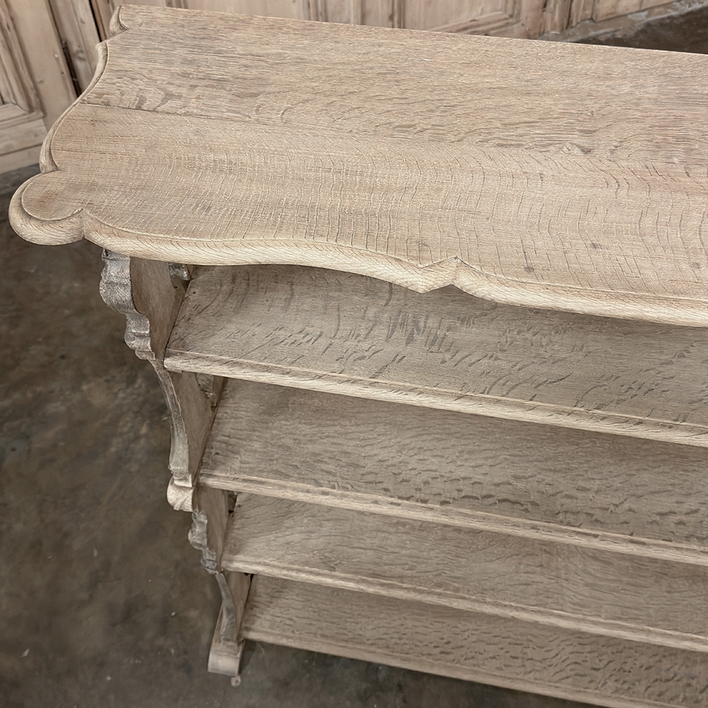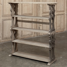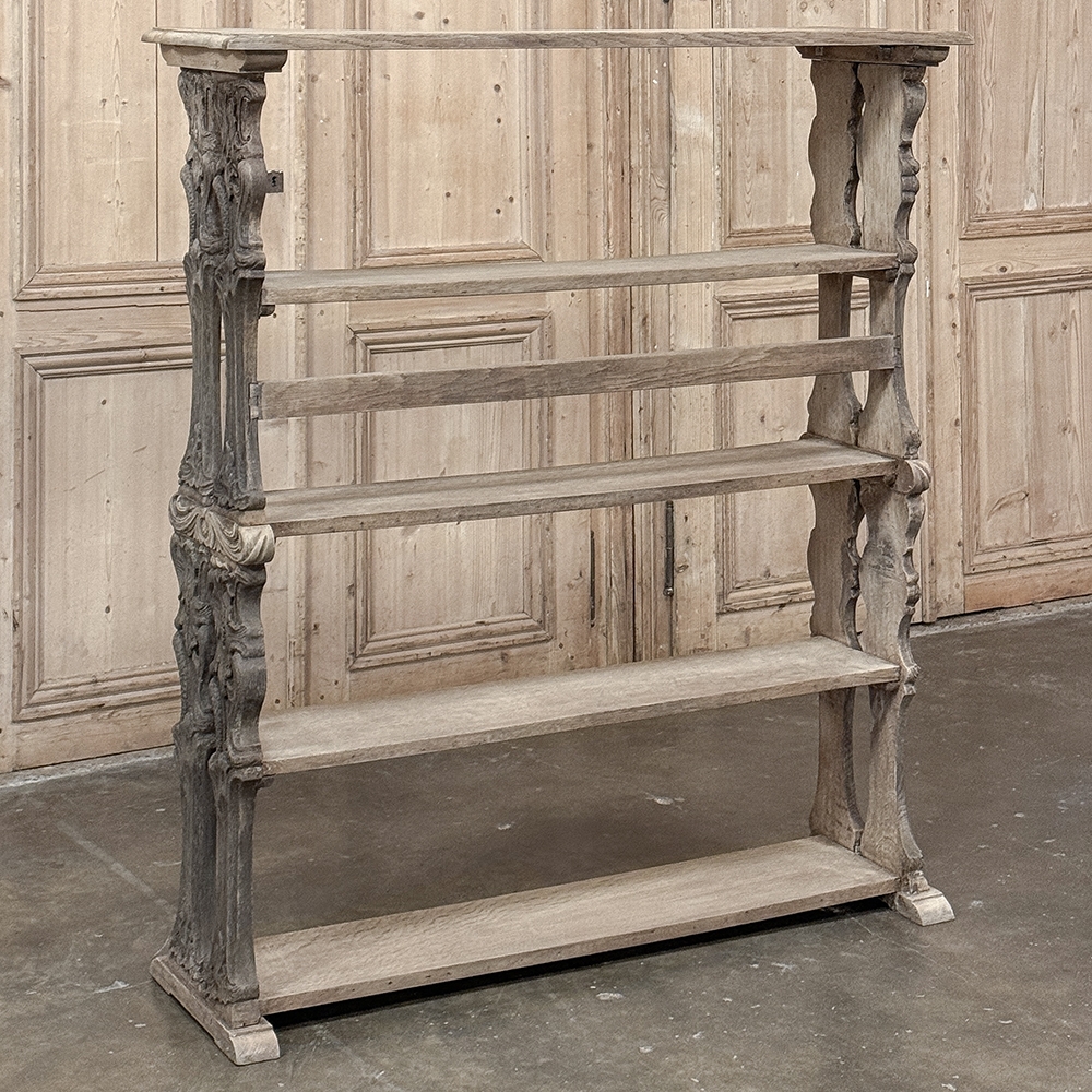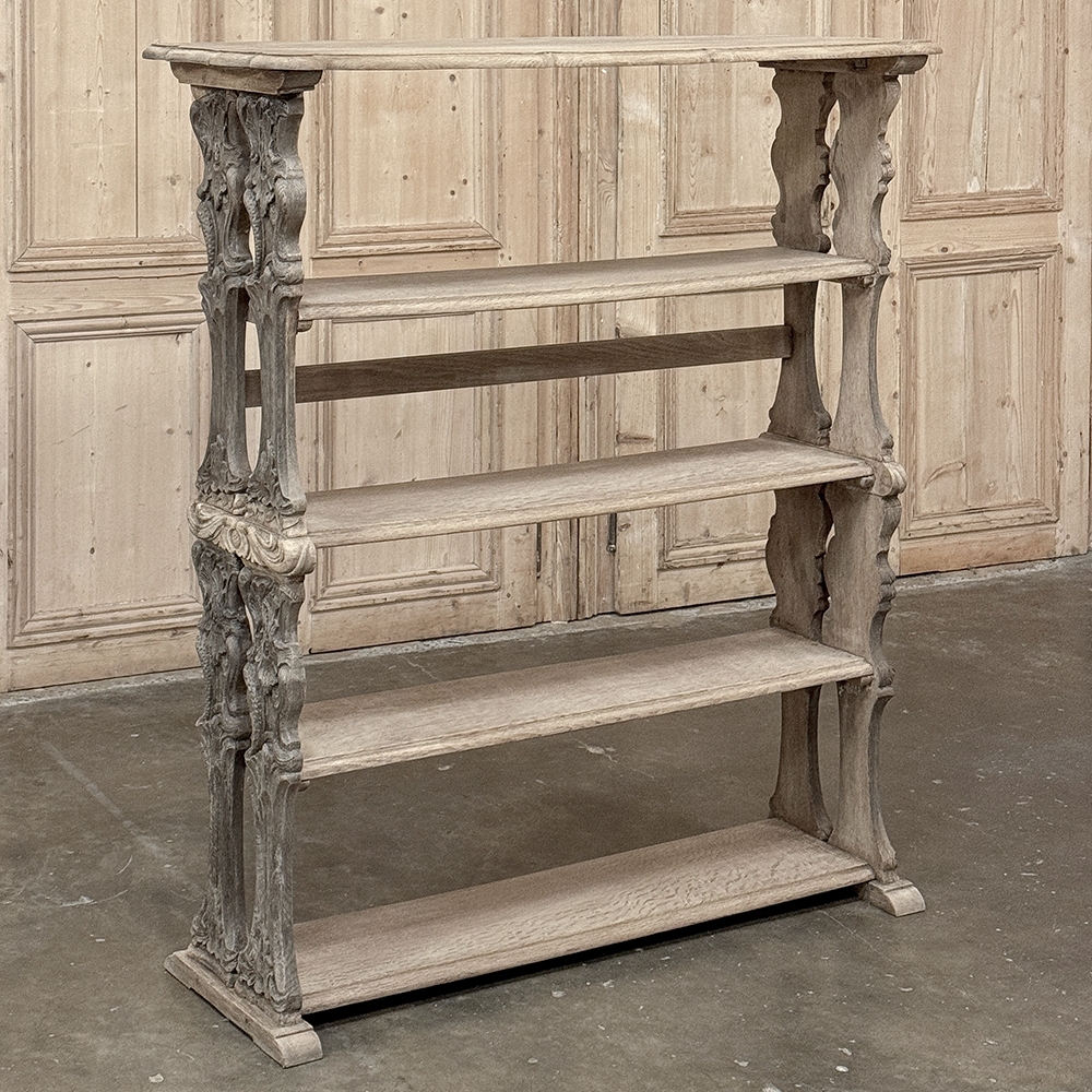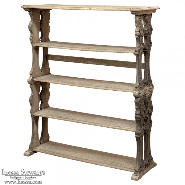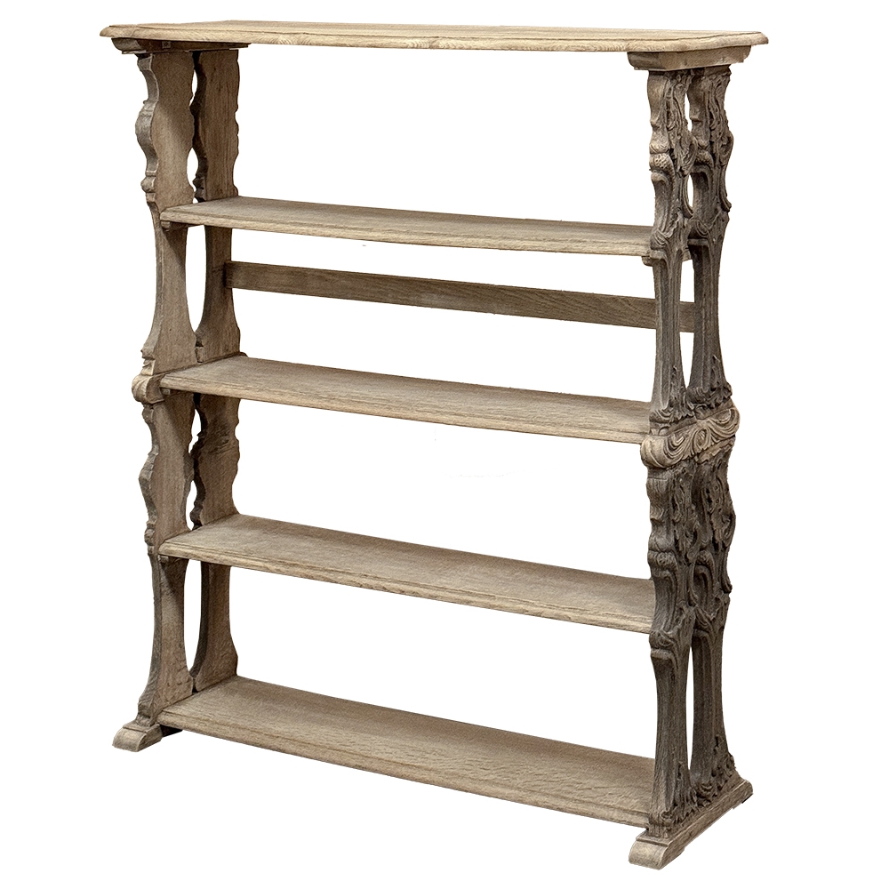 Antique French Renaissance Open Bookcase in Stripped Oak is the perfect choice for a compact, shallow bookshelf that takes up a minimal amount of floor space yet is capable of holding dozens of books for your instant access! Hand-crafted from solid old-growth oak are the intriguing side supports that date to the mid-19th century, carved by a master artisan in stylized naturalistic form using shell and foliage as models. At some point early last century they were combined into the framework you see here, with a contoured and beveled top and four shelves added for a total of five surfaces including the top, with its beautifully scrolled edging. Meticulously hand-crafted to repurpose the carvings, it is an ideal piece for cozy offices, hallways, or anywhere one needs display space or book storage. The stripped oak finish is the perfect accompaniment to your casual decor, while simultaneously glorifying the sheer natural beauty and patina of the wood.