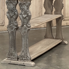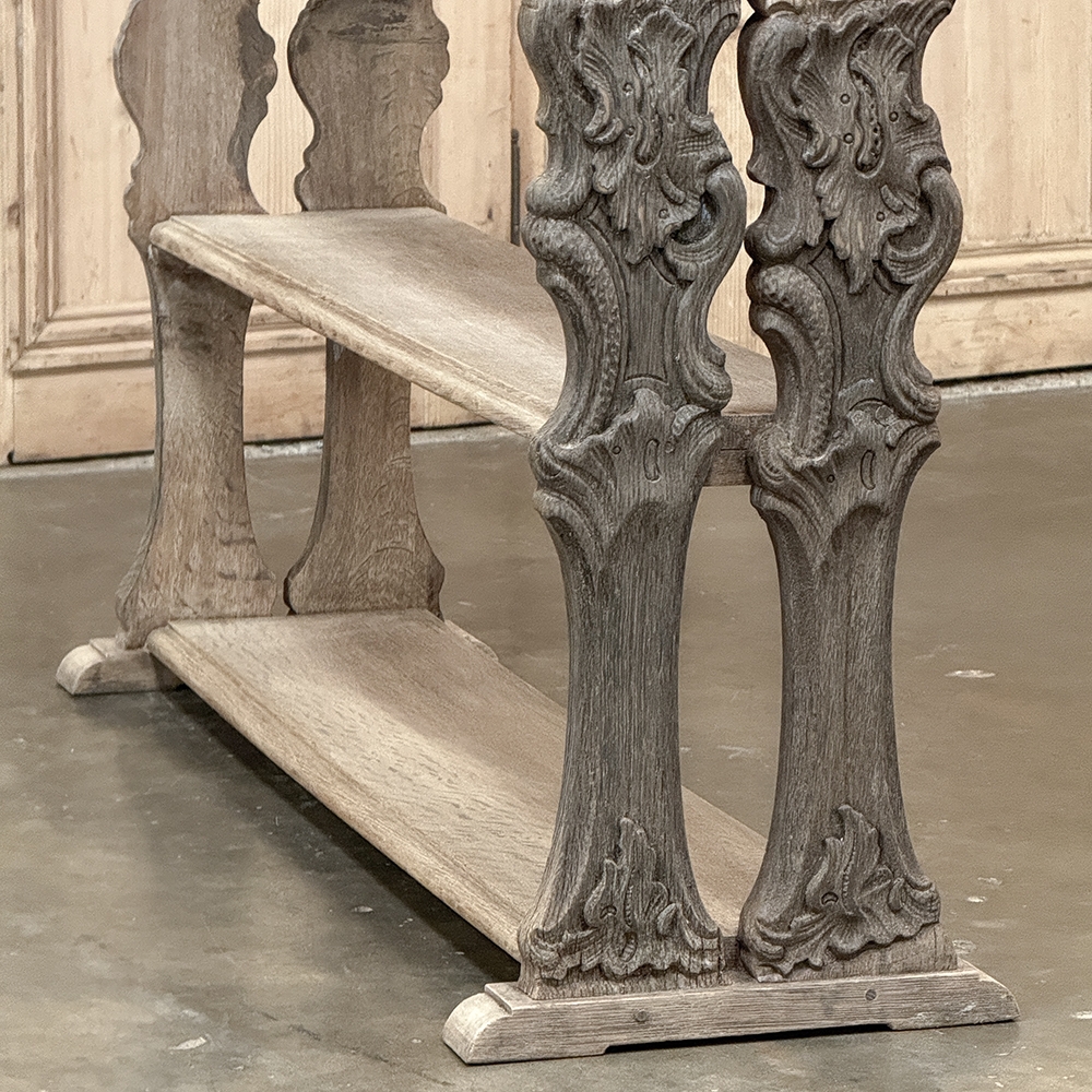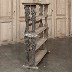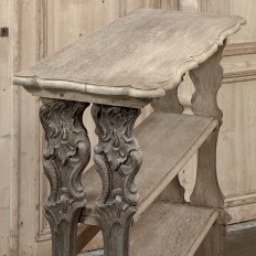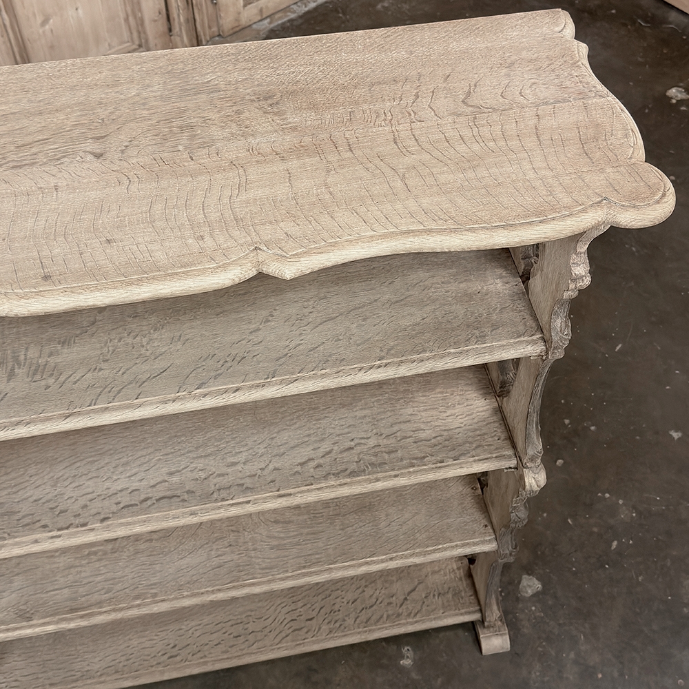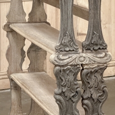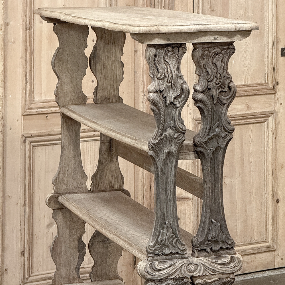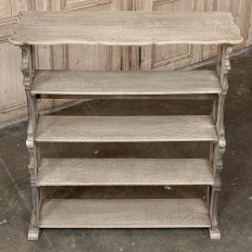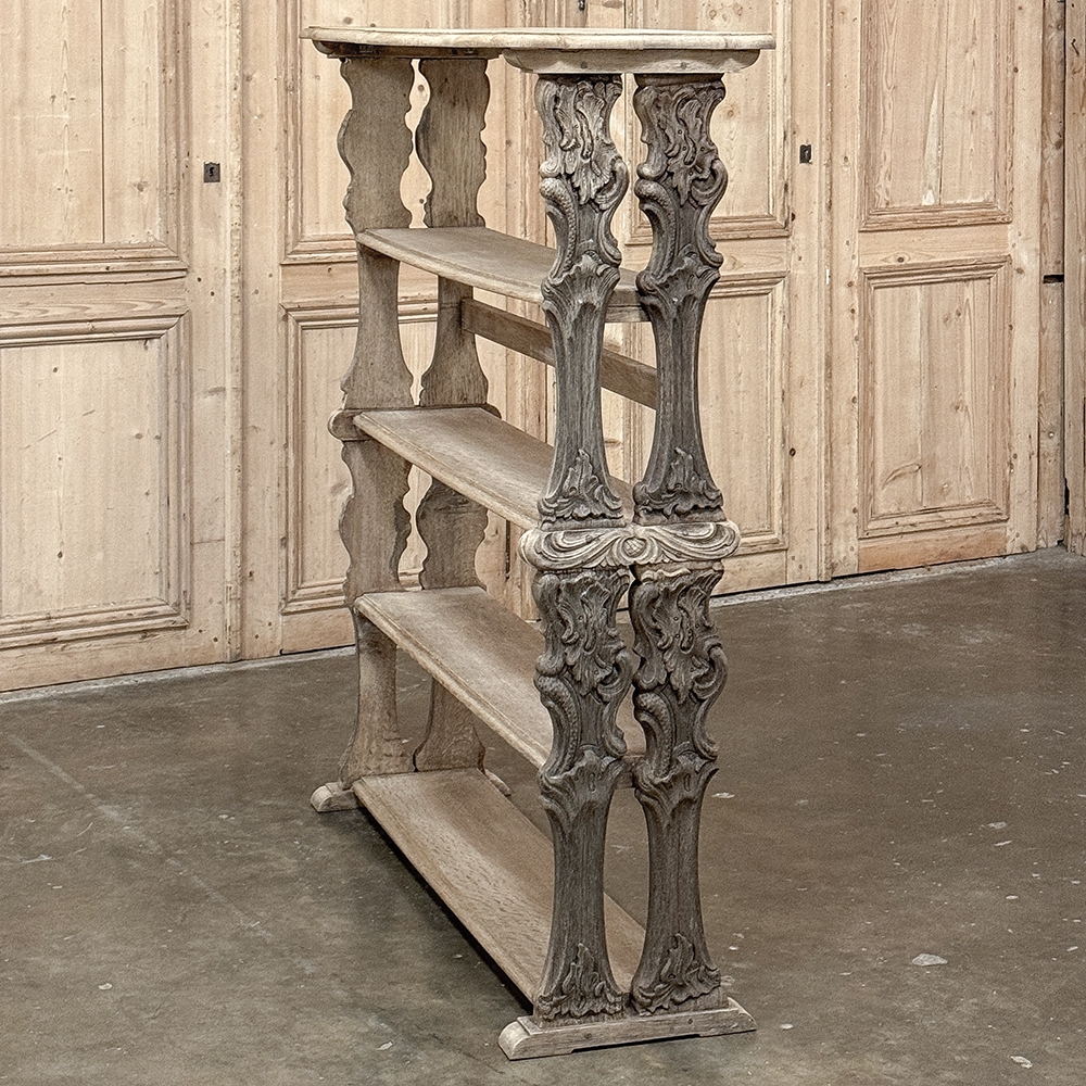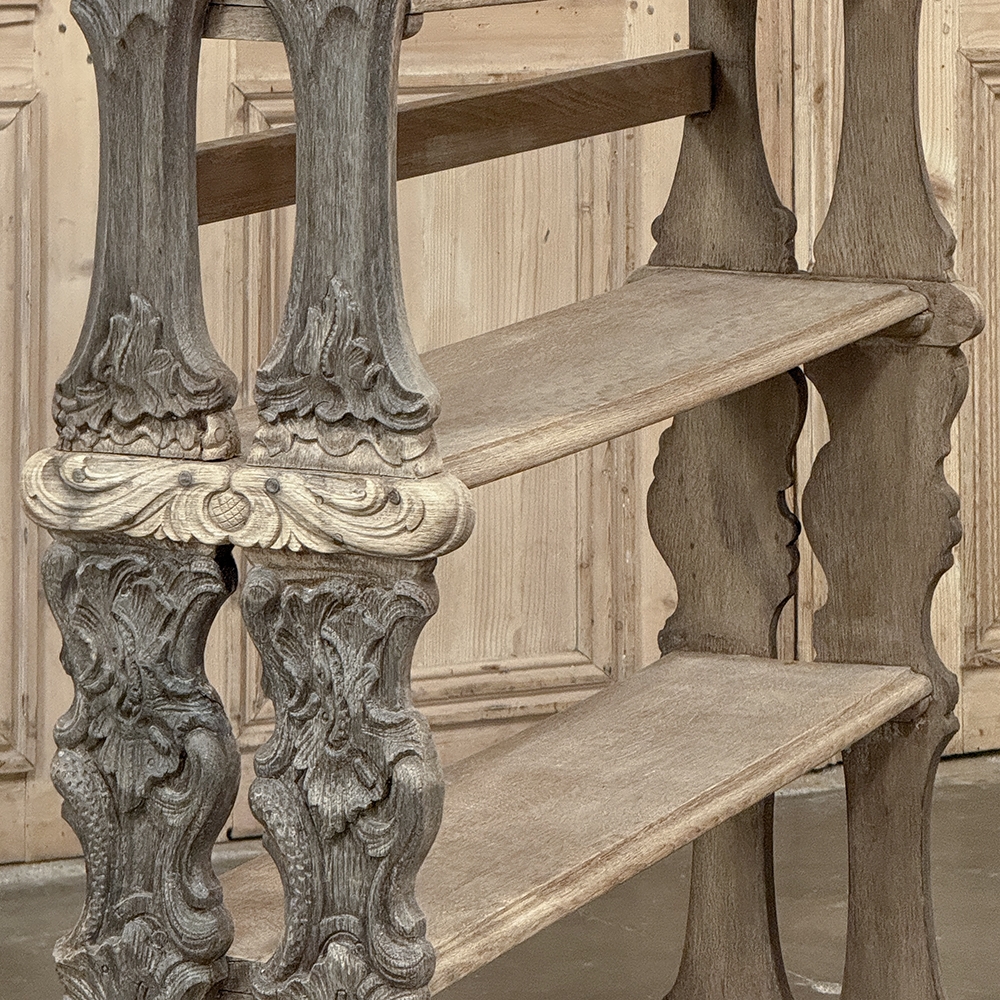 Antique French Renaissance Open Bookcase in Stripped Oak is the perfect choice for a compact, shallow bookshelf that takes up a minimal amount of floor space yet is capable of holding dozens of books for your instant access! Hand-crafted from solid old-growth oak are the intriguing side supports that date to the mid-19th century, carved by a master artisan in stylized naturalistic form using shell and foliage as models. At some point early last century they were combined into the framework you see here, with a contoured and beveled top and four shelves added for a total of five surfaces including the top, with its beautifully scrolled edging. Meticulously hand-crafted to repurpose the carvings, it is an ideal piece for cozy offices, hallways, or anywhere one needs display space or book storage. The stripped oak finish is the perfect accompaniment to your casual decor, while simultaneously glorifying the sheer natural beauty and patina of the wood.