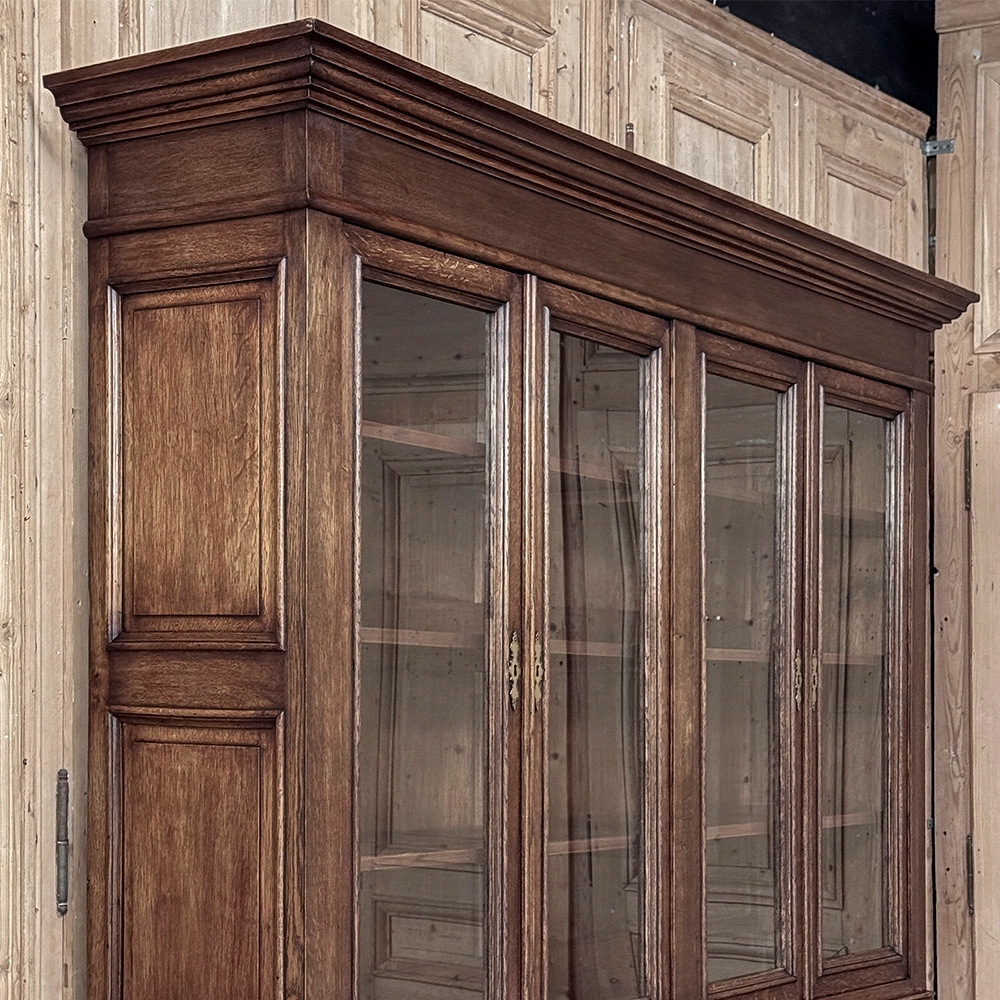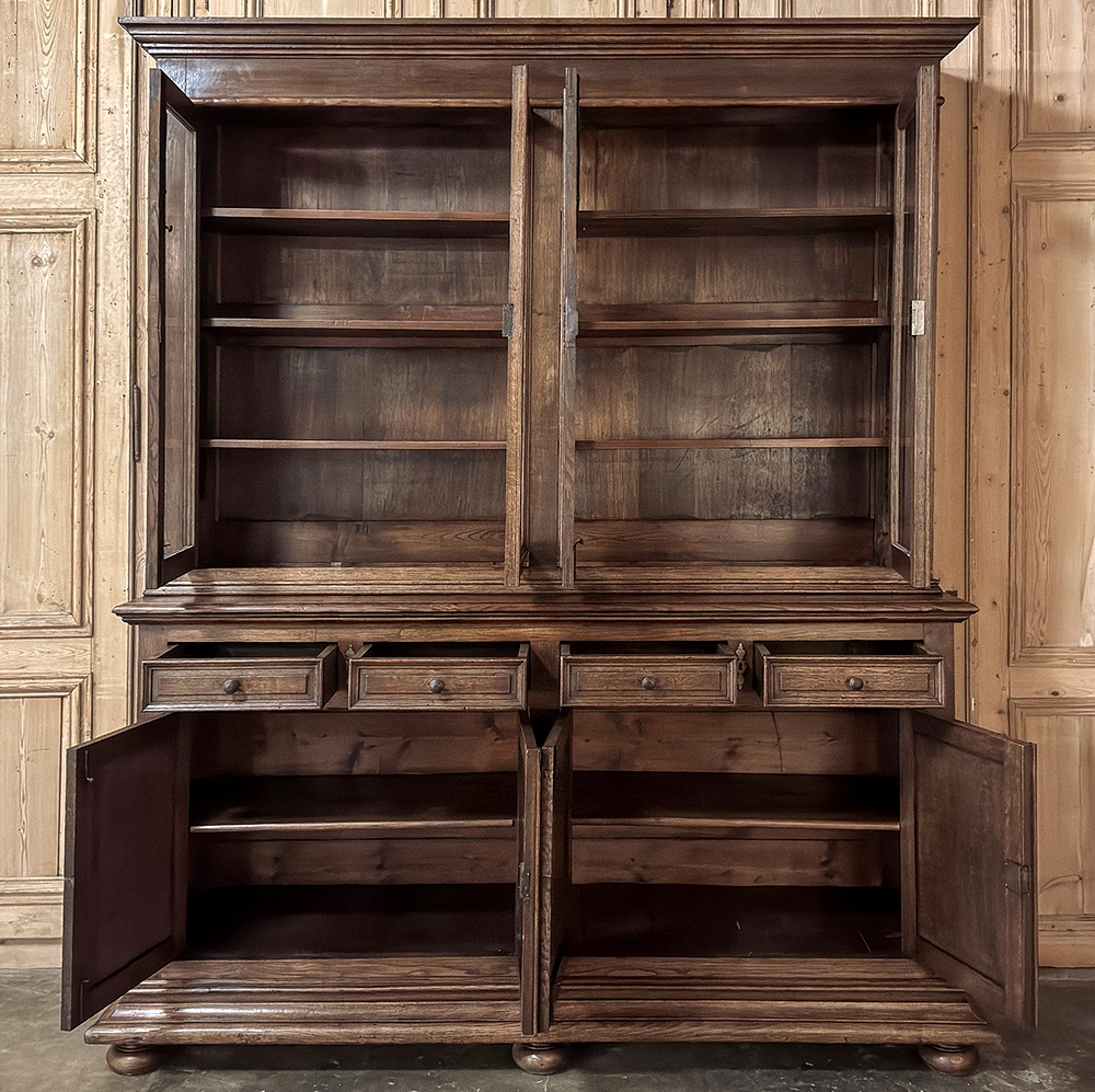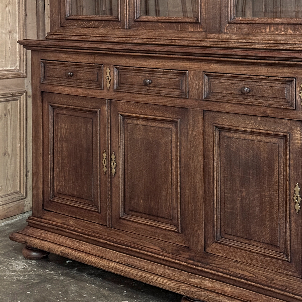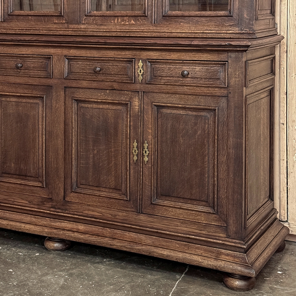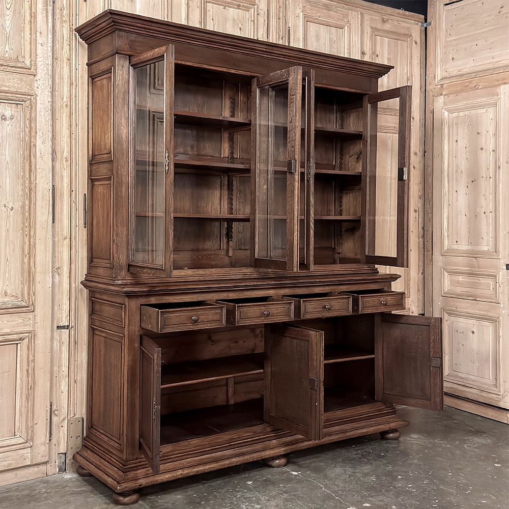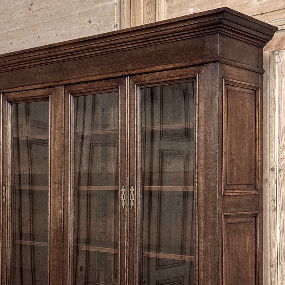 Grand 19th Century French Louis Philippe Bookcase ~ Bibliotheque was a product of talented craftsmen using traditional time-honored methods and the result of a tailored style that has proven to remain popular for what will be two centuries in just another couple of decades. Using dense, old-growth indigenous oak, the artisans created a strong crown over the upper tier, which consists of four glazed doors providing access to and a view of the interior, augmented by four adjustable shelves for a total of five display surfaces. The base below projects out a bit providing a convenient temporary work surface at 42 inches high, underneath appears four drawers and as many cabinets, all rendered in the same tailored, timeless style. When open, the piece has a cavernous storage capability. Bold base molding and bun feet provide support, while brass key guards and pulls complete the look.