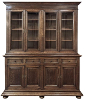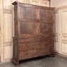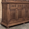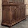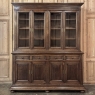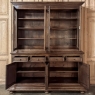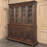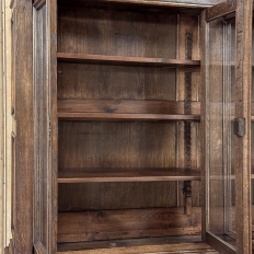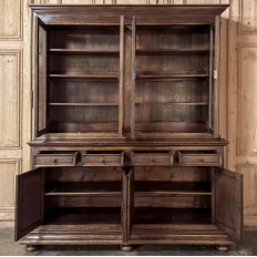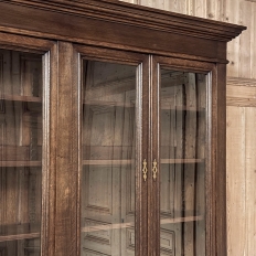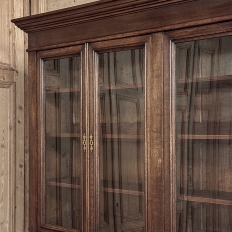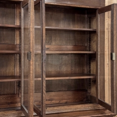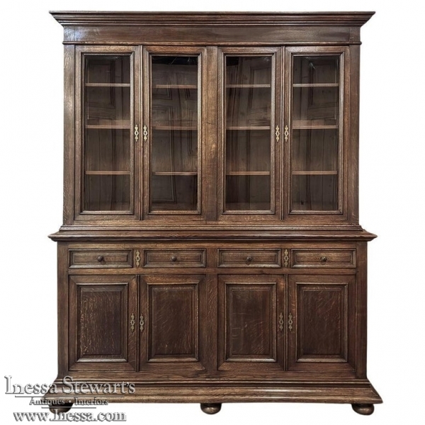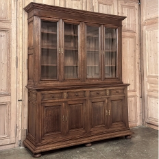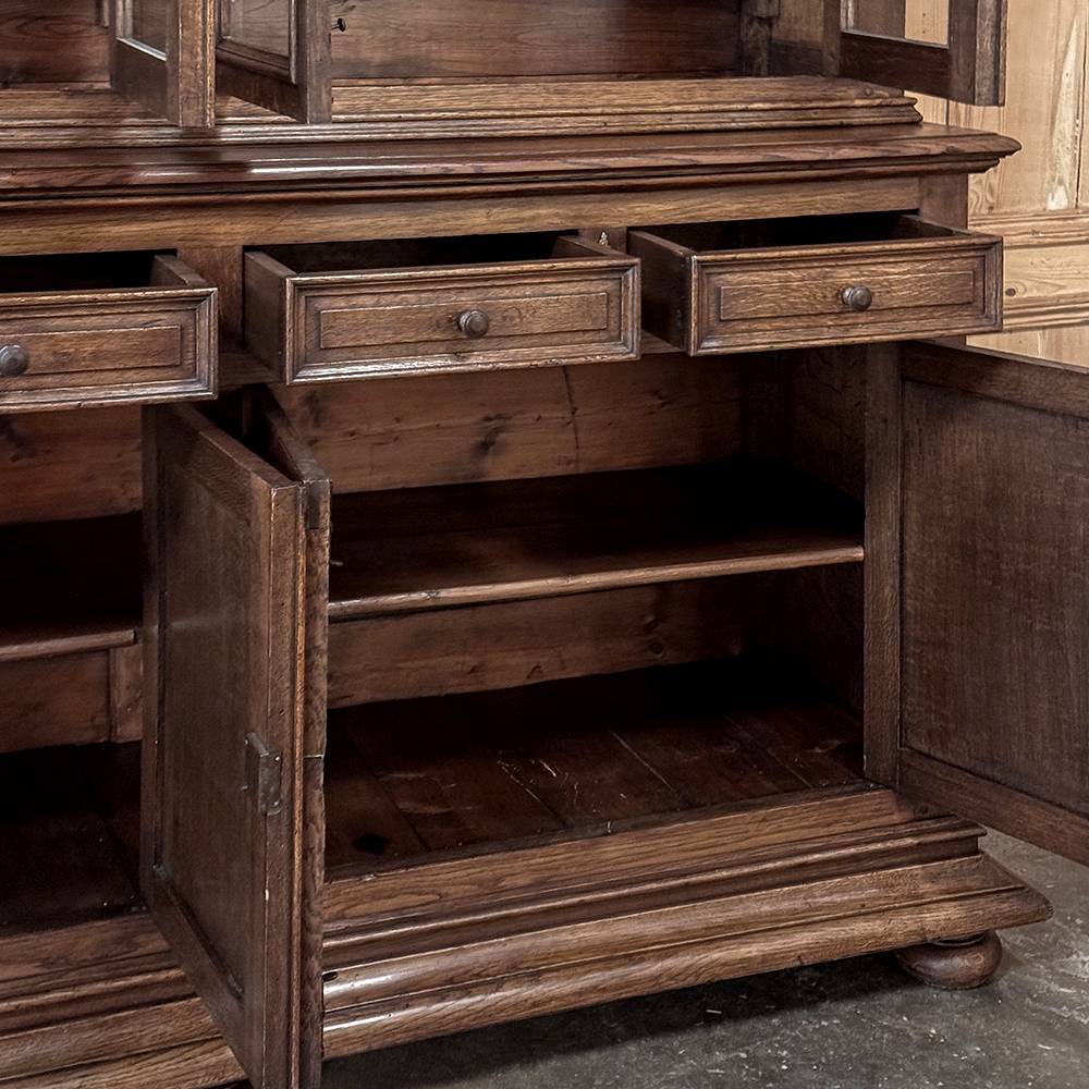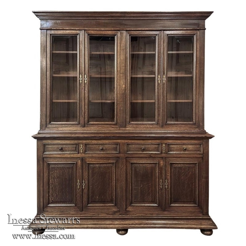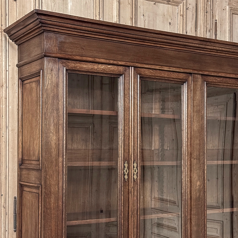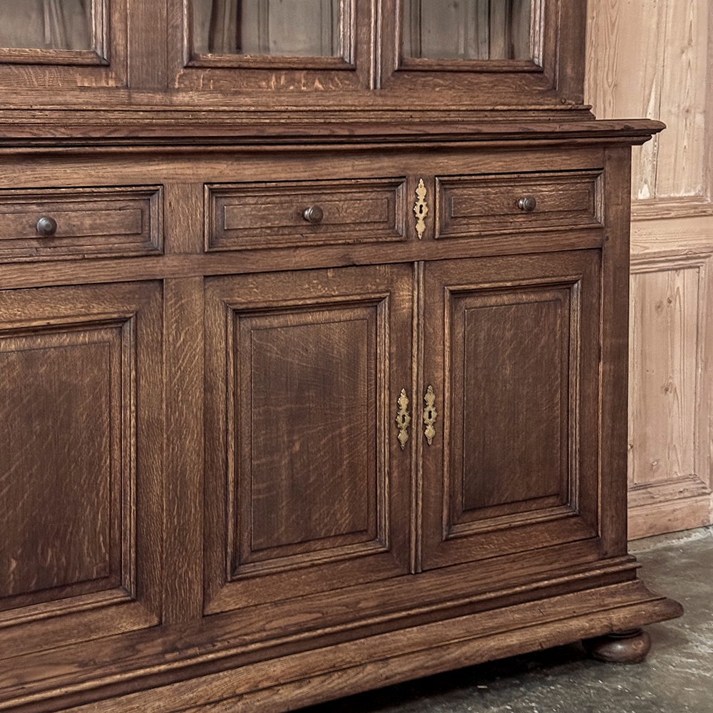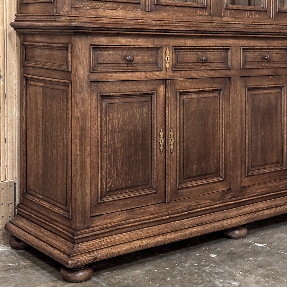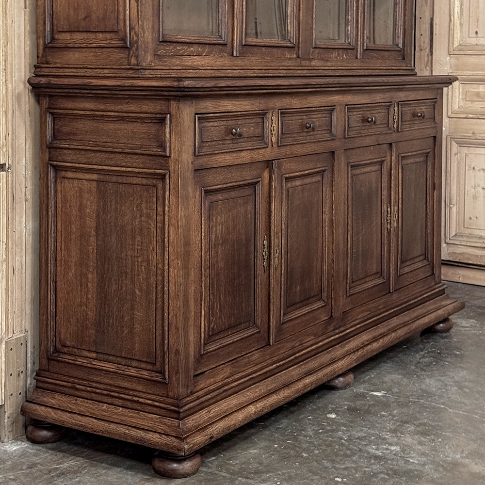 Grand 19th Century French Louis Philippe Bookcase ~ Bibliotheque was a product of talented craftsmen using traditional time-honored methods and the result of a tailored style that has proven to remain popular for what will be two centuries in just another couple of decades. Using dense, old-growth indigenous oak, the artisans created a strong crown over the upper tier, which consists of four glazed doors providing access to and a view of the interior, augmented by four adjustable shelves for a total of five display surfaces. The base below projects out a bit providing a convenient temporary work surface at 42 inches high, underneath appears four drawers and as many cabinets, all rendered in the same tailored, timeless style. When open, the piece has a cavernous storage capability. Bold base molding and bun feet provide support, while brass key guards and pulls complete the look.