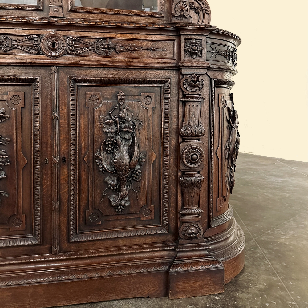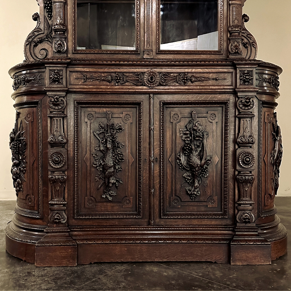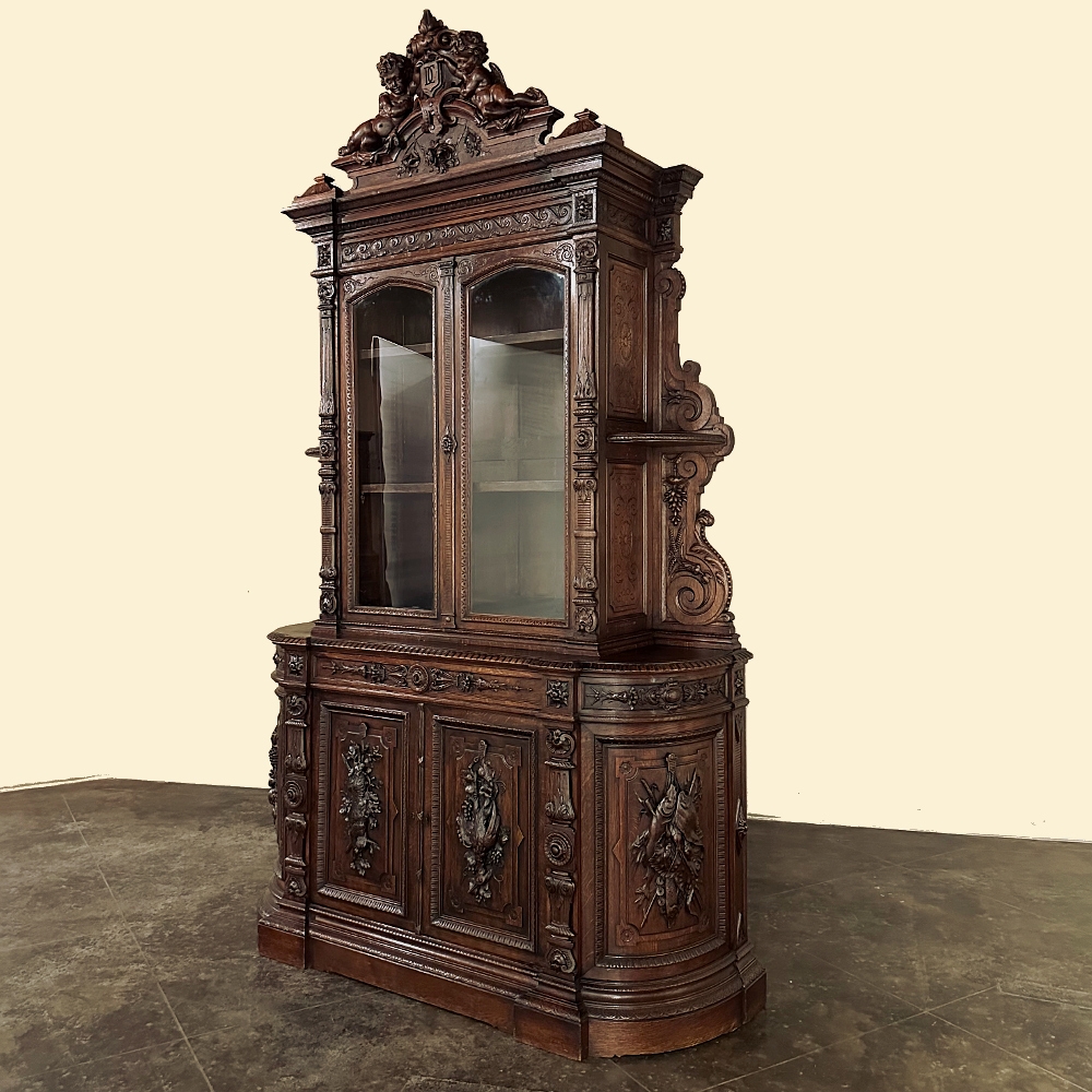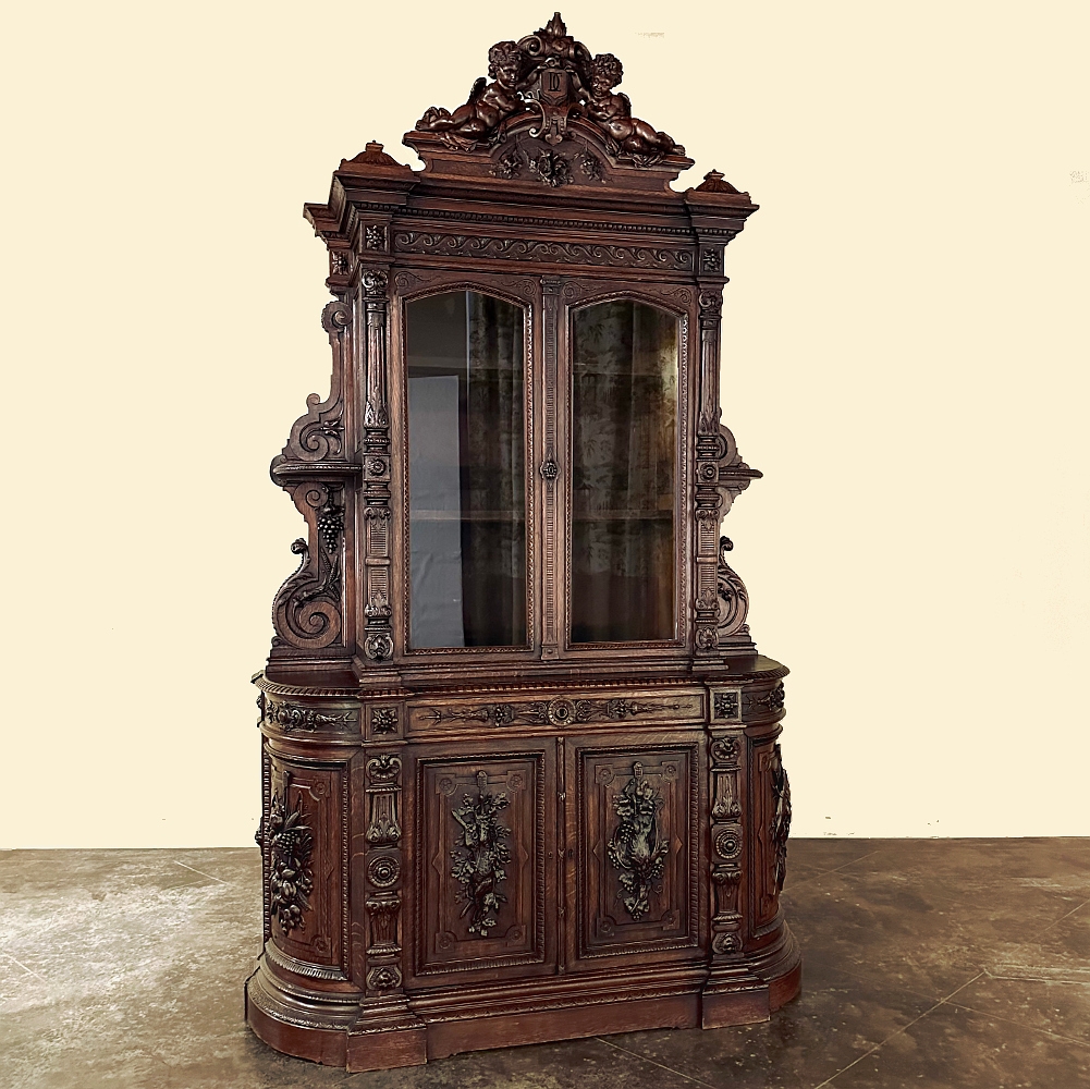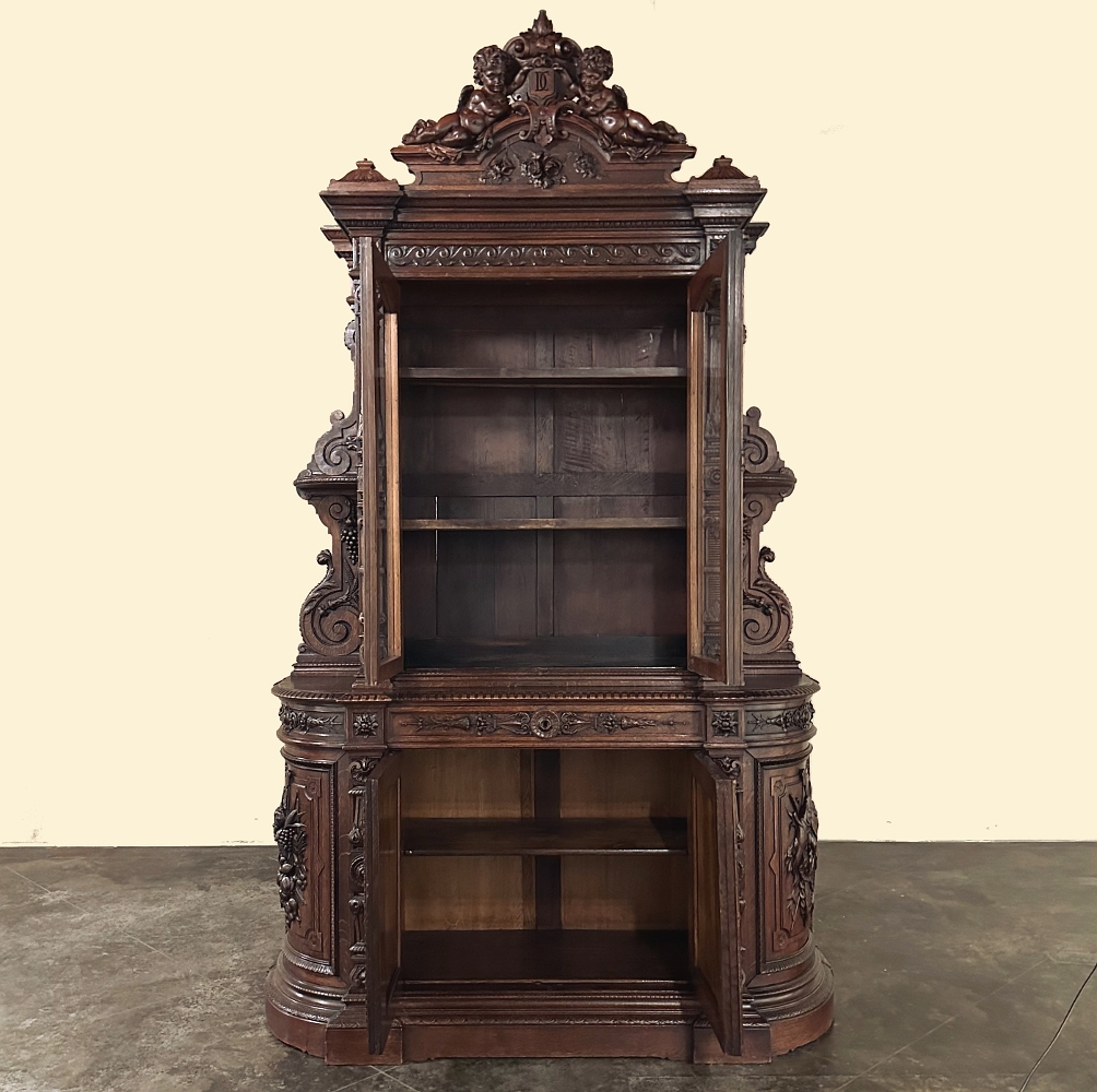 Grand 19th Century French Renaissance Revival Hunt Bookcase is a remarkable work of art, one that captivates the visual senses from the top of the crown to the base! Signed by the sculptor Benjamin Deguil, An artistic genius, he created this piece for a particular client whose initials 'DC' are carved into the medallion held by two lifelike cherubs, with the medallion itself set in a splendid heraldic crest. The crown adornment rests on an arched bonnet accented with floral garlands, transitioning into a meticulous molding detail which is a feature expanded upon throughout the design. A frieze of Greek wave creates a border between the crown and the upper glazed tier of the work, with generous glass affording a lovely view into the cabinet which has been fitted with adjustable shelves. Flanking the cabinet are two intricately carved columns, which frame the facade as well as the sides, which are incredible feats of sculpture in their own right, with intaglio panels, scrolled supports and relief carvings of wheat and grapes, classic French symbols of bread & wine, as well as signifying the Last Supper. The upper tier rests on a magnificent cabinet below that boasts an upper drawer tier with special carved detail all around, and rounded sides with four panels lavished with exquisite sculptures of successful fishing and hunting expeditions on the front, with amazing bounty-of-the-earth studies in bold relief on the rounded sides. Pilasters on the corners complement the aforementioned columns above, transitioning into a bold, multi-tiered base. The bottom cabinet doors open to provide surprising storage, an added bonus!