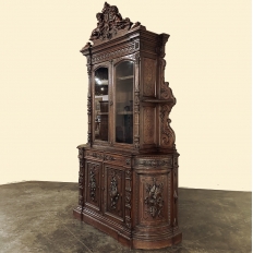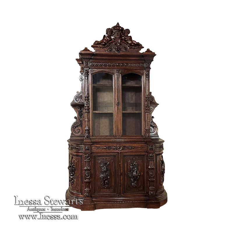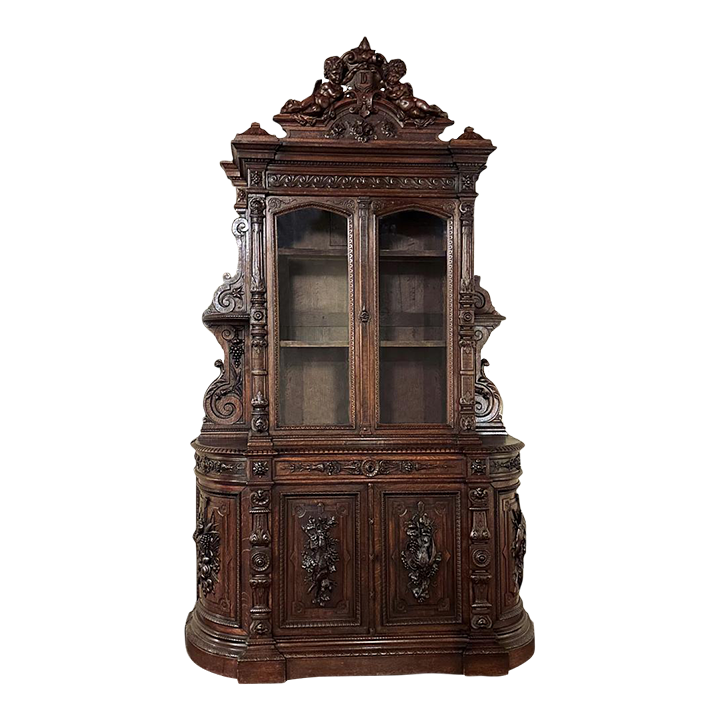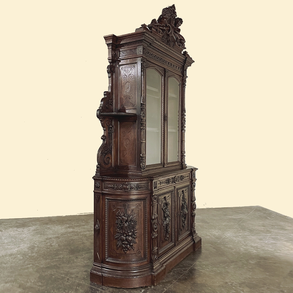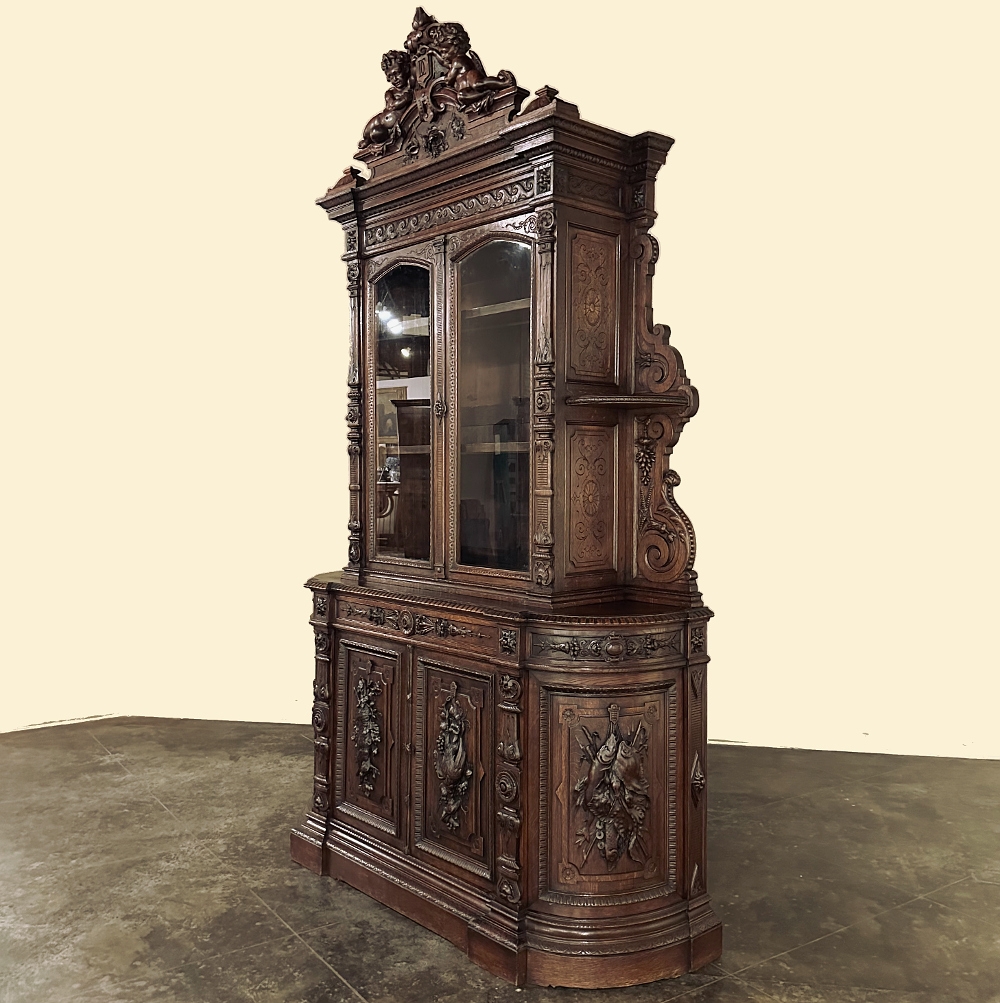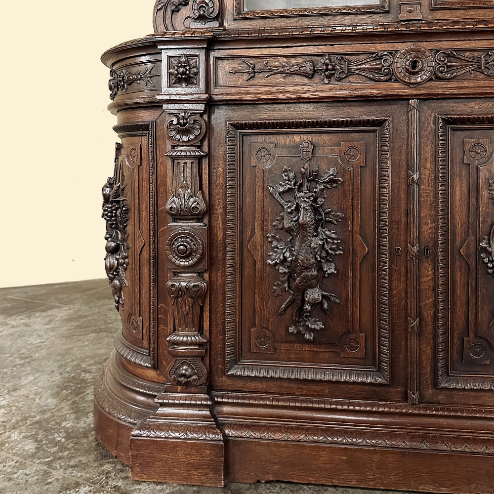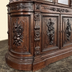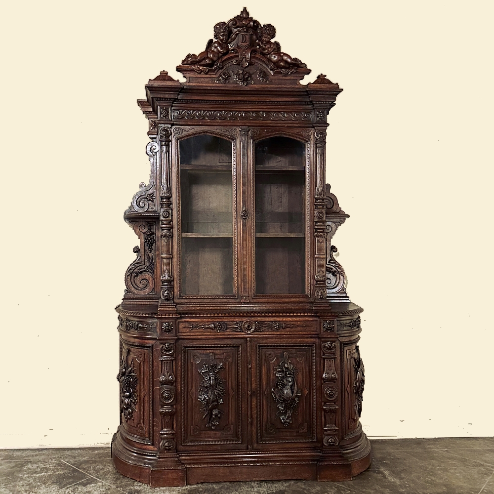 Grand 19th Century French Renaissance Revival Hunt Bookcase is a remarkable work of art, one that captivates the visual senses from the top of the crown to the base! Signed by the sculptor Benjamin Deguil, An artistic genius, he created this piece for a particular client whose initials 'DC' are carved into the medallion held by two lifelike cherubs, with the medallion itself set in a splendid heraldic crest. The crown adornment rests on an arched bonnet accented with floral garlands, transitioning into a meticulous molding detail which is a feature expanded upon throughout the design. A frieze of Greek wave creates a border between the crown and the upper glazed tier of the work, with generous glass affording a lovely view into the cabinet which has been fitted with adjustable shelves. Flanking the cabinet are two intricately carved columns, which frame the facade as well as the sides, which are incredible feats of sculpture in their own right, with intaglio panels, scrolled supports and relief carvings of wheat and grapes, classic French symbols of bread & wine, as well as signifying the Last Supper. The upper tier rests on a magnificent cabinet below that boasts an upper drawer tier with special carved detail all around, and rounded sides with four panels lavished with exquisite sculptures of successful fishing and hunting expeditions on the front, with amazing bounty-of-the-earth studies in bold relief on the rounded sides. Pilasters on the corners complement the aforementioned columns above, transitioning into a bold, multi-tiered base. The bottom cabinet doors open to provide surprising storage, an added bonus!