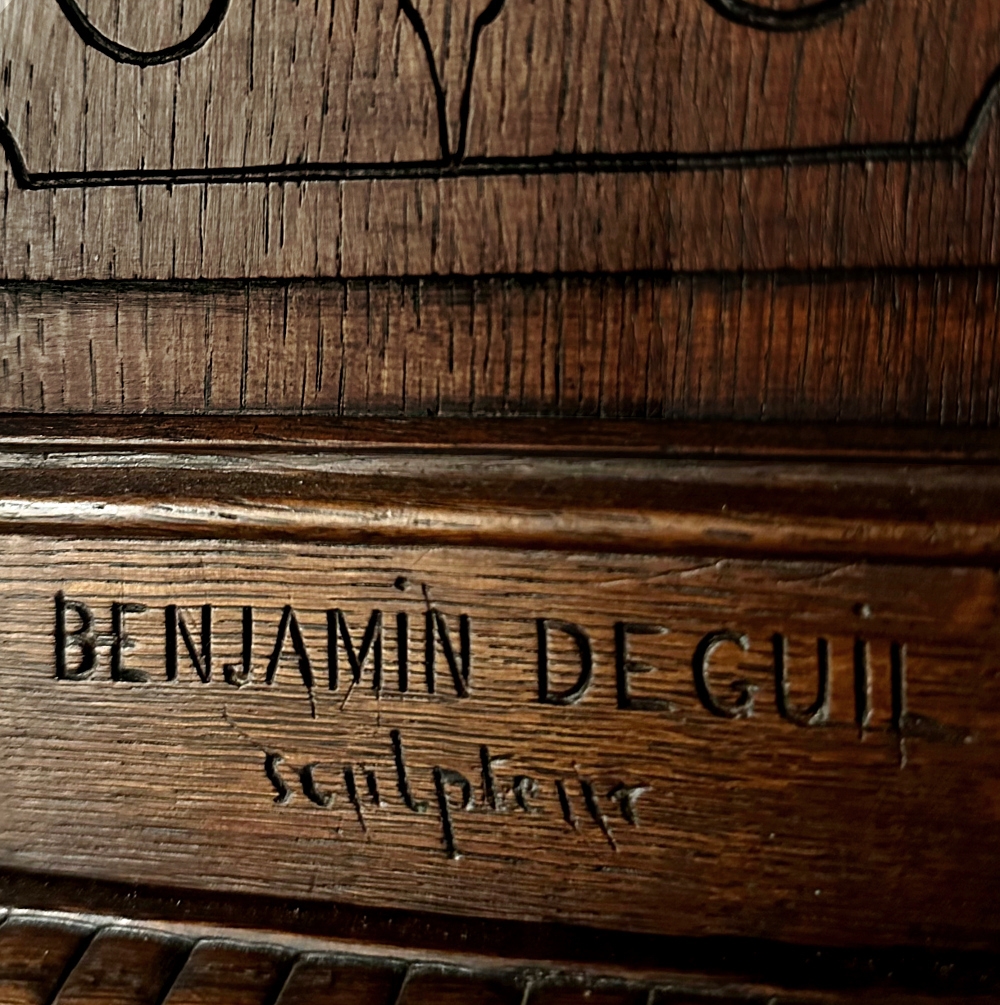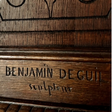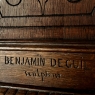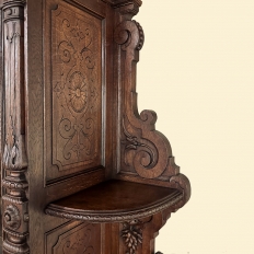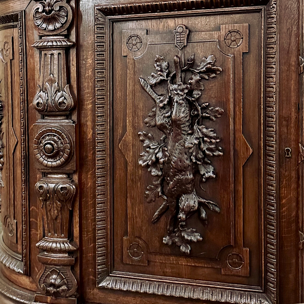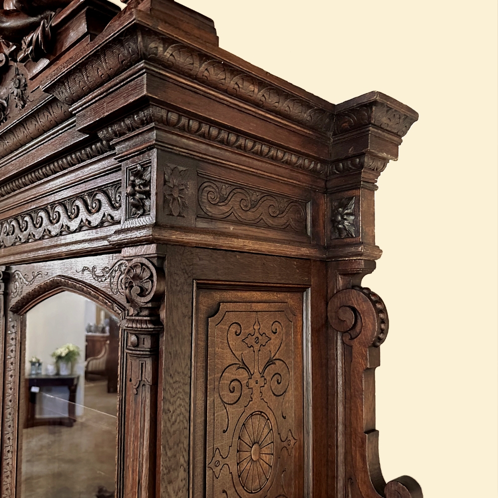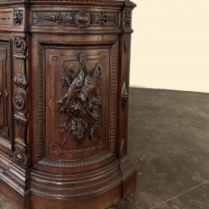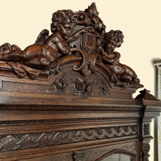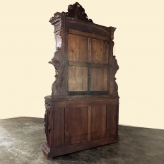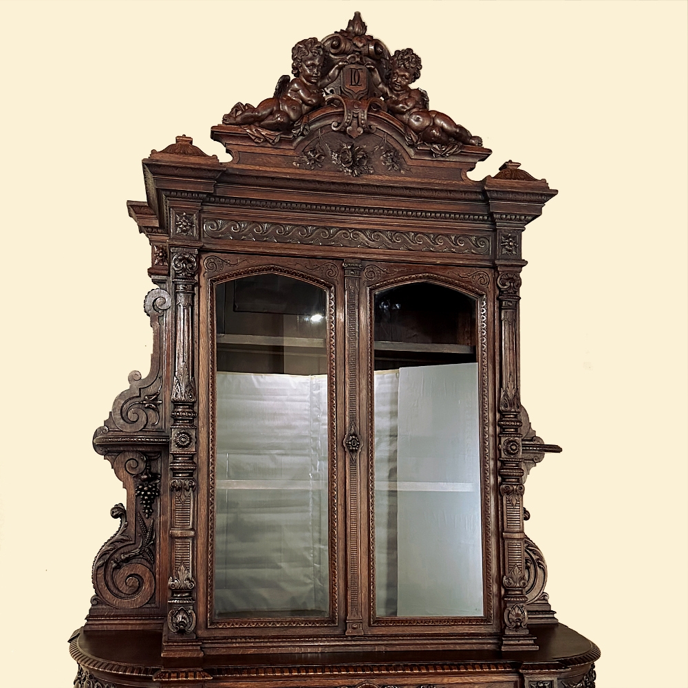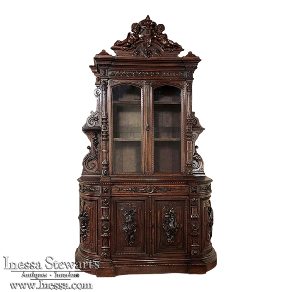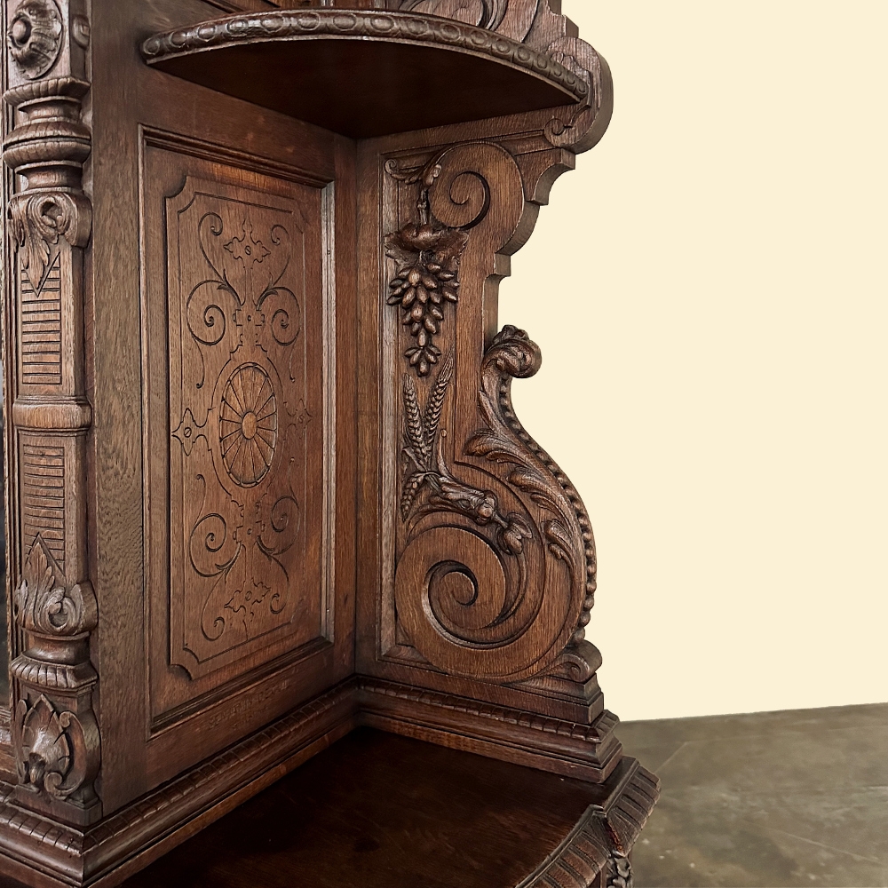 Grand 19th Century French Renaissance Revival Hunt Bookcase is a remarkable work of art, one that captivates the visual senses from the top of the crown to the base! Signed by the sculptor Benjamin Deguil, An artistic genius, he created this piece for a particular client whose initials 'DC' are carved into the medallion held by two lifelike cherubs, with the medallion itself set in a splendid heraldic crest. The crown adornment rests on an arched bonnet accented with floral garlands, transitioning into a meticulous molding detail which is a feature expanded upon throughout the design. A frieze of Greek wave creates a border between the crown and the upper glazed tier of the work, with generous glass affording a lovely view into the cabinet which has been fitted with adjustable shelves. Flanking the cabinet are two intricately carved columns, which frame the facade as well as the sides, which are incredible feats of sculpture in their own right, with intaglio panels, scrolled supports and relief carvings of wheat and grapes, classic French symbols of bread & wine, as well as signifying the Last Supper. The upper tier rests on a magnificent cabinet below that boasts an upper drawer tier with special carved detail all around, and rounded sides with four panels lavished with exquisite sculptures of successful fishing and hunting expeditions on the front, with amazing bounty-of-the-earth studies in bold relief on the rounded sides. Pilasters on the corners complement the aforementioned columns above, transitioning into a bold, multi-tiered base. The bottom cabinet doors open to provide surprising storage, an added bonus!