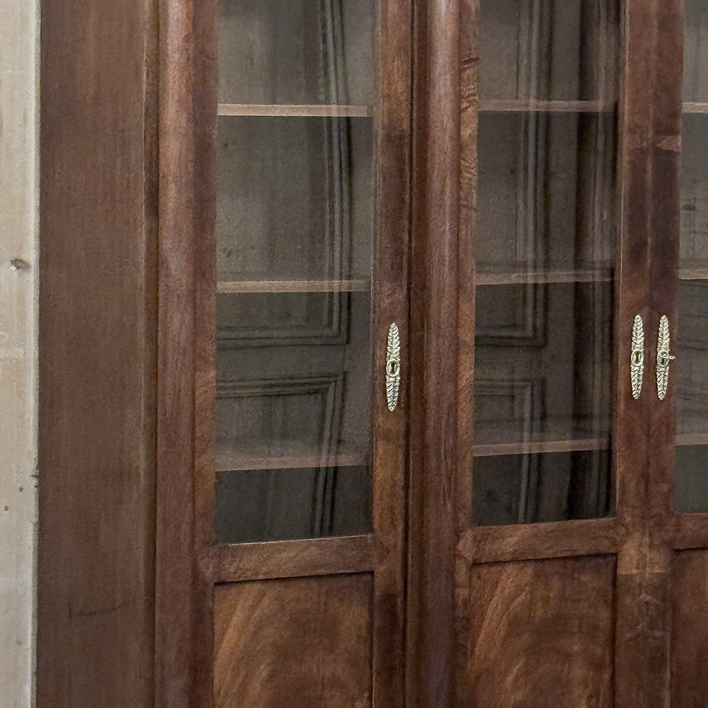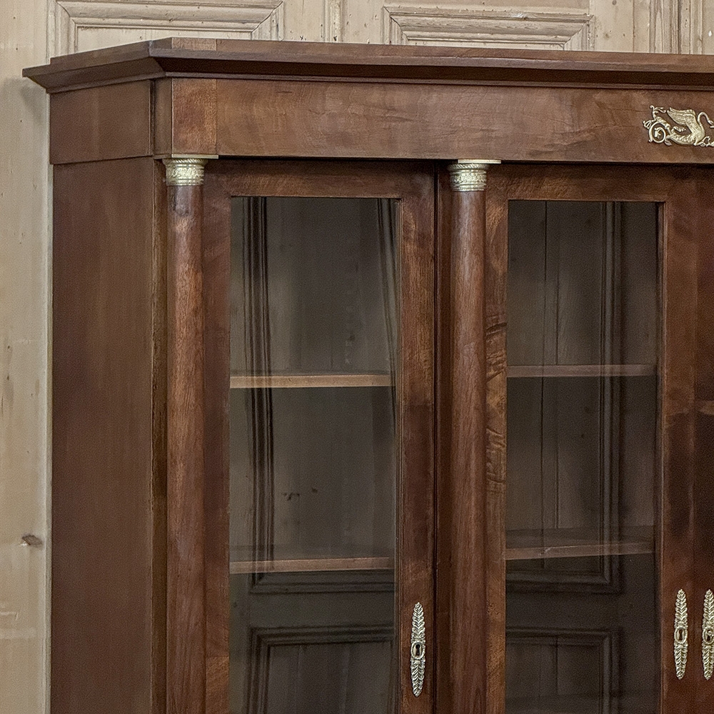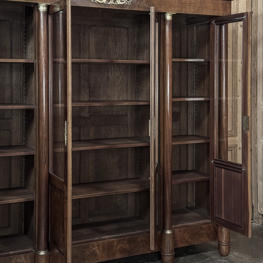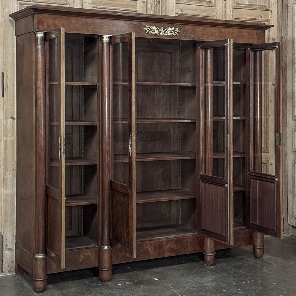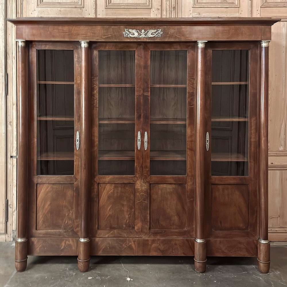 Grand 19th Century French Second Empire Mahogany Bookcase will make an immediate impression on all who enter the room! Hand-crafted by expert artisans during the reign of Napoleon III, it was created from exotic imported mahogany and includes four solid turned mahogany columns across the front, and flame mahogany panels on the four doors. The bold crown with classically-inspired molding detail is centered with a cast bronze mount depicting stylized swans drinking from an urn, surrounded by foliate detail. Cast bronze key guards, as well as capitals and base rings on the columns add visual excitement. Each door is also fitted with generous glass panes to display the contents. Such magnificent works were created as status symbols, as owning such a bibliotheque also meant one had the means to afford an education and the books housed within, considerable expenses during the mid-1800s,