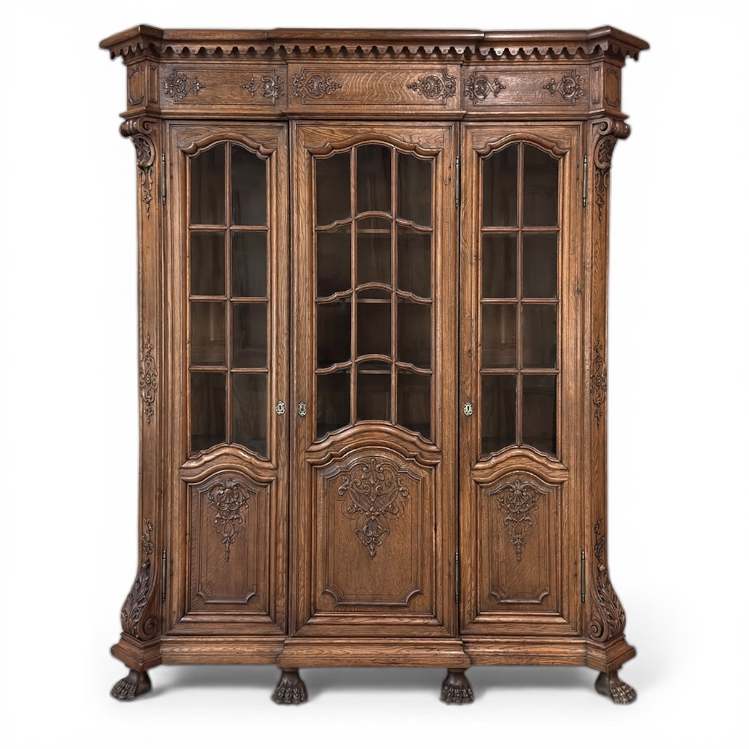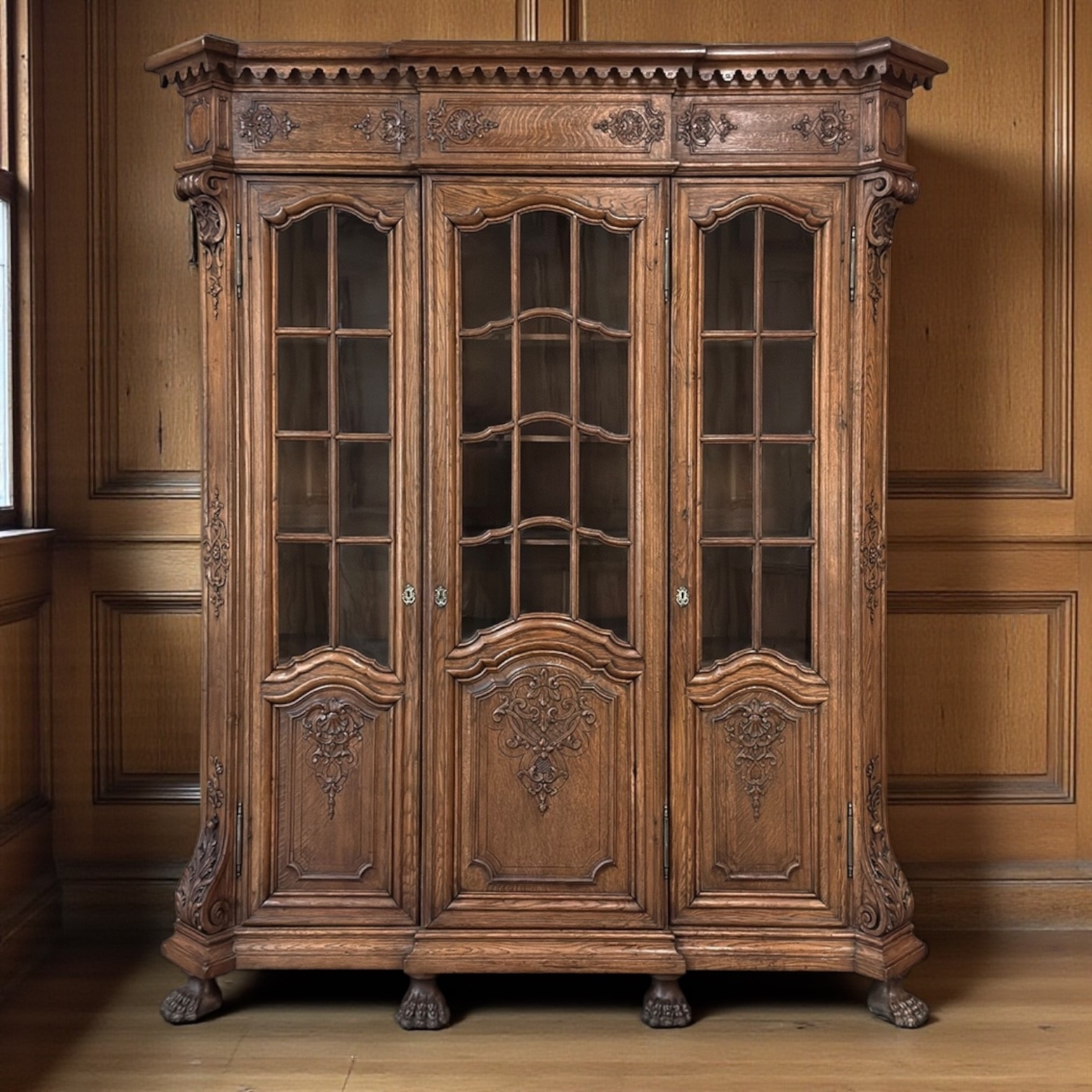 The doors retain their hand-rolled glass, gently luminous and softly textured, offering a refined view into the generous shelving within. Solid oak panels are carved in rich relief with acanthus leaves unfurling across scroll pediments, each contour shaped with precision and care. The base rests upon powerful claw feet that anchor the composition with assurance and balance.