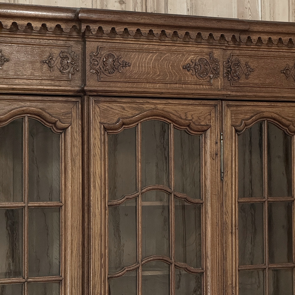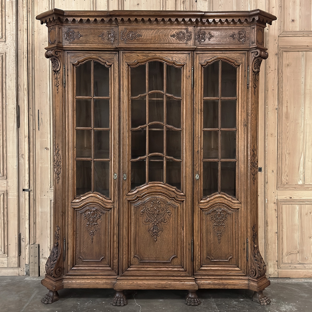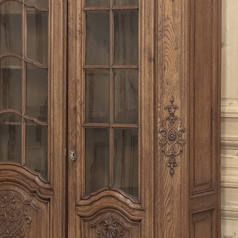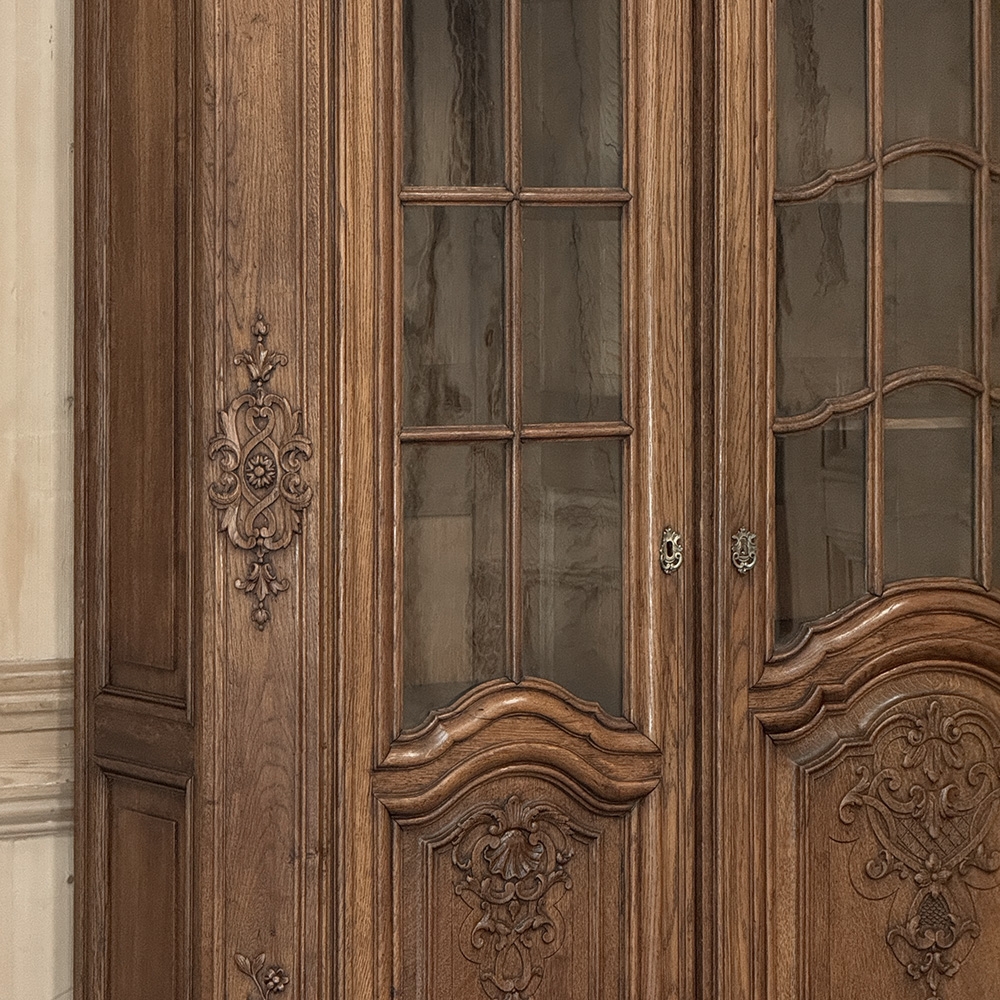 Late 19th Century Belgian Liégeoise Louis XIV Bookcase in Solid Quarter-Sawn Oak was discovered in a château in the French-speaking region of Liège, this extraordinary bookcase embodies the richness and refinement of the Louis XIV spirit as it evolved from the grandeur of Louis XIV. In the late nineteenth century, Belgian ateliers looked back to that early eighteenth-century moment when ornament gained grace and movement, and they carved oak with a confidence that feels both noble and expressive.