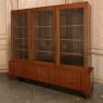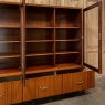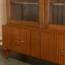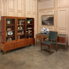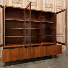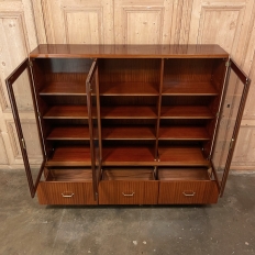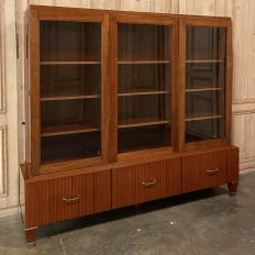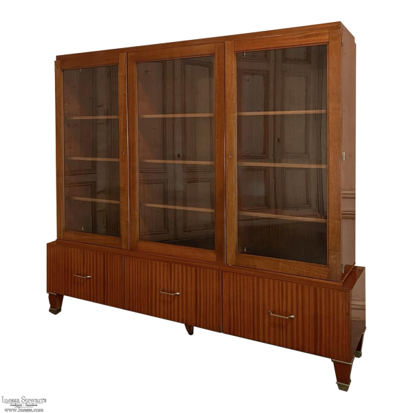 Mid-Century Mahogany Bookcase by De Coene of Courtrai is an exceptional choice to create a one-of-a-kind look for your office! Using sapele mahogany veneering as the primary source of visual appeal, the artisans of De Coene created a modernistic framework with strong use of angular design. With its multiple original shelves, the bookcase features three glazed doors and three capacious file drawers with brass pulls. Brass tips on the legs with brass collars on the legs add a nice touch. Perfect for creating a clean, uncluttered look that will remain in vogue for decades to come!