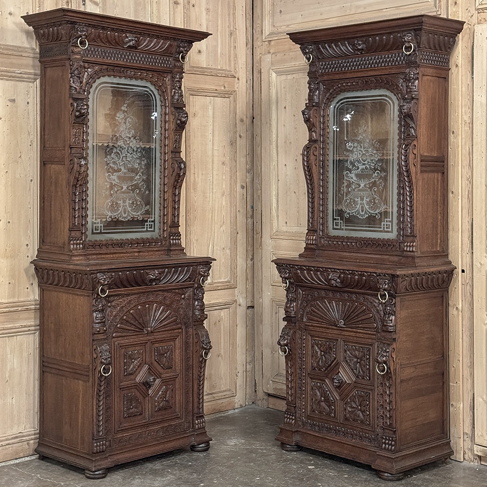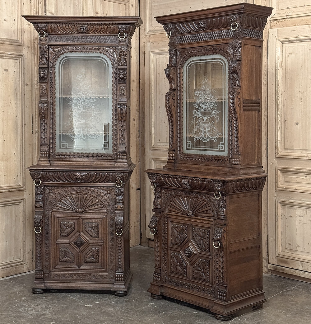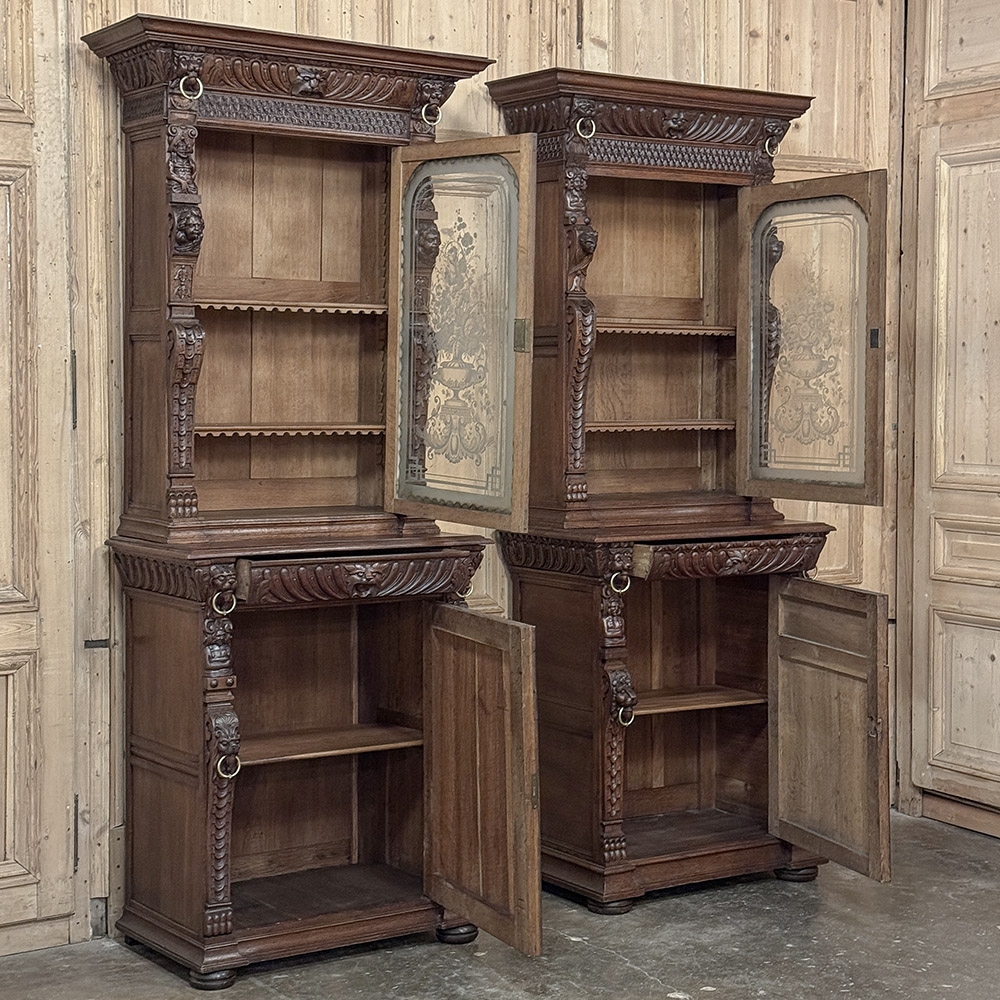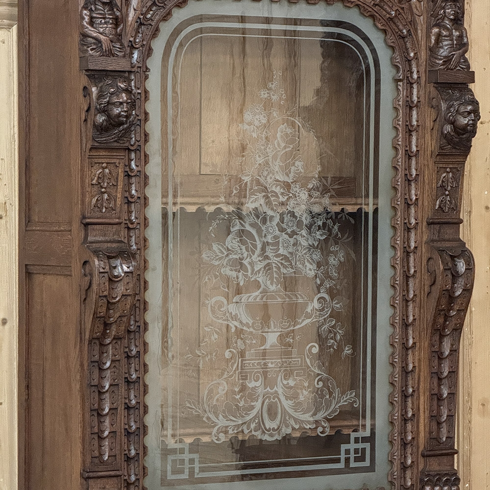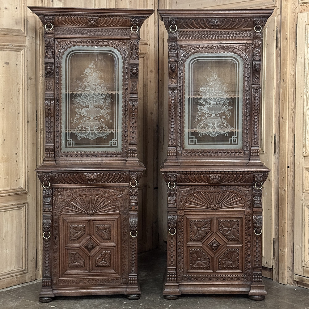 Pair 19th Century Flemish Bookcases with Etched Glass will make a perfectly symmetrical style statement for your favorite room! Crafted by master artisans from indigenous old-growth oak, each features a prominent upper tier fitted with etched glass depicting a Romanesque urn bursting with flowers and foliage surrounded by an intricate framework with rounded upper corners. The backdrop for the glass are amazing crown moldings, exquisitely carved pilasters above and below serving as corner posts, elaborate and meticulously carved lower cabinet door panels, and a flared center section that is beautifully carved and fitted with a drawer centered with a lion's head serving as the drawer pull. The design is narrow enough to fit in niches next to a fireplace, cozy corners, or flanking windows ~ pretty much anywhere you need them. Two adjustable shelves with face trim and one shelf below in each cabinet ensure you can display and store to your heart's content.