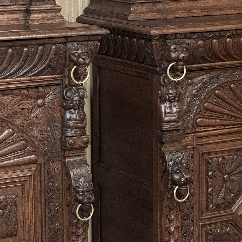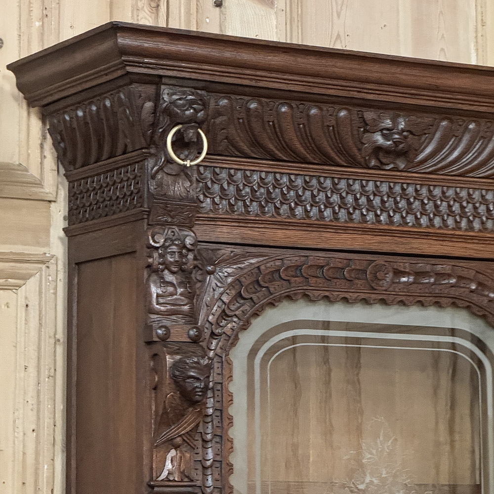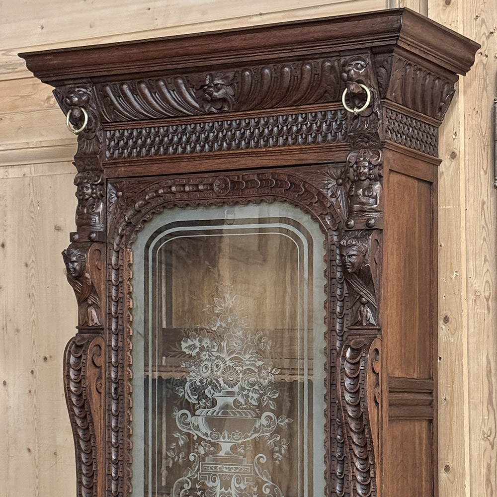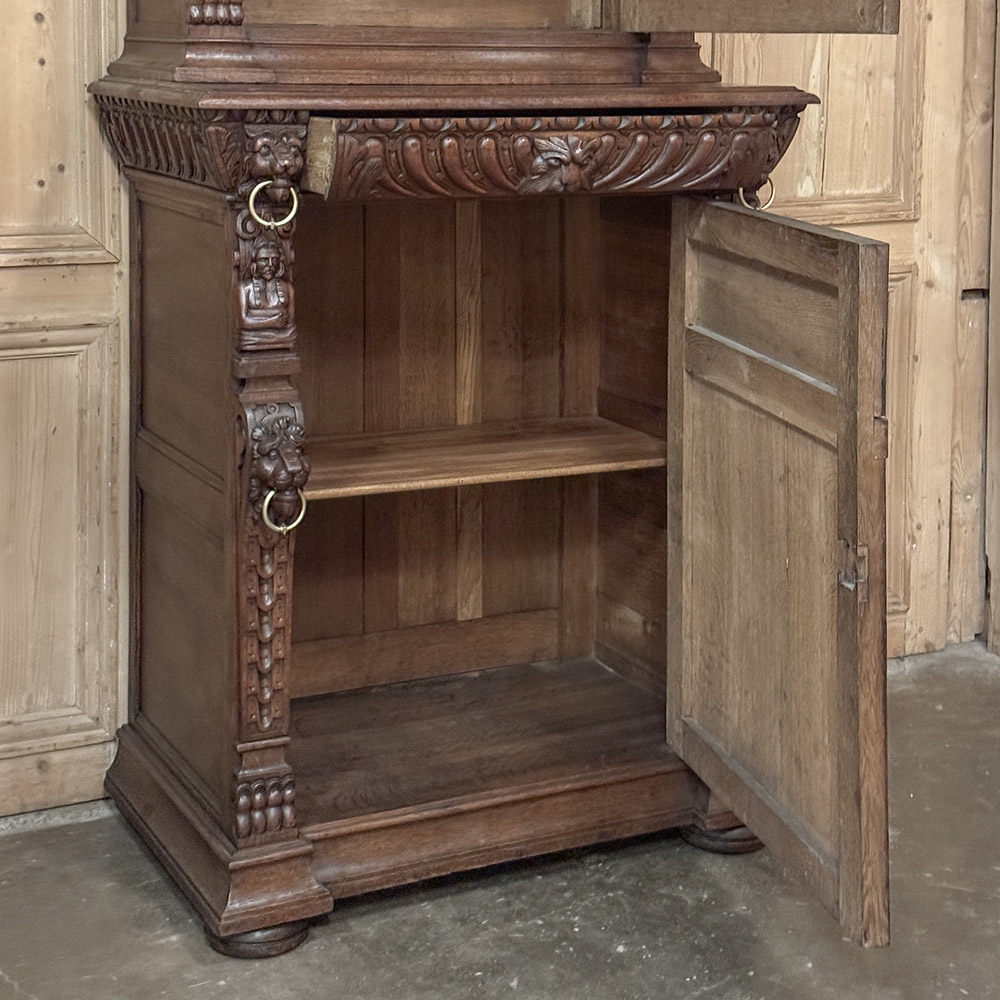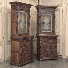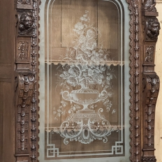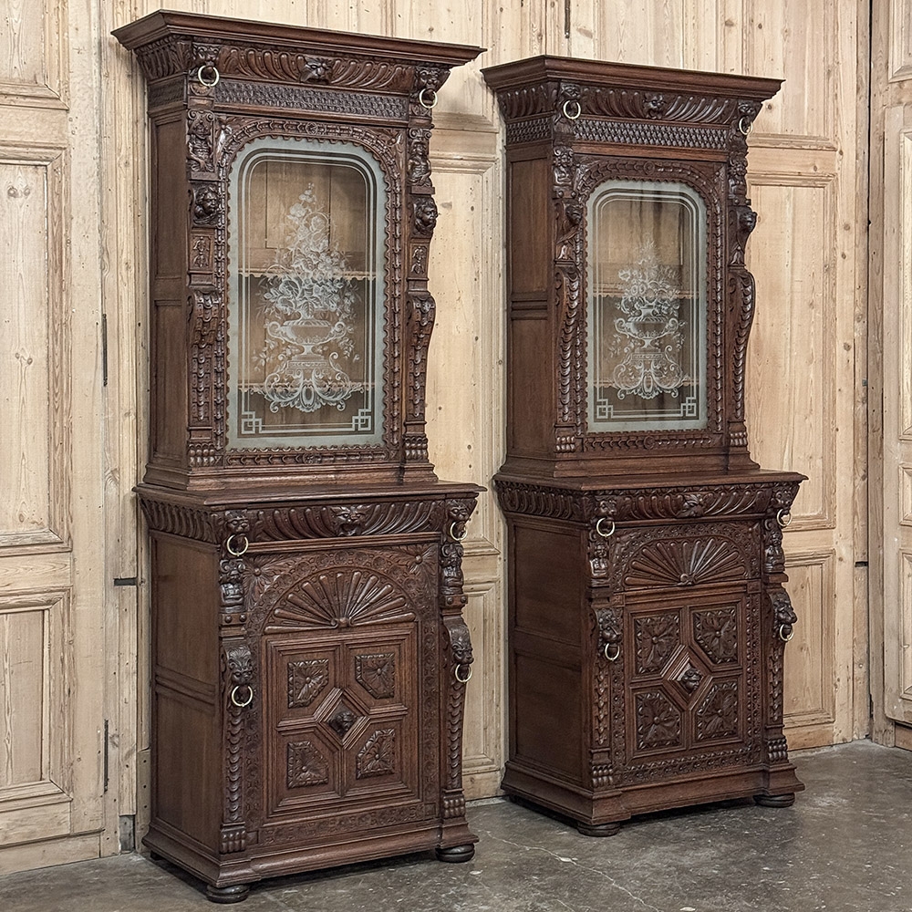 Pair 19th Century Flemish Bookcases with Etched Glass will make a perfectly symmetrical style statement for your favorite room! Crafted by master artisans from indigenous old-growth oak, each features a prominent upper tier fitted with etched glass depicting a Romanesque urn bursting with flowers and foliage surrounded by an intricate framework with rounded upper corners. The backdrop for the glass are amazing crown moldings, exquisitely carved pilasters above and below serving as corner posts, elaborate and meticulously carved lower cabinet door panels, and a flared center section that is beautifully carved and fitted with a drawer centered with a lion's head serving as the drawer pull. The design is narrow enough to fit in niches next to a fireplace, cozy corners, or flanking windows ~ pretty much anywhere you need them. Two adjustable shelves with face trim and one shelf below in each cabinet ensure you can display and store to your heart's content.