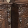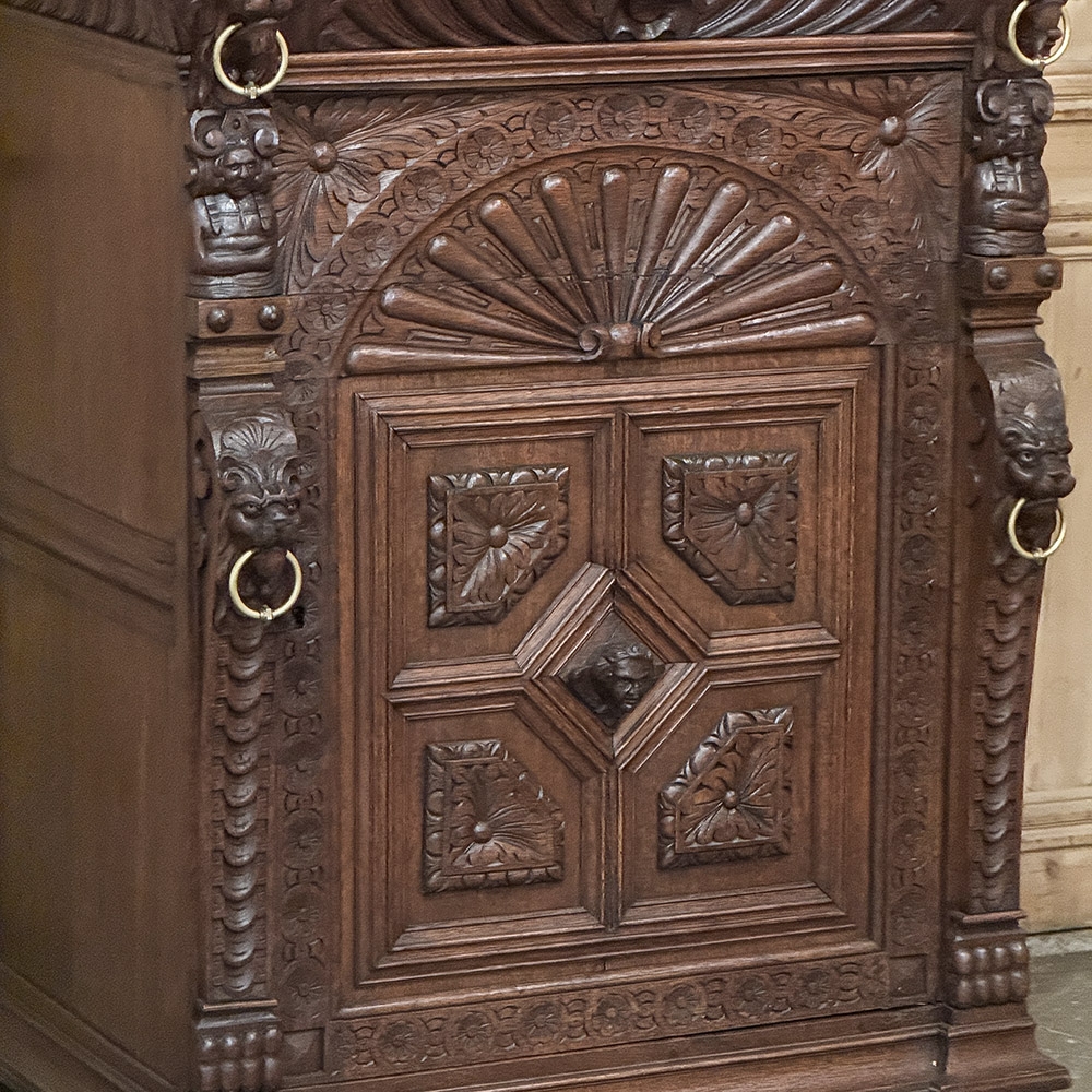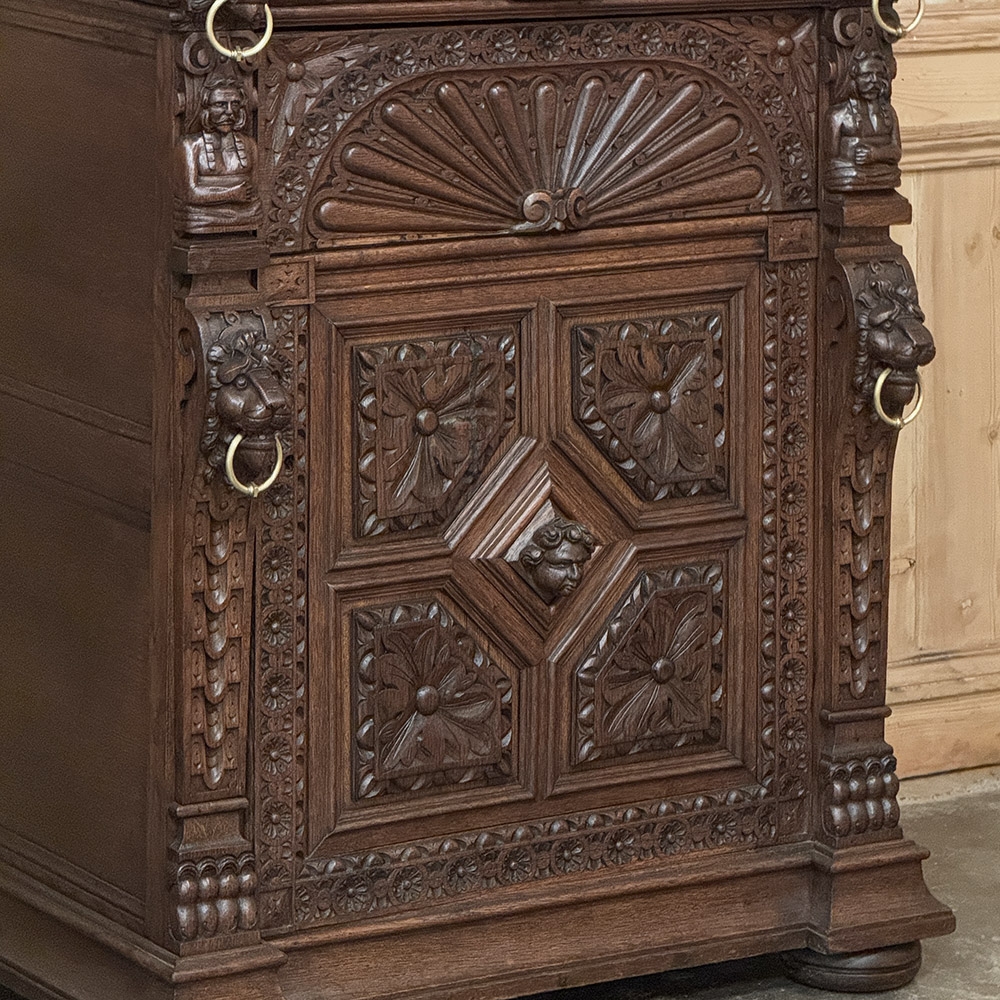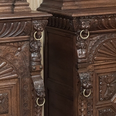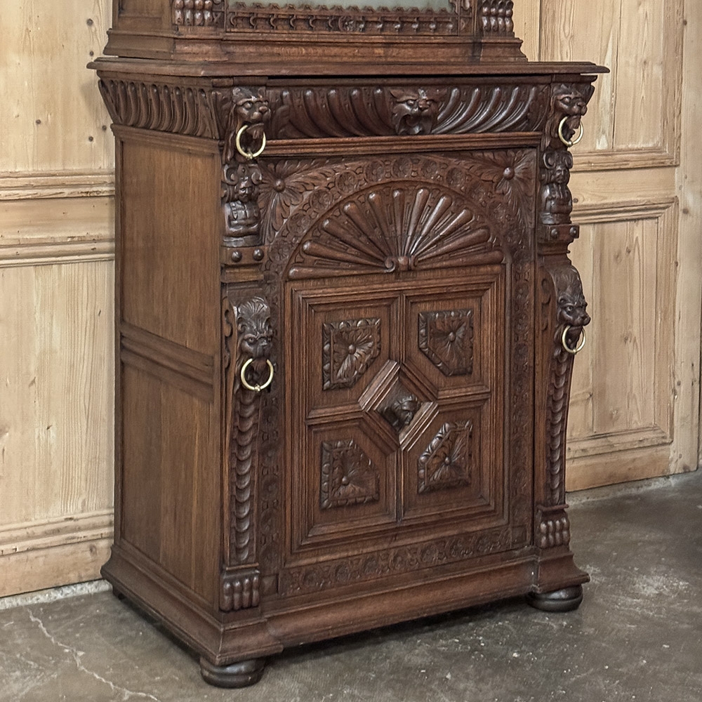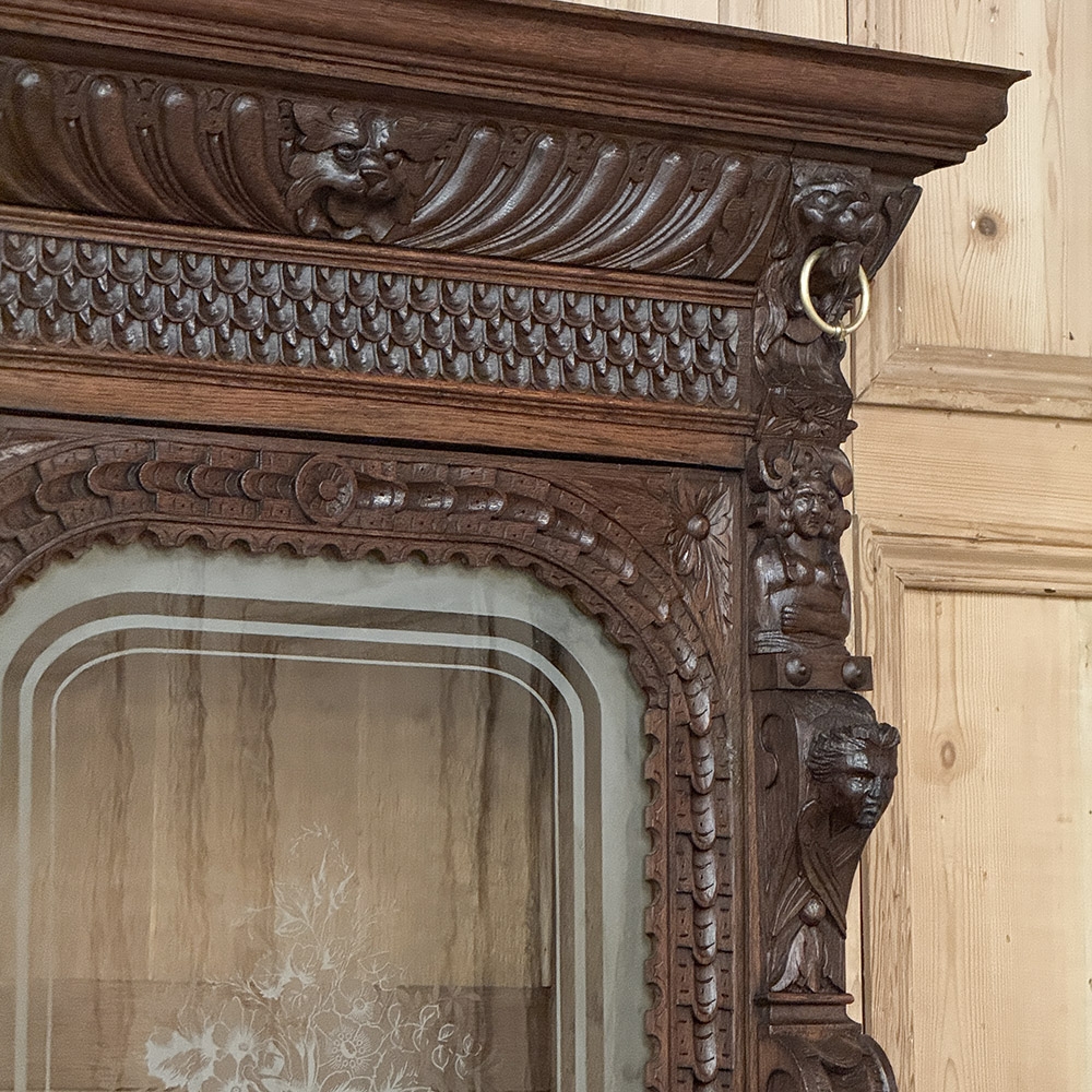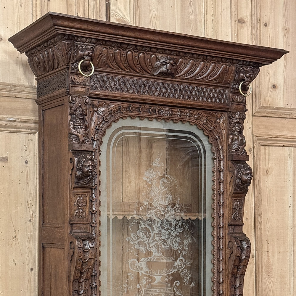Pair 19th Century Flemish Bookcases with Etched Glass will make a perfectly symmetrical style statement for your favorite room! Crafted by master artisans from indigenous old-growth oak, each features a prominent upper tier fitted with etched glass depicting a Romanesque urn bursting with flowers and foliage surrounded by an intricate framework with rounded upper corners. The backdrop for the glass are amazing crown moldings, exquisitely carved pilasters above and below serving as corner posts, elaborate and meticulously carved lower cabinet door panels, and a flared center section that is beautifully carved and fitted with a drawer centered with a lion's head serving as the drawer pull. The design is narrow enough to fit in niches next to a fireplace, cozy corners, or flanking windows ~ pretty much anywhere you need them. Two adjustable shelves with face trim and one shelf below in each cabinet ensure you can display and store to your heart's content.